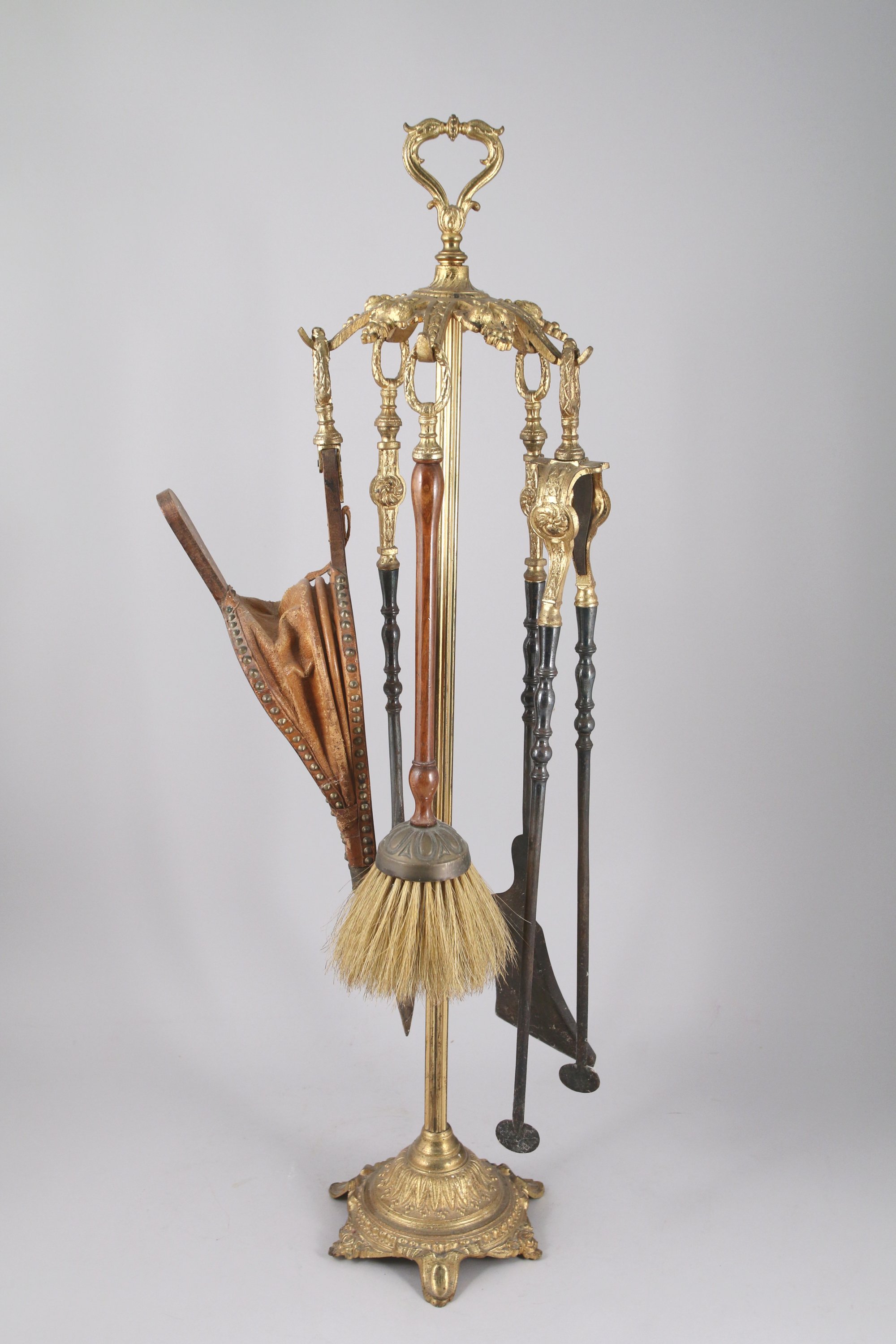 en bronze doré à décor feuillagé, prise figurant deux oiseaux affrontés. Il se compose d'une PELLE, d'une PINCE, d'une BALAYETTE et d'un TISONNIER.