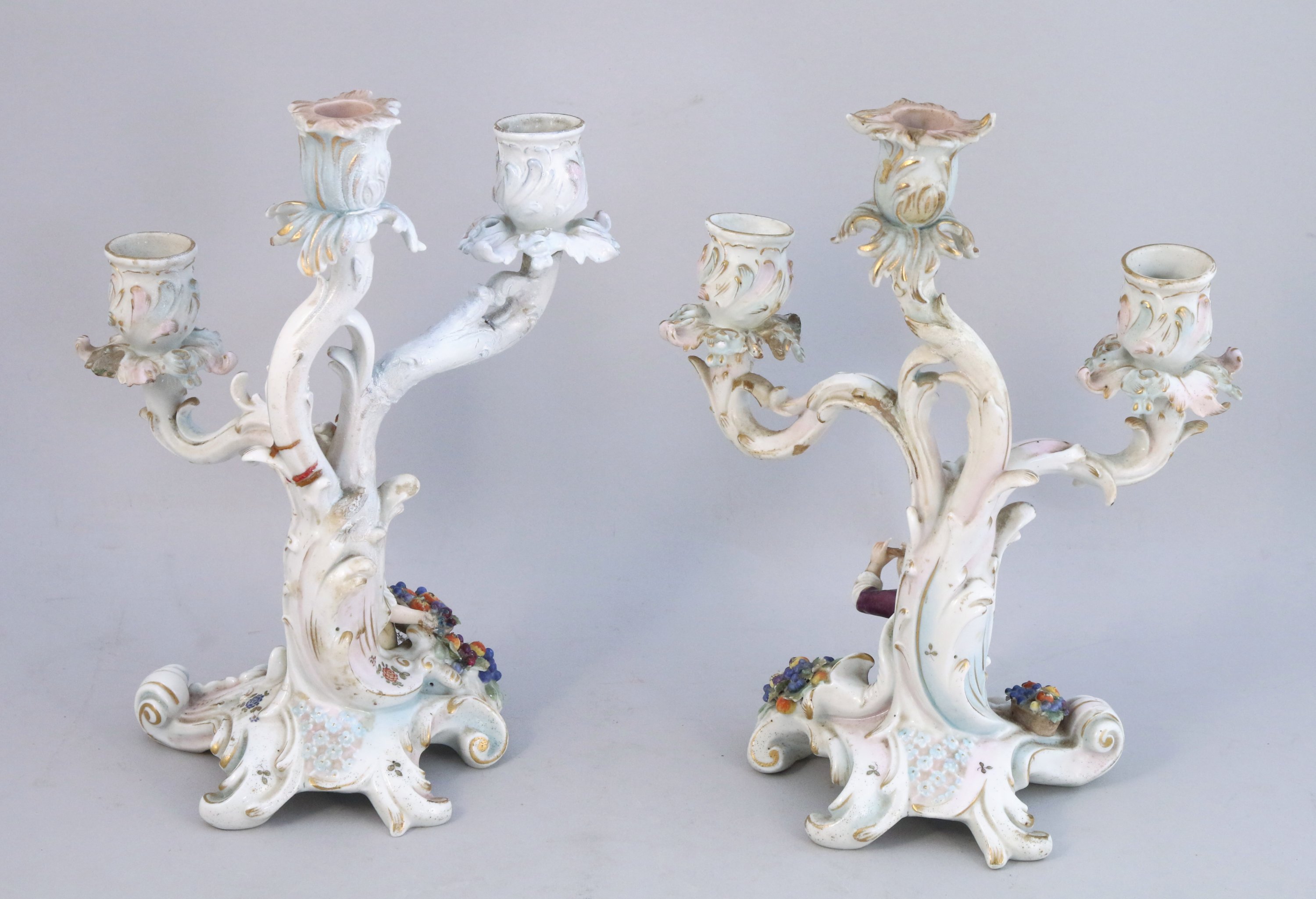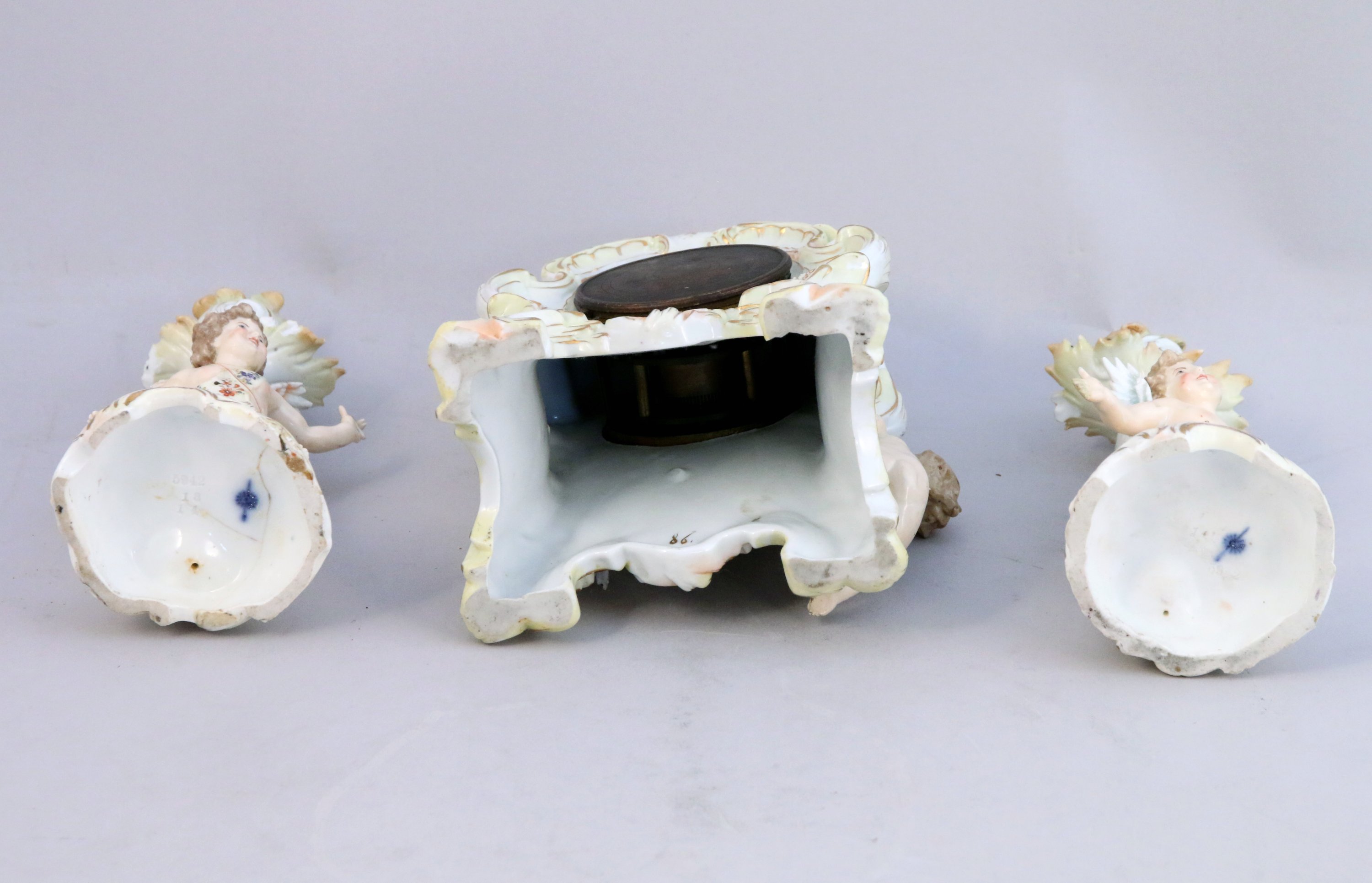 comprenant une HORLOGE (Haut. 20 cm) et deux CHANDELIERS (Haut 19 cm) à la quelle on joint une paire de FLAMBEAUX en porcelaine à trois feux figurant un couple d'enfants amoureux (Haut. 27 cm.)