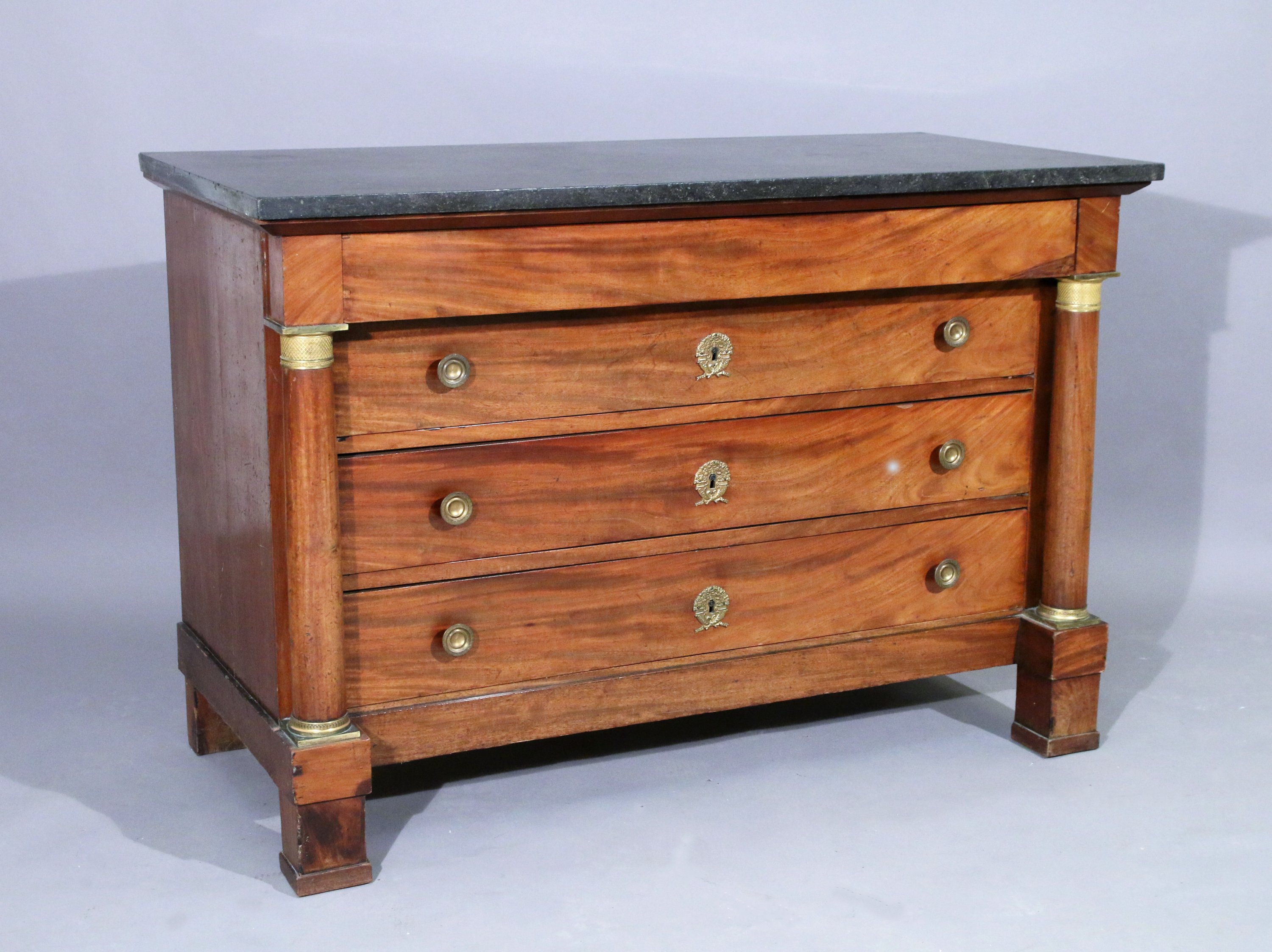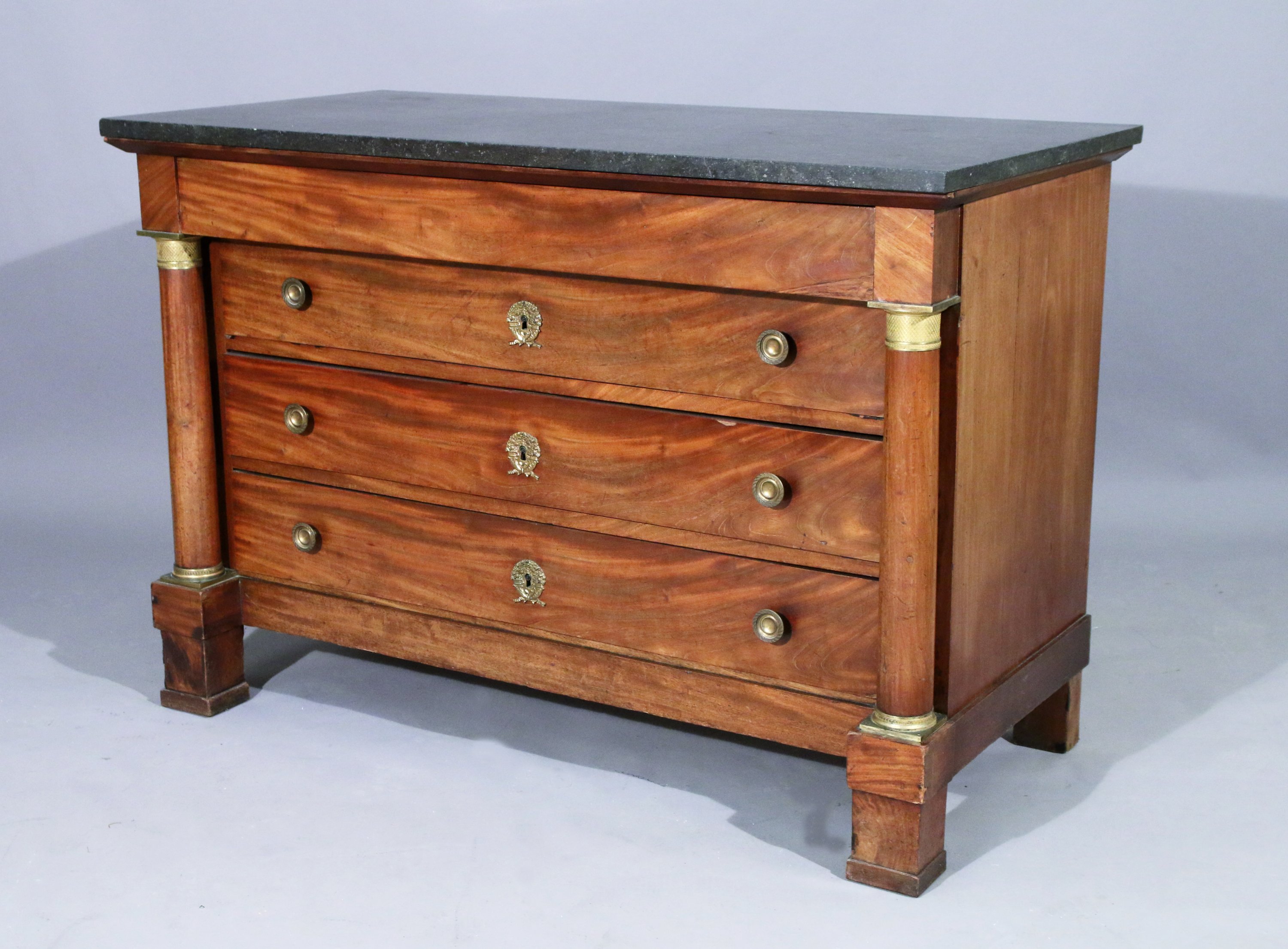 en acajou et placage, flanquée de deux colonne détachées aux chapitaux en bronze doré, elle ouvre par quatre tiroirs dont un dissimulé. Le meuble repose sur une plinthe. Poignées et entrées de serrures aux cornes d'abondances en bronze doré.