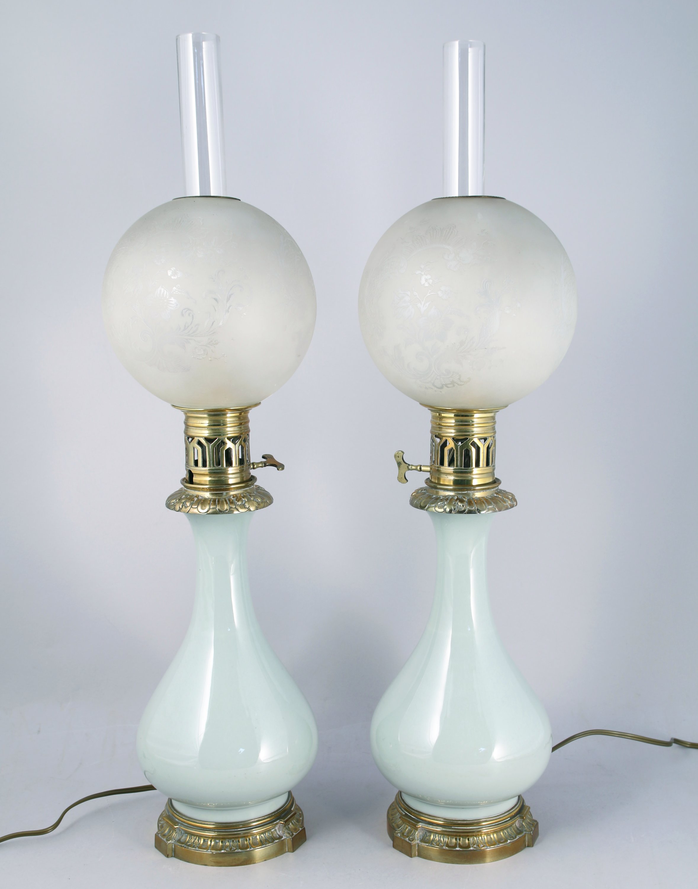 en faïence céladon, laiton doré et verre. Le corps est en forme de vase chinois en faïence vert céladon, monté sur un socle en laiton doré et couronné par un système d'allumage à décor de godrons et d'acanthe. Le tout est surmonté d'un globe en verre sablé à décor rocaille feuillagé, tenu par une cheminée de verre.