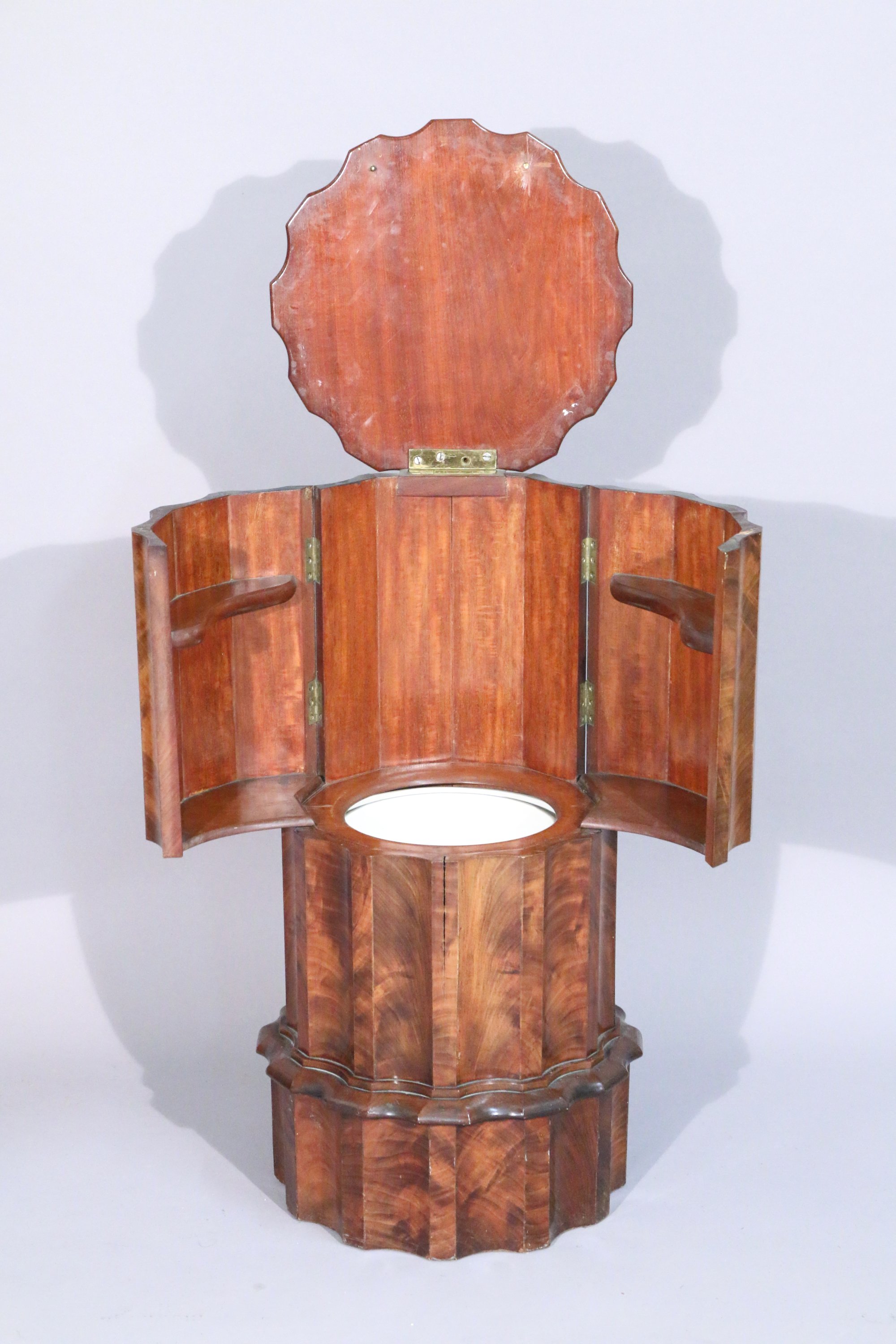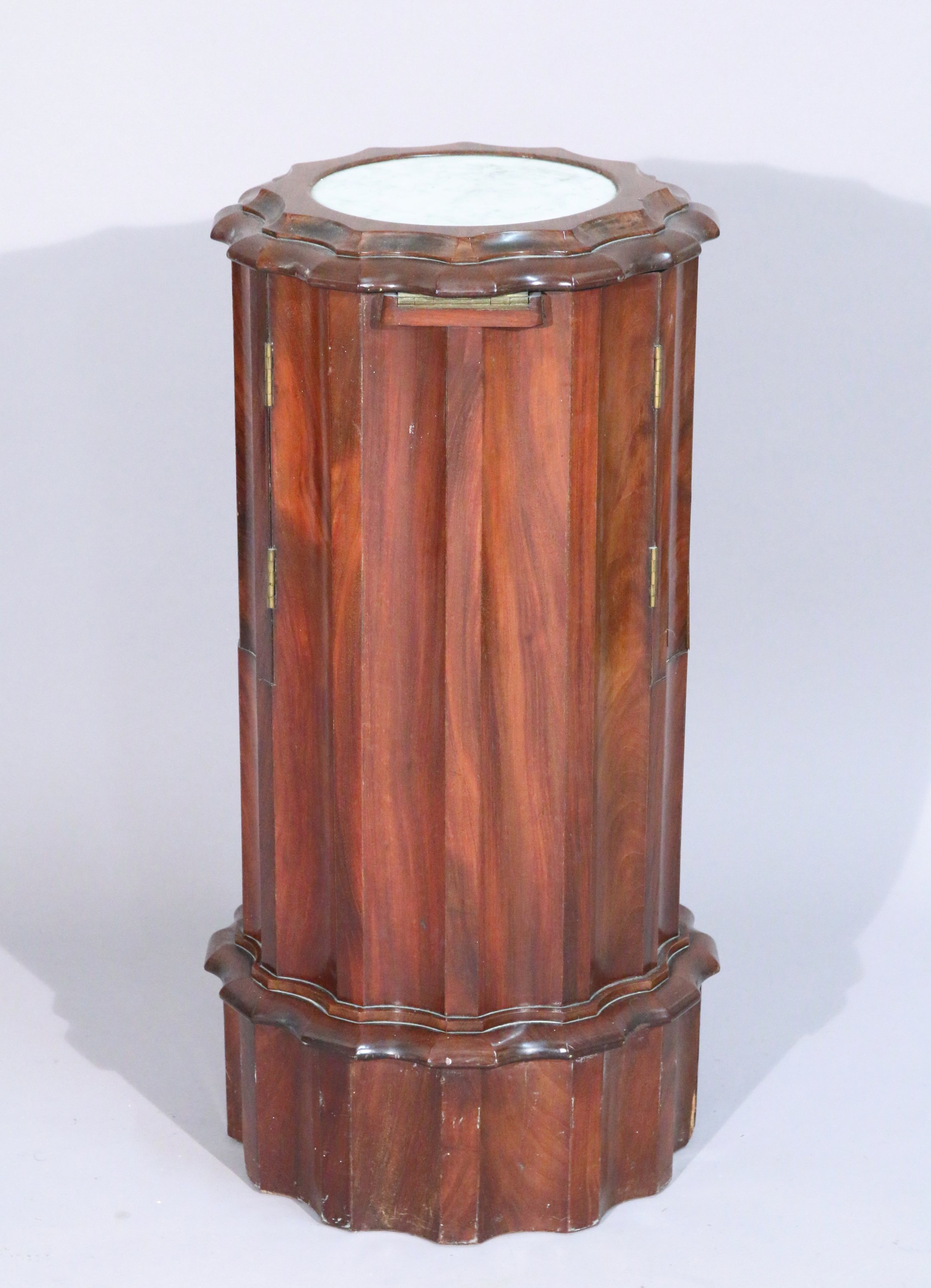 en placage à douze pans incurvés. Le plateau et deux portes s'ouvrant et dévoilant des étagères. Le plateau garni d'un marbre blanc.