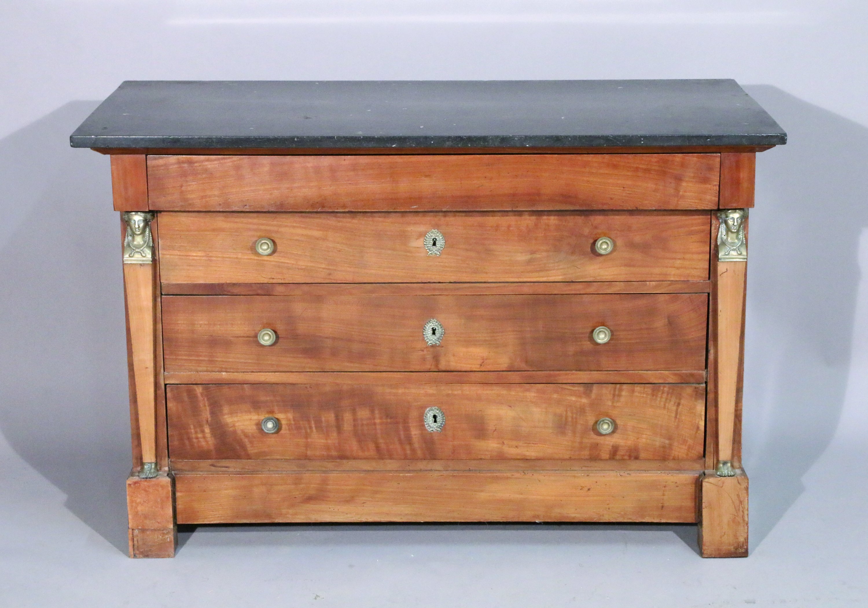 en placage d'acajou. Ouvrant par quatre tiroirs, ils sont flanqués de gaines ornés de figures féminines et de pieds de bronze doré. Le meuble repose sur des pieds parallélépipédiques.