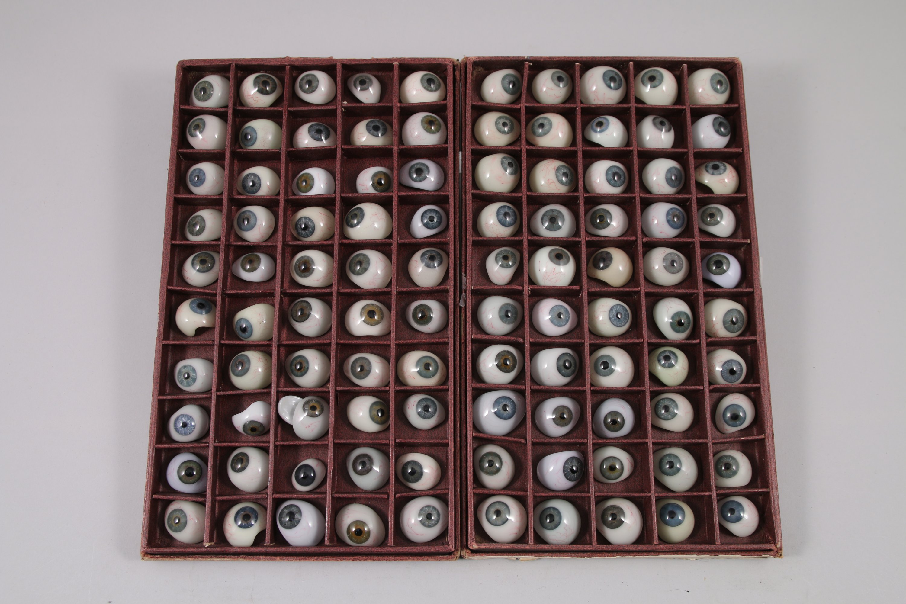 Environ une centaine de GLOBES OCULAIRES, simple ou double coque, dans un ou plusieurs coffrets gainés de chagrin. Les globes en verre teinté de différentes tailles, nuances de couleurs aux petits vaisseaux sanguins peints sur la conjonctive reproduisent l'iris grâce à des pigments de toutes teintes. Les formes des prothèses en demi-coquille sont irrégulières. Les tailles et couleurs diverses ont vocation à s'adapter aux patients ayant subi une énucléation.