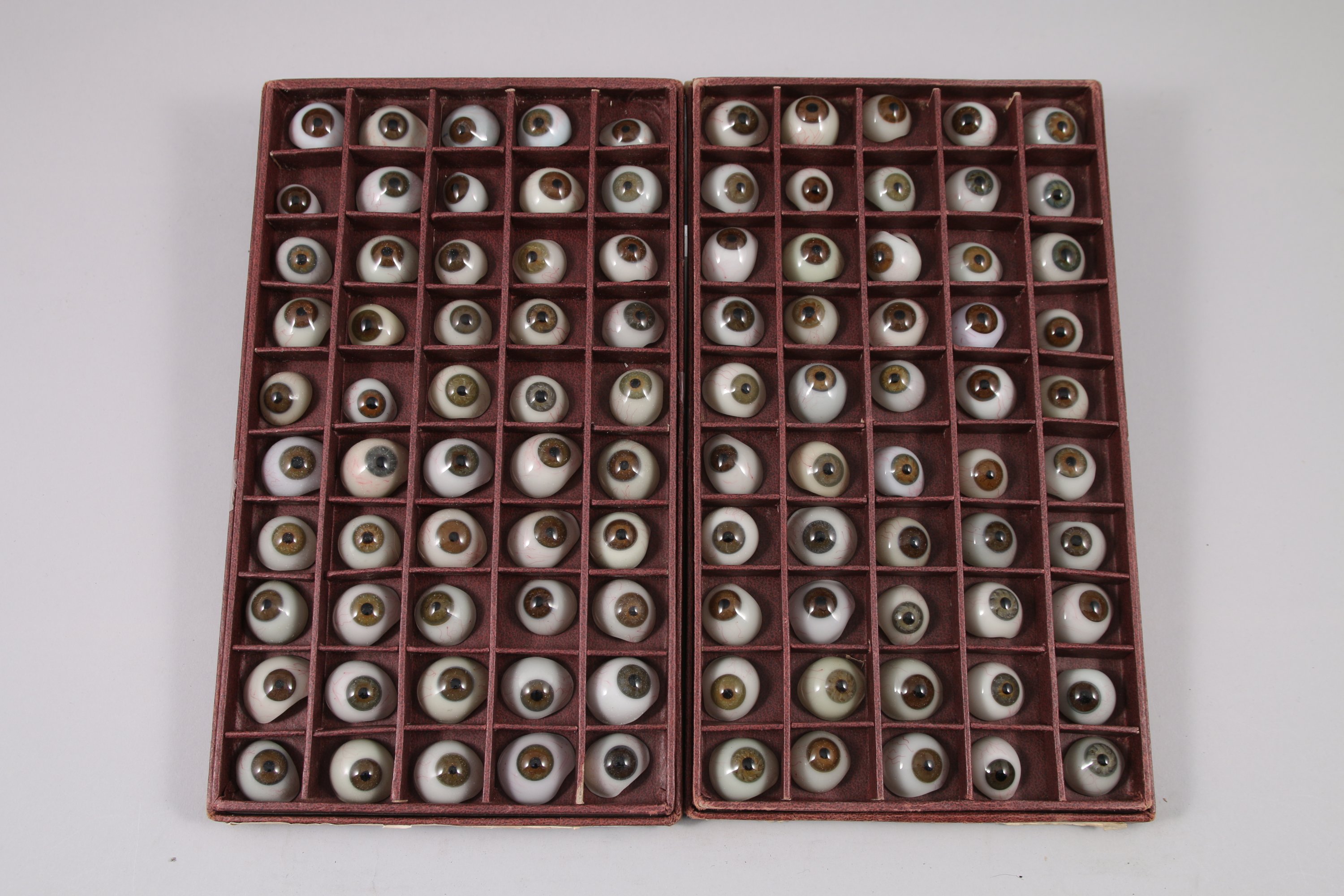 Environ une centaine de GLOBES OCULAIRES, simple ou double coque, dans un ou plusieurs coffrets gainés de chagrin. Les globes en verre teinté de différentes tailles, nuances de couleurs aux petits vaisseaux sanguins peints sur la conjonctive reproduisent l'iris grâce à des pigments de toutes teintes. Les formes des prothèses en demi-coquille sont irrégulières. Les tailles et couleurs diverses ont vocation à s'adapter aux patients ayant subi une énucléation.