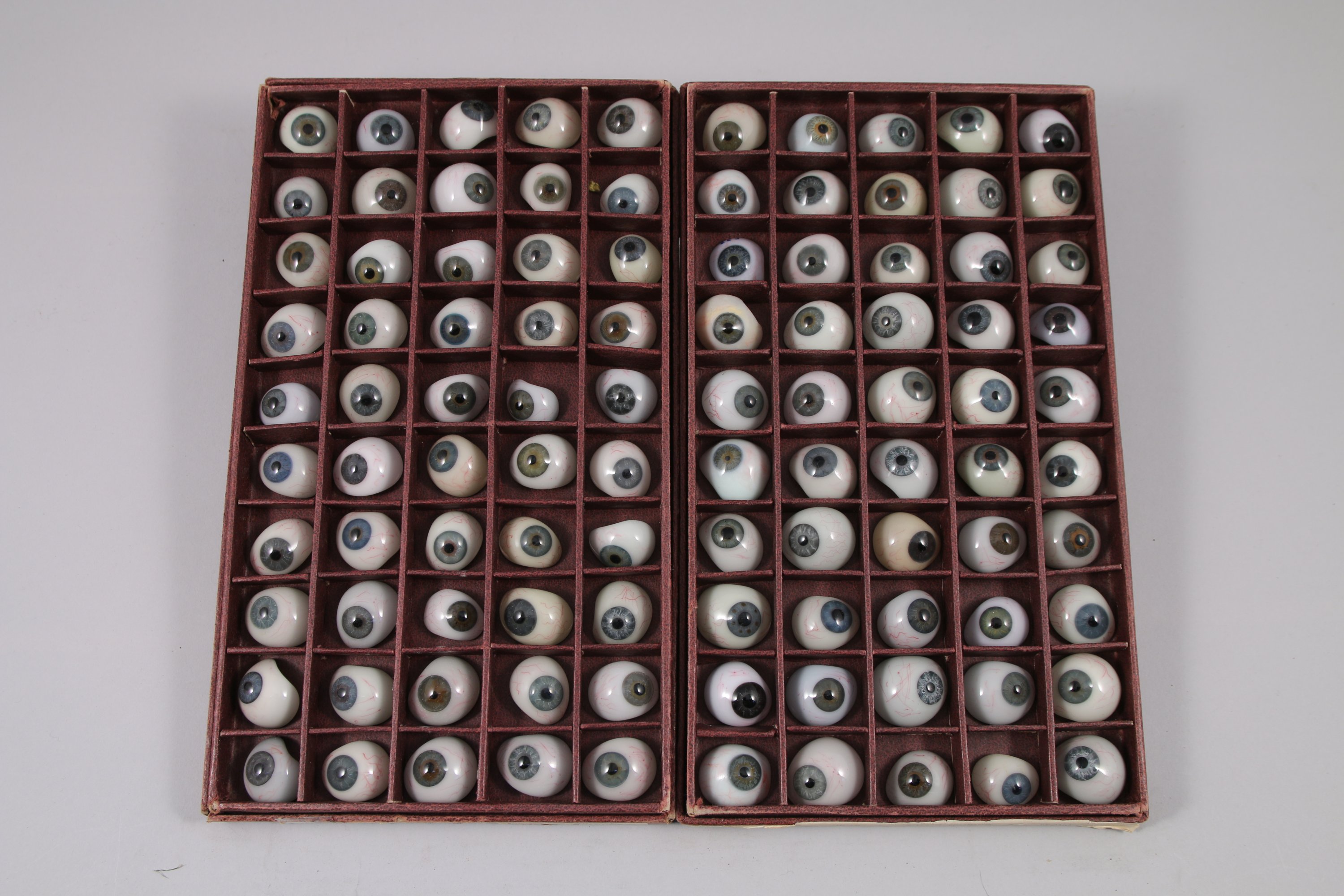 Environ une centaine de GLOBES OCULAIRES, simple ou double coque, dans un ou plusieurs coffrets gainés de chagrin. Les globes en verre teinté de différentes tailles, nuances de couleurs aux petits vaisseaux sanguins peints sur la conjonctive reproduisent l'iris grâce à des pigments de toutes teintes. Les formes des prothèses en demi-coquille sont irrégulières. Les tailles et couleurs diverses ont vocation à s'adapter aux patients ayant subi une énucléation.