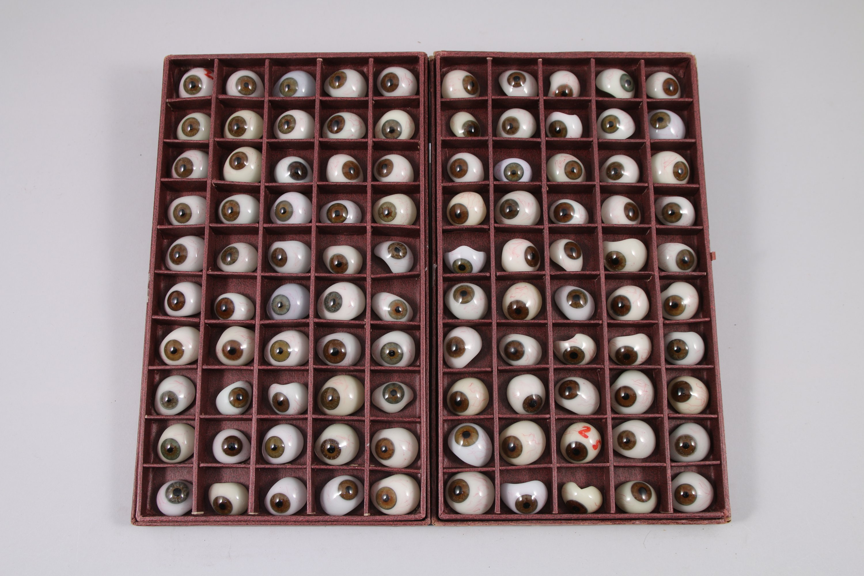 Environ une centaine de GLOBES OCULAIRES, simple ou double coque, dans un ou plusieurs coffrets gainés de chagrin. Les globes en verre teinté de différentes tailles, nuances de couleurs aux petits vaisseaux sanguins peints sur la conjonctive reproduisent l'iris grâce à des pigments de toutes teintes. Les formes des prothèses en demi-coquille sont irrégulières. Les tailles et couleurs diverses ont vocation à s'adapter aux patients ayant subi une énucléation.
