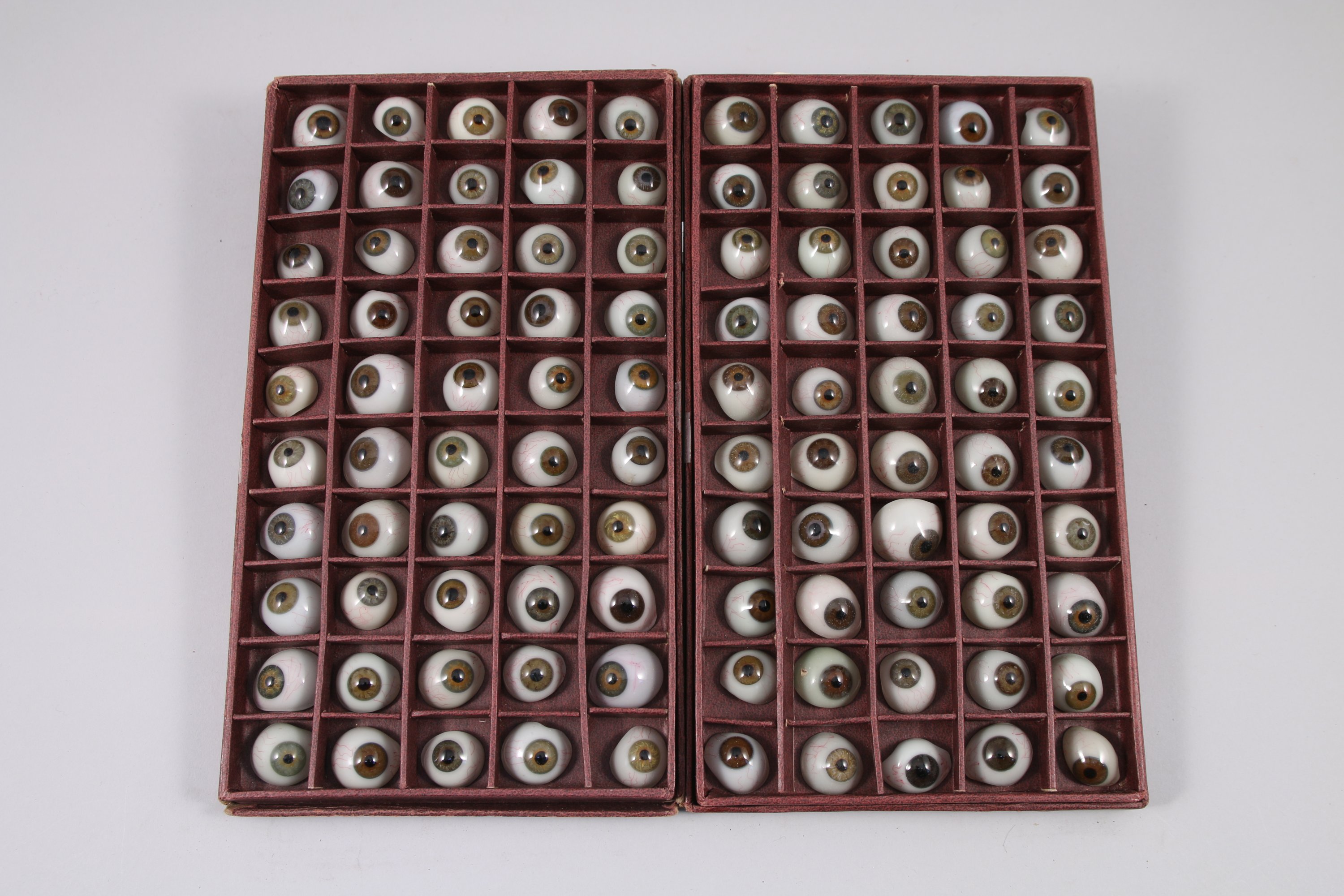 Environ une centaine de GLOBES OCULAIRES, simple ou double coque, dans un ou plusieurs coffrets gainés de chagrin. Les globes en verre teinté de différentes tailles, nuances de couleurs aux petits vaisseaux sanguins peints sur la conjonctive reproduisent l'iris grâce à des pigments de toutes teintes. Les formes des prothèses en demi-coquille sont irrégulières. Les tailles et couleurs diverses ont vocation à s'adapter aux patients ayant subi une énucléation.