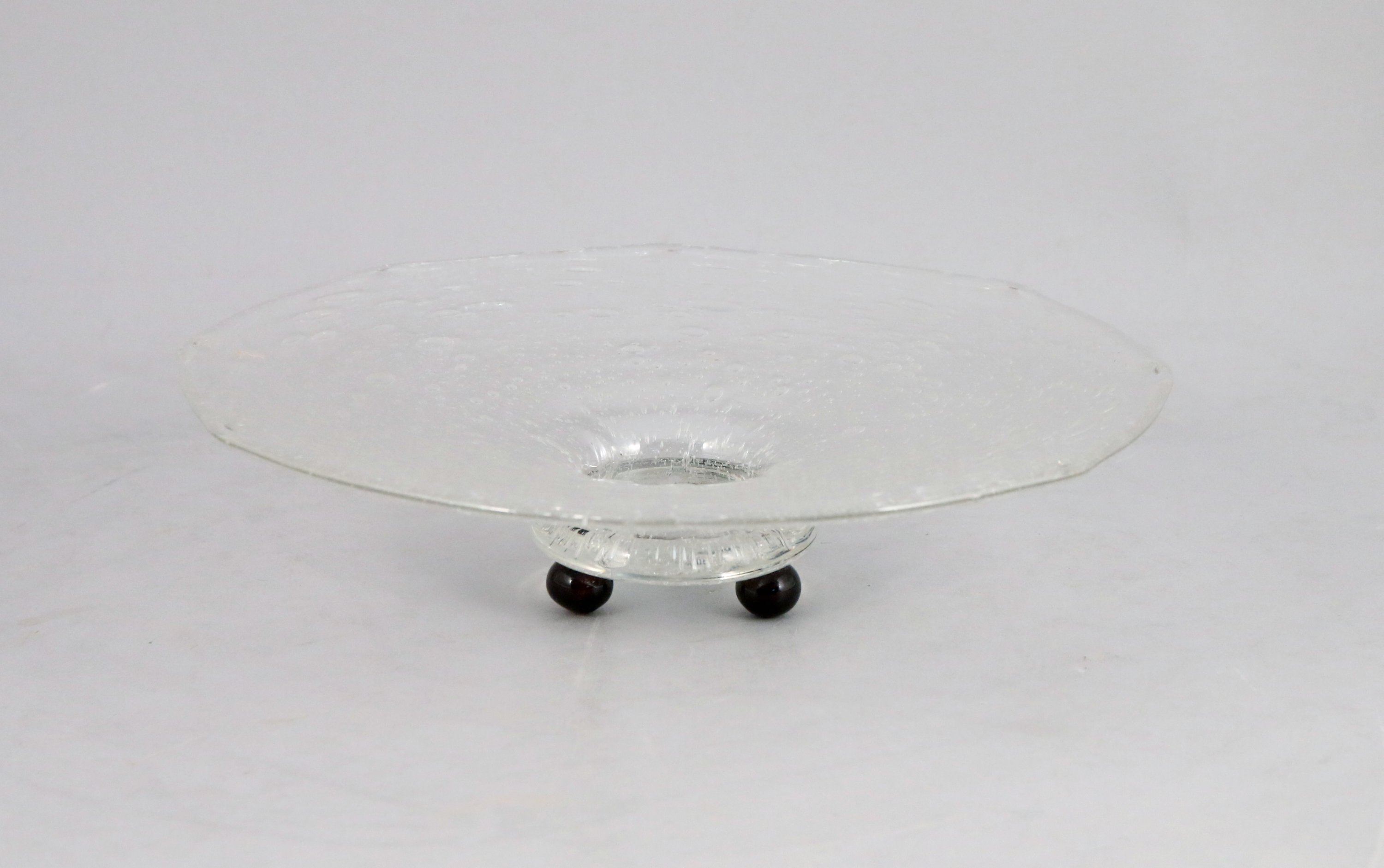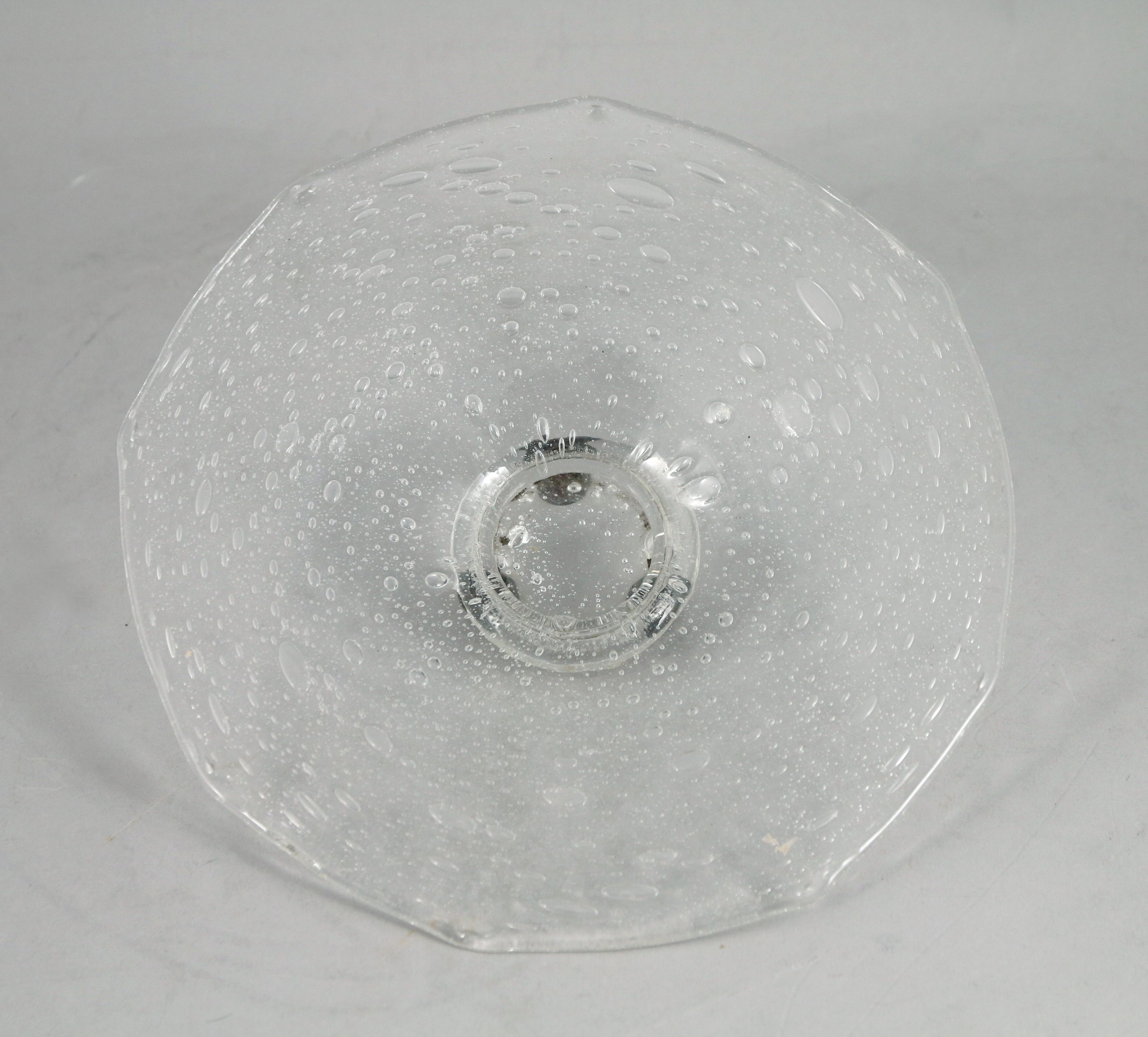 en verre bullé, étirée à la pince en huit points. Reposant sur trois boules violettes. Signée. Circa 1922.
