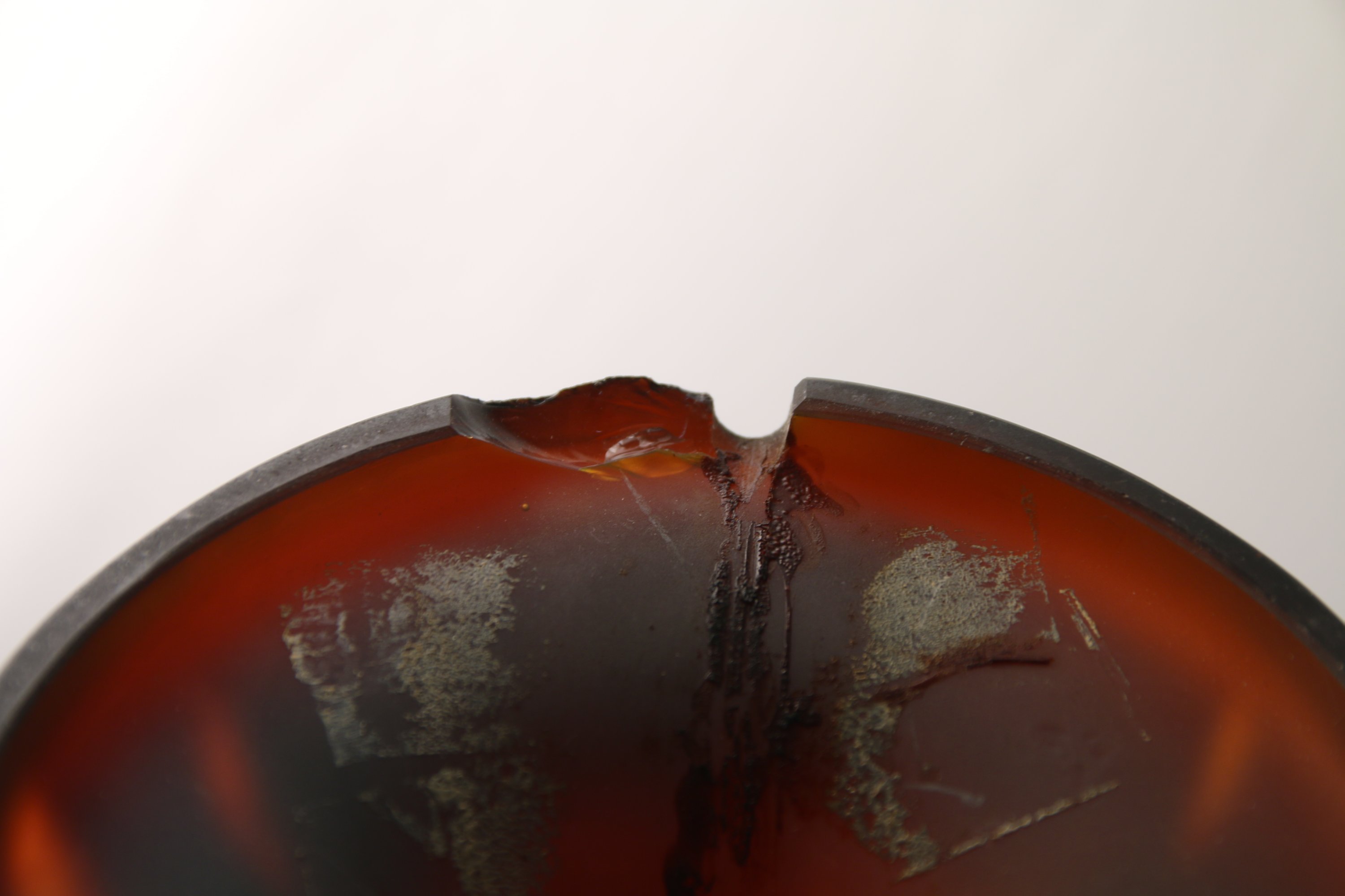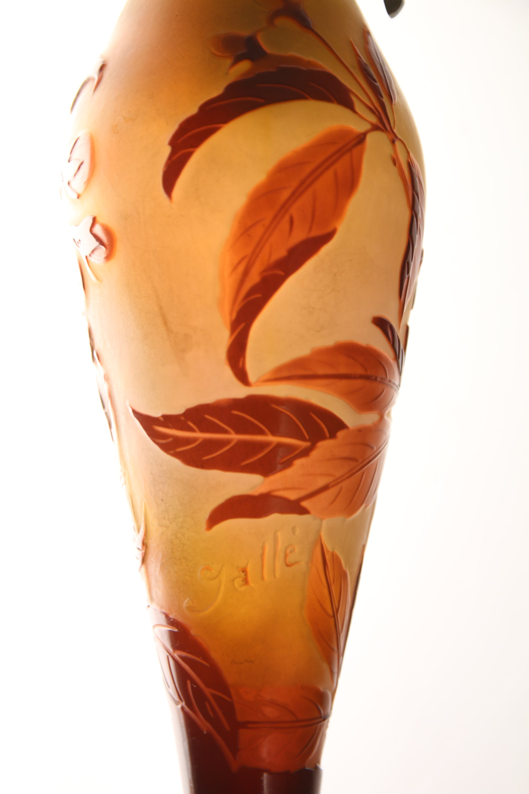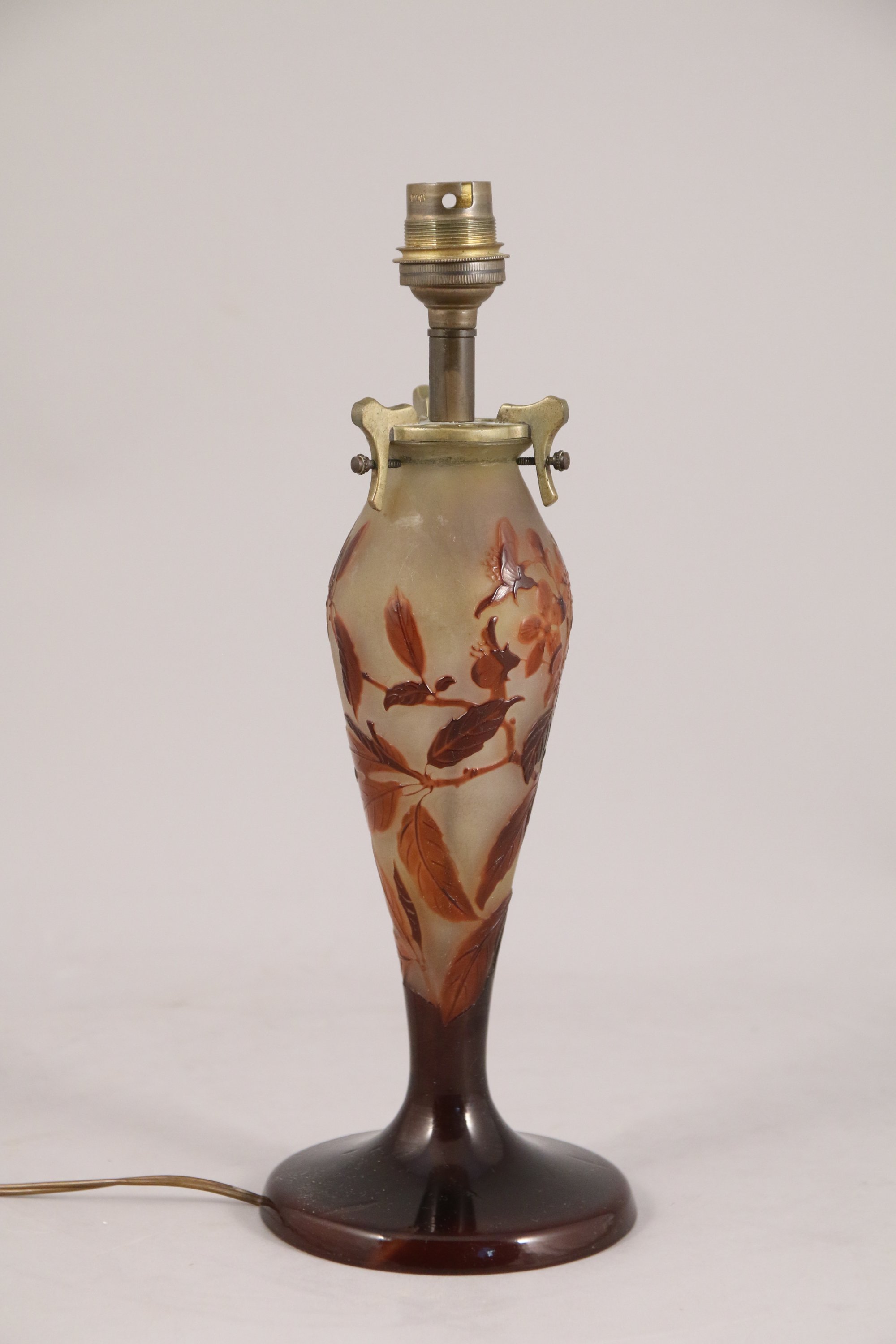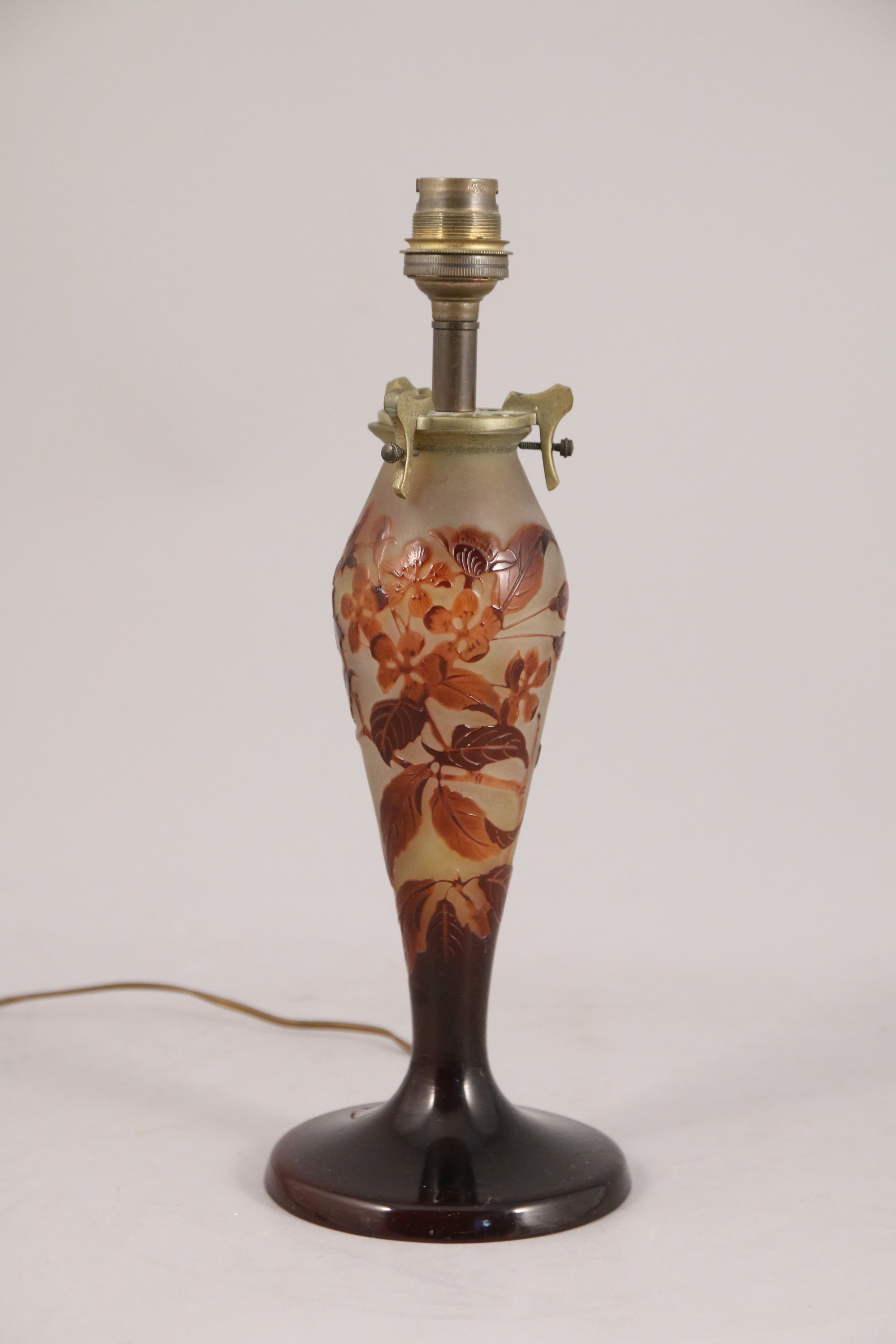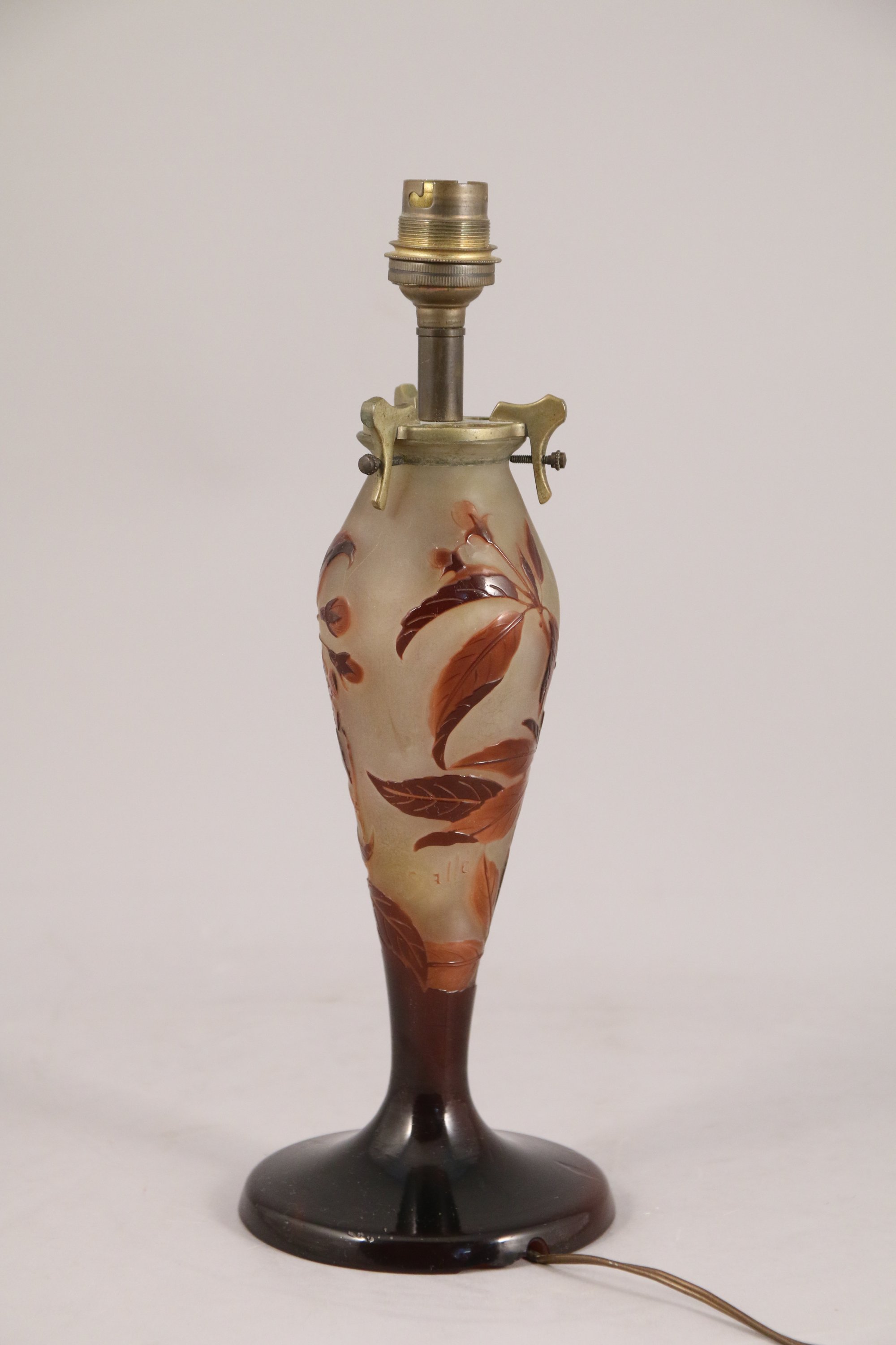 -Piètement de lampe champignon, en verre multi-couches dégagé à l'acide. Motifs de fleurs et de feuillages. Signé Gallé.