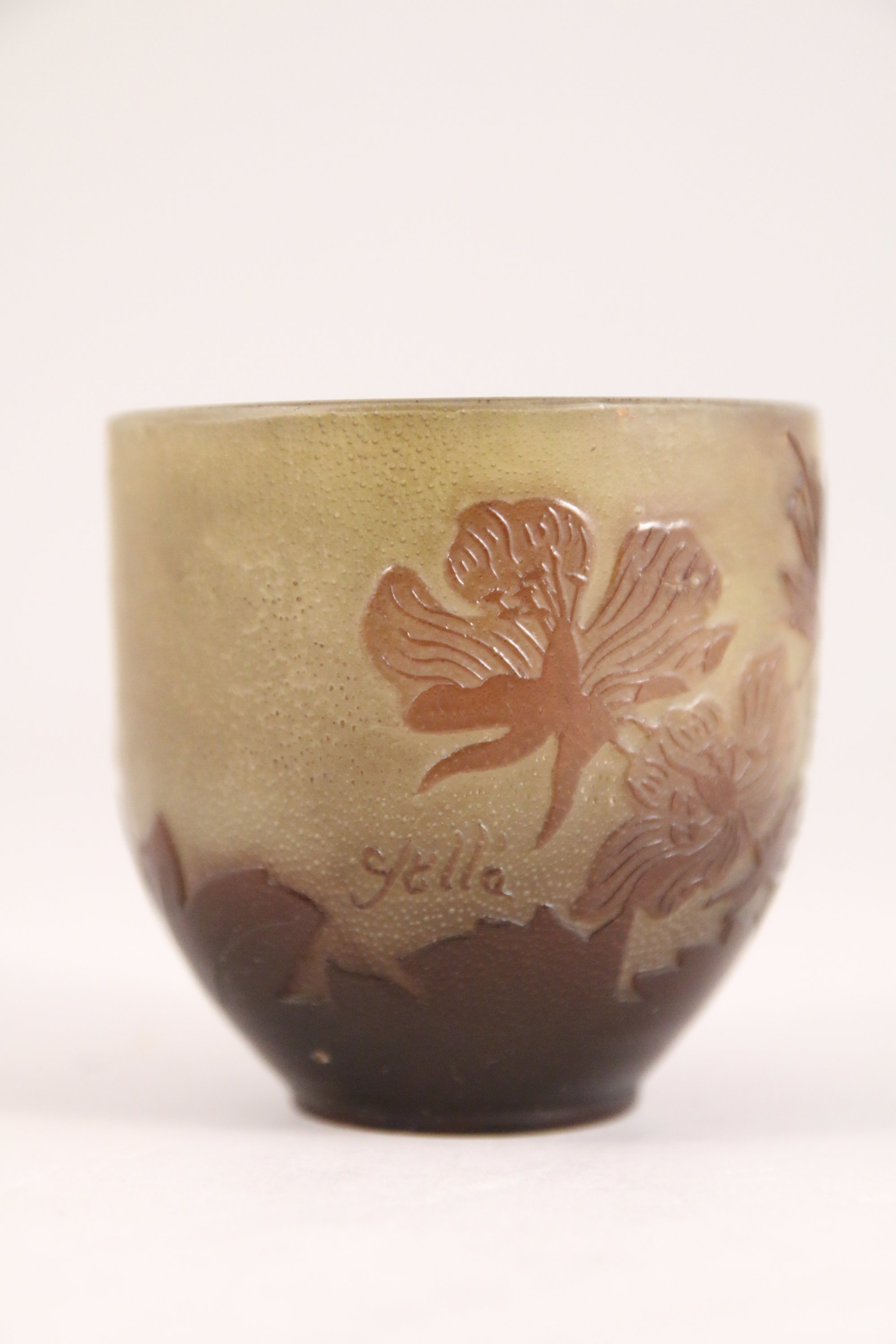 - Vase gobelet, en verre multi-couches dégagé à l'acide, violine sur fond jaune. A motif de fleurs épanouies. Signé "Gallé".