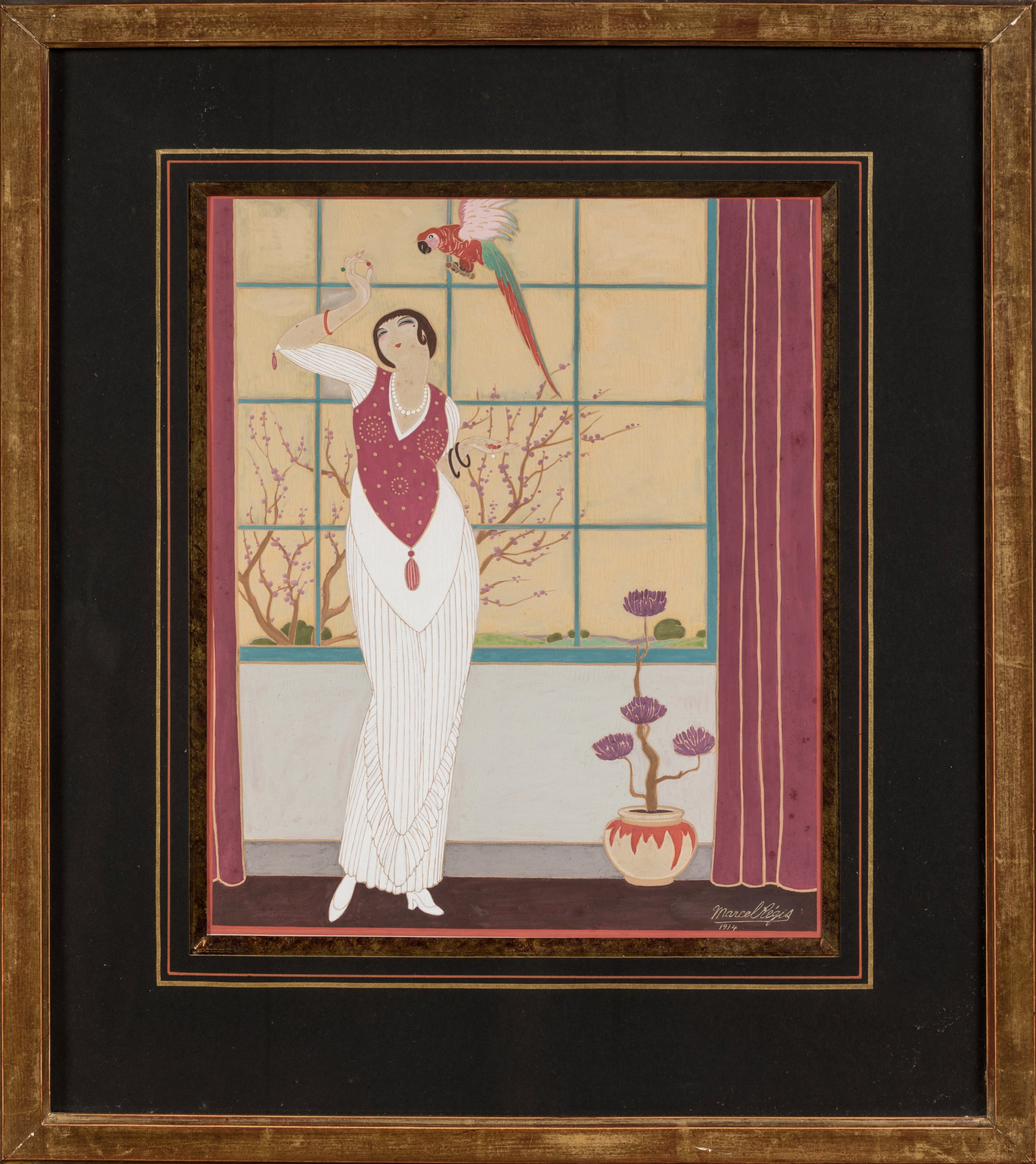 Employé d'une soierie lyonnaise, "Marcel Régis" de Chazournes est issu d'une grande famille qui donna plusieurs secrétaires d'État à la France. Sa jeune sur épousera après la guerre un fils Combet, issu d'une prestigieuse famille de soyeux. Ces dix gouaches aux élégantes sont probablement des projets d'éventails, que la guerre vint avorter, puisque Marcel Régis meurt pour la France en 1917, sur le Chemin des Dames.
