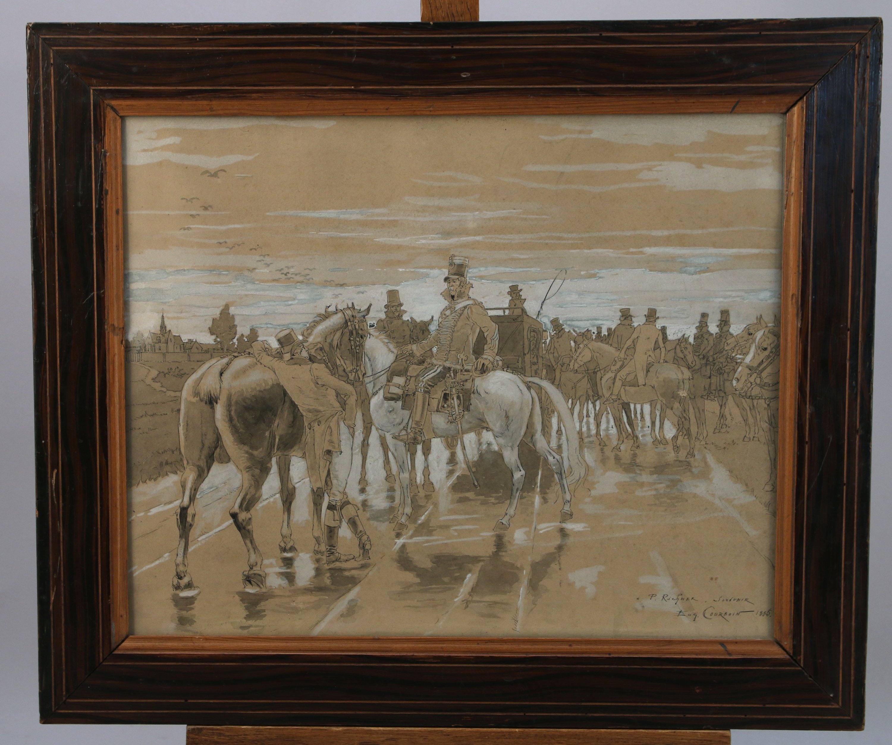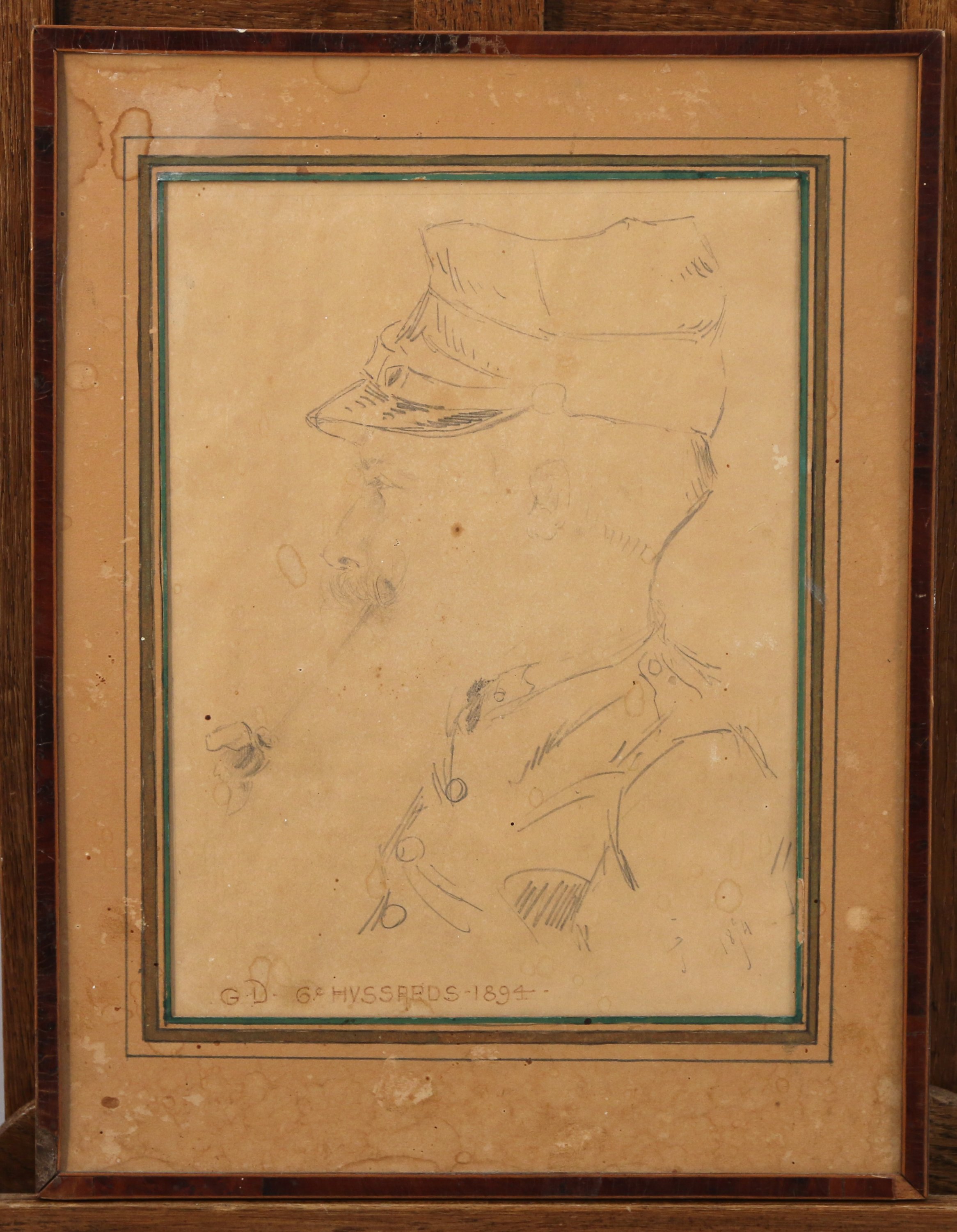 JOINT: Dessin au crayon d'un soldat du 6e Hussards, daté 1894 et monogrammé GD (22 x 16 cm).