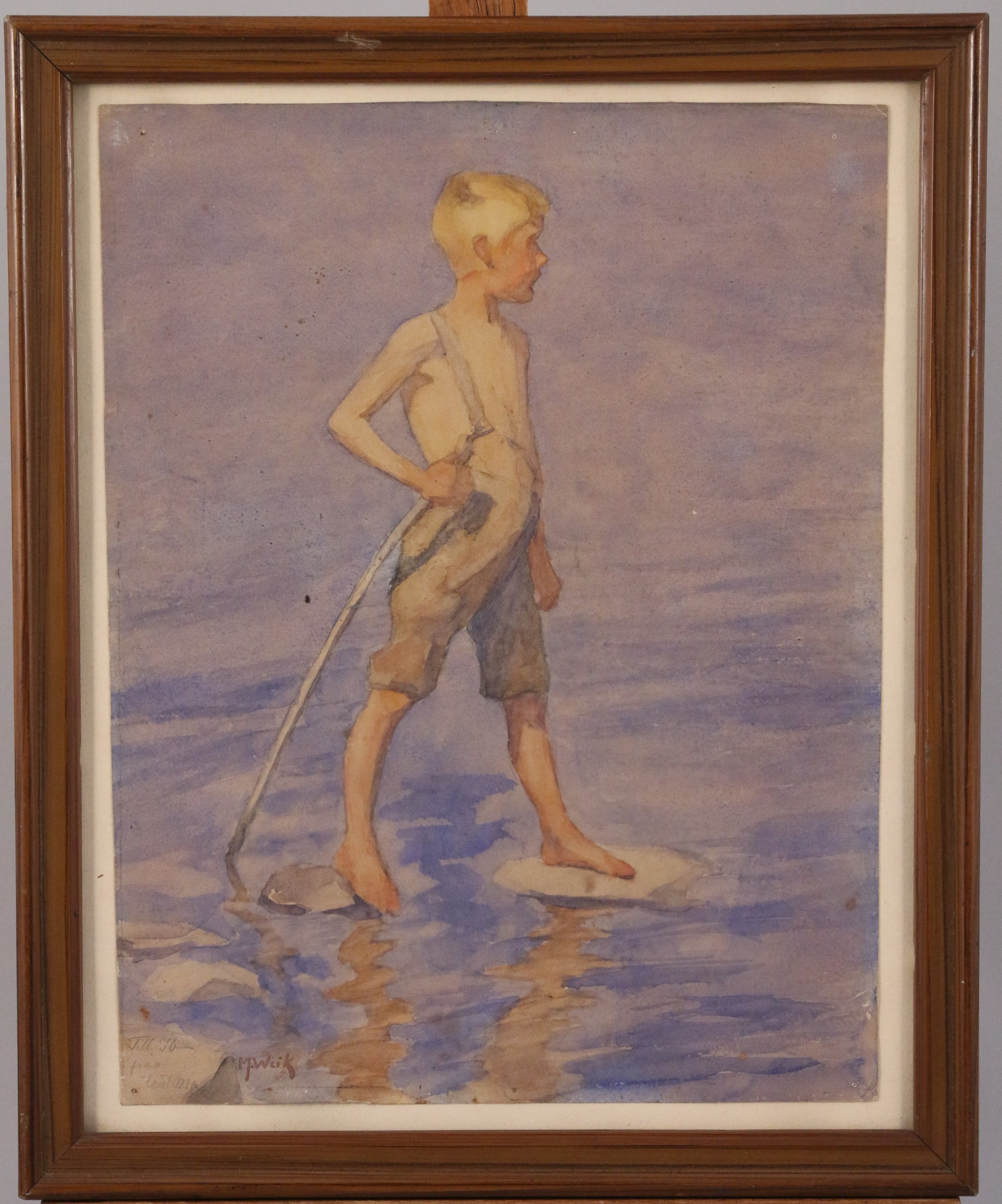 Cette aquarelle pourrait être une étude préparatoire pour l'huile sur toile présentée en vente publique le 11 décembre 2004 sous le titre "Pojke på stranden" et datée de 1901. (Jubileumsauktion, 11 décembre 2004, n°137, p. 80). Le catalogue raisonné précise le prénom de cet enfant: Kalle, qui est l'un des diminutif de Karl.