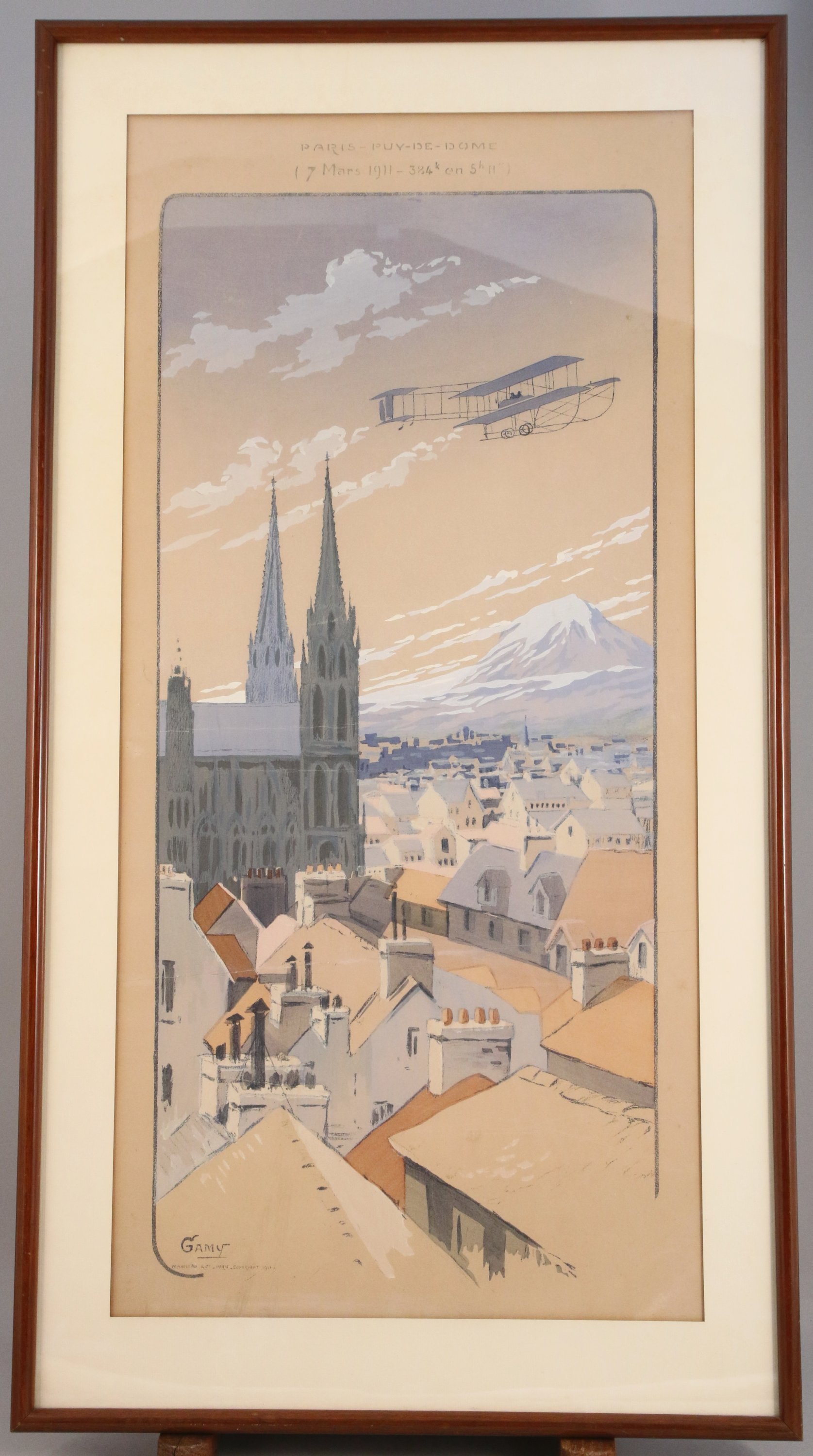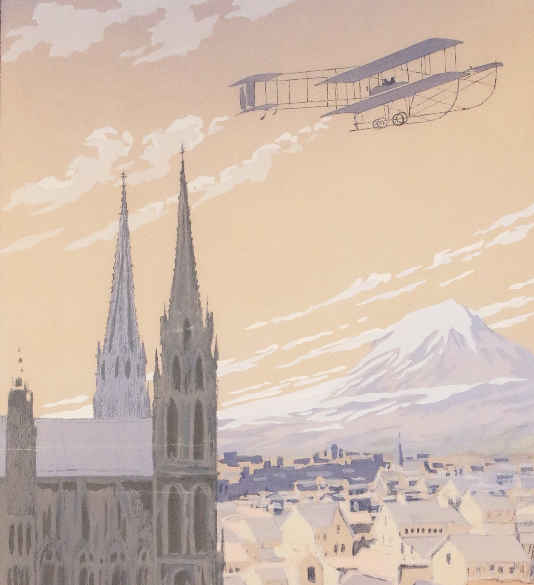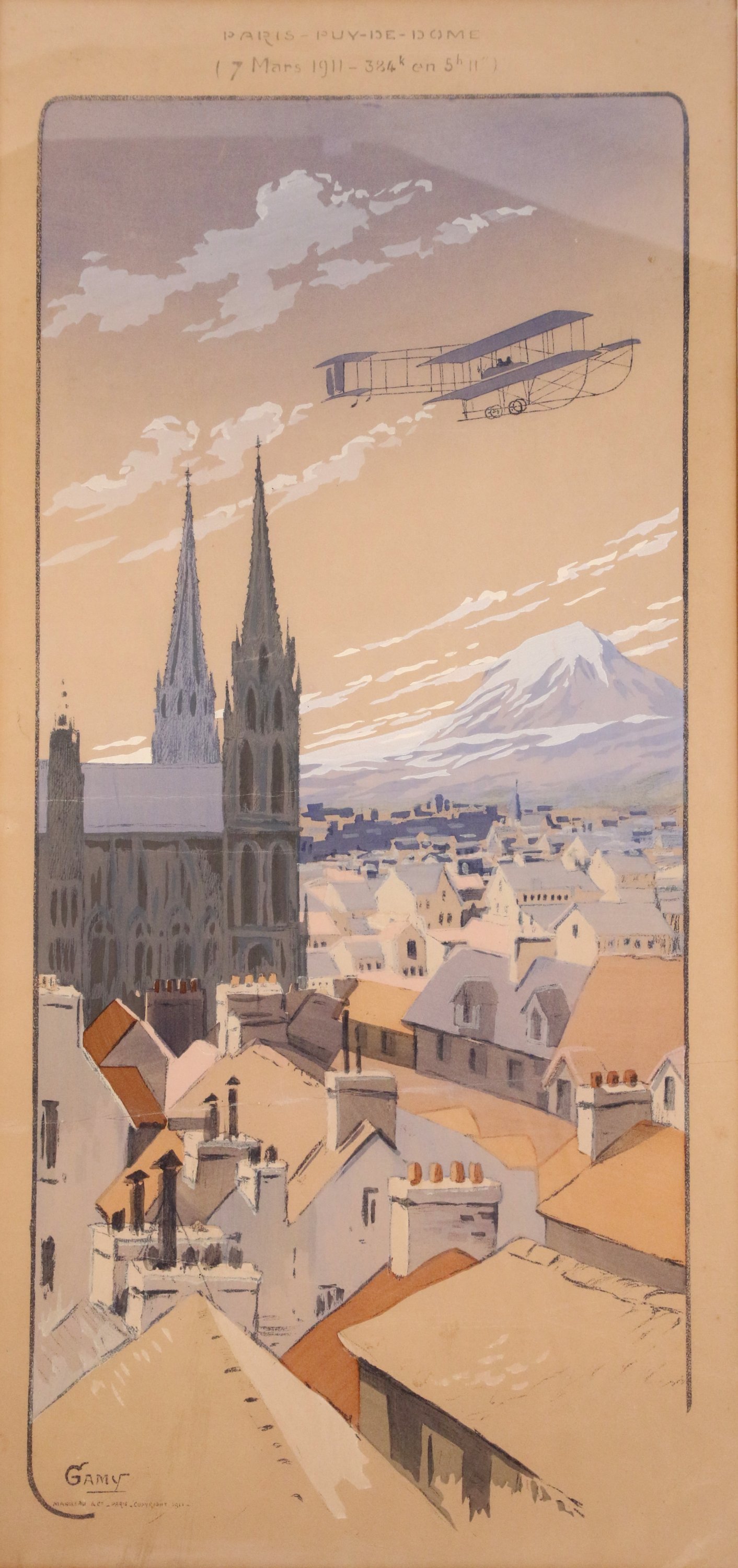 Affiche Paris Puy de Dome 7 mars 1911. Figurant le Maurice Farman MF-11, premier appareil militaire à moteur Renault.
