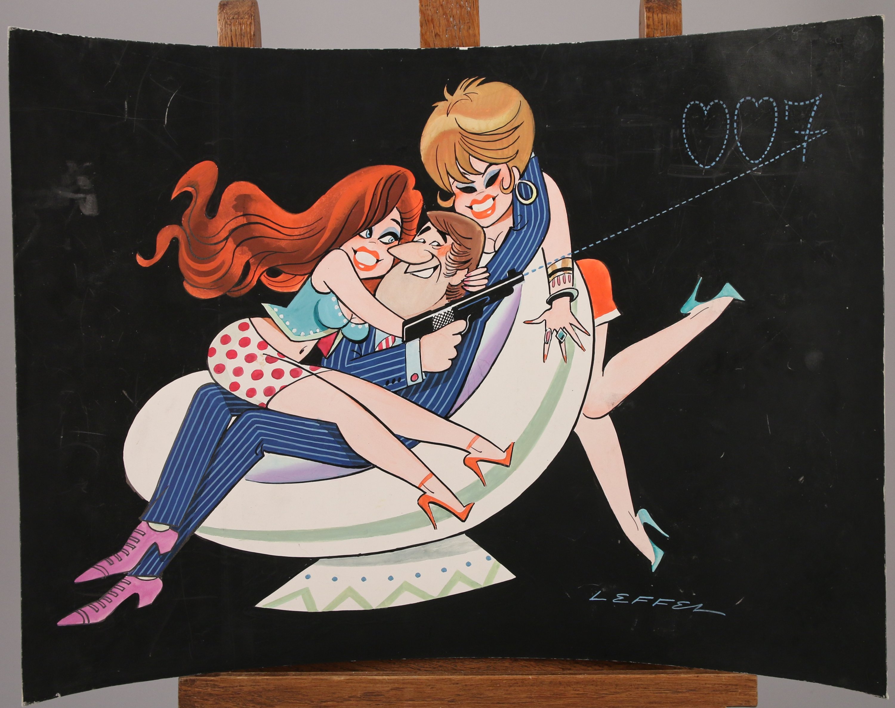 3 grands dessins à l'encre et à la gouache, d'environ 35 x 50 cm: James Bond, Pin Up, Un admirateur.