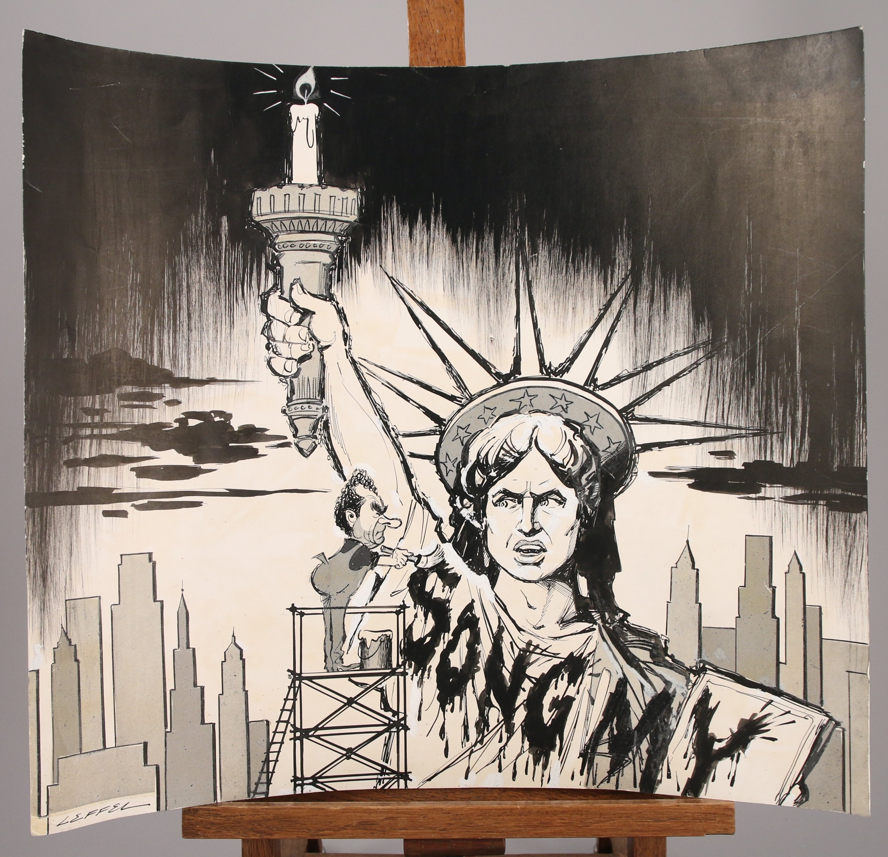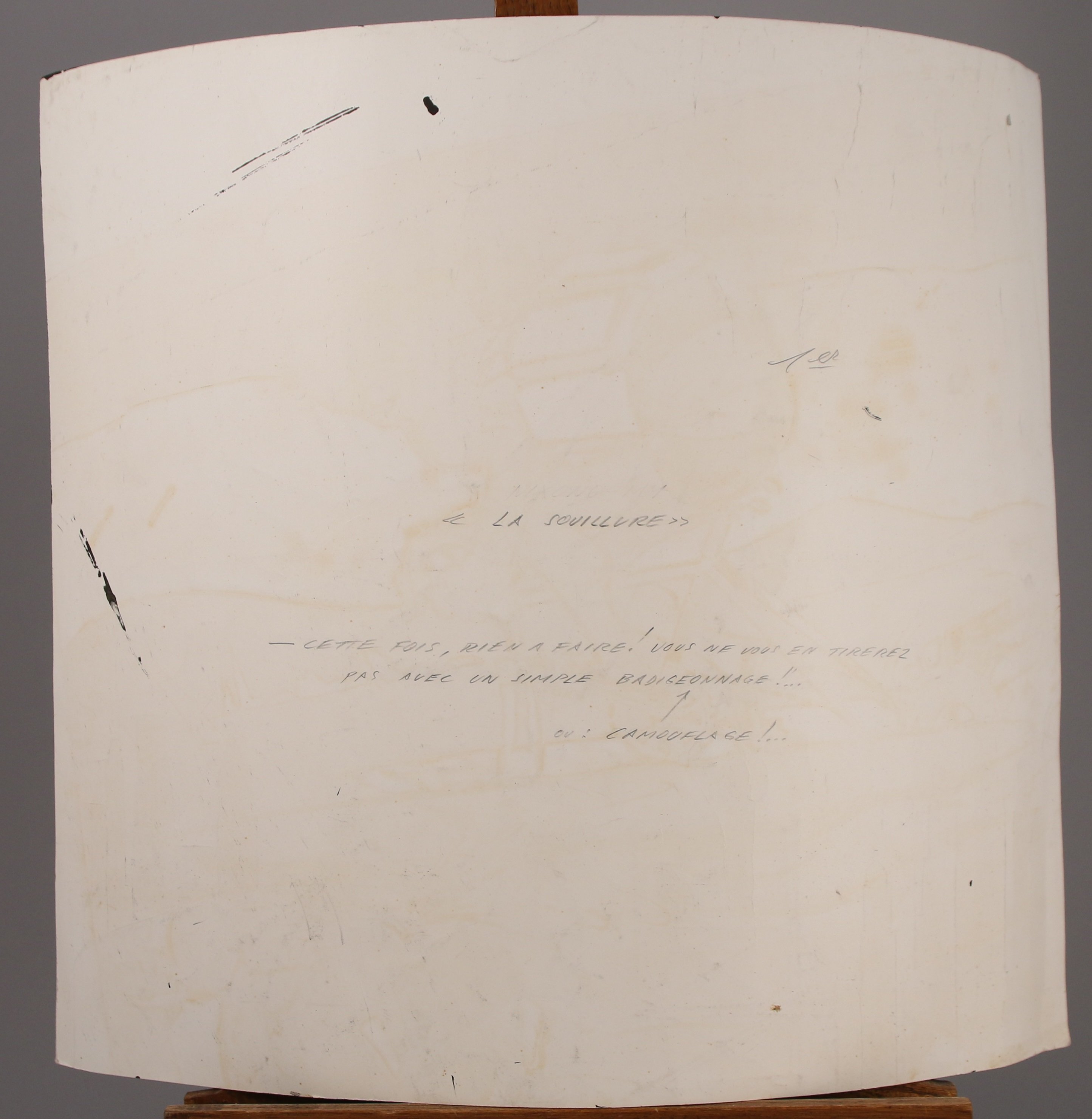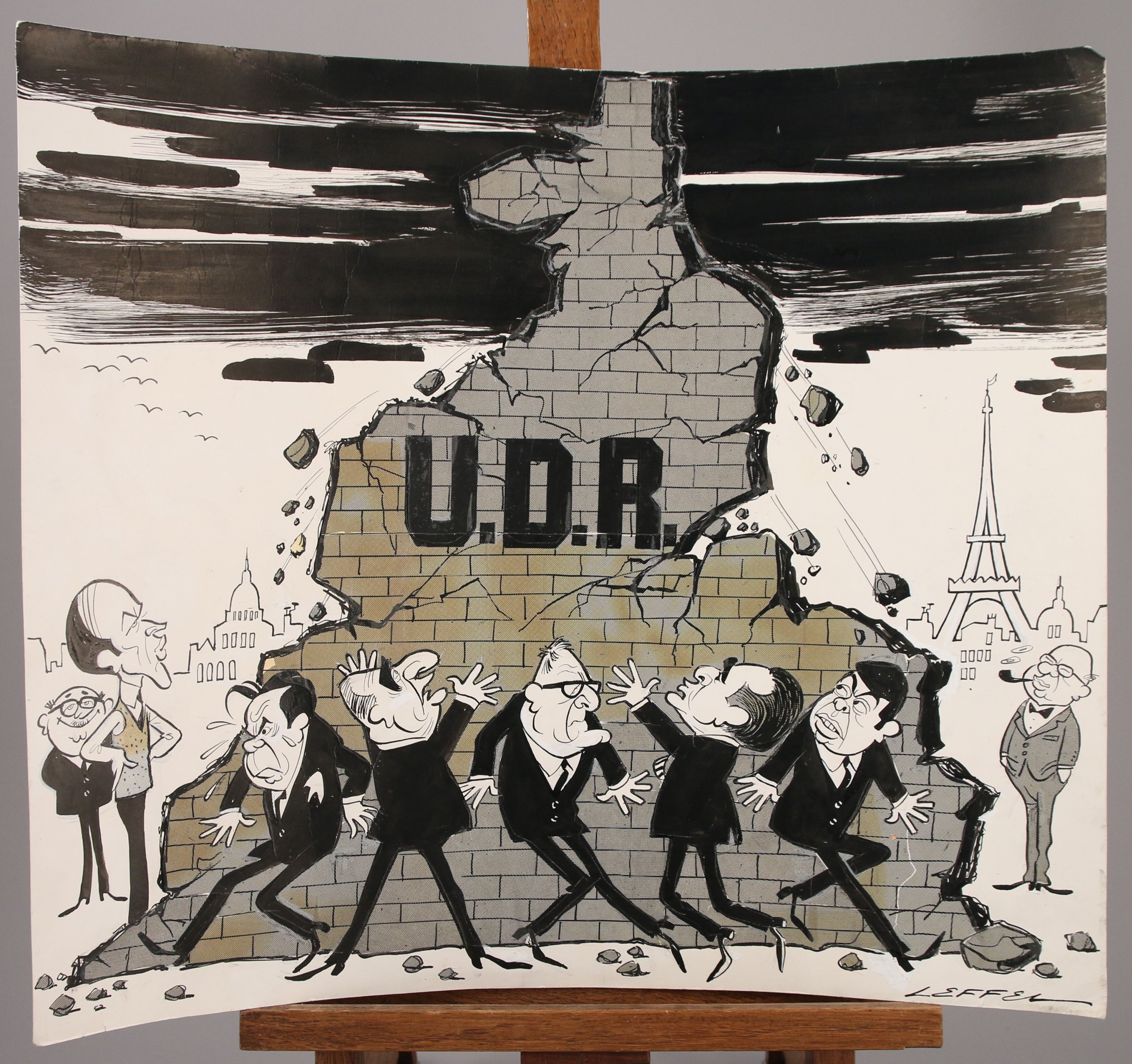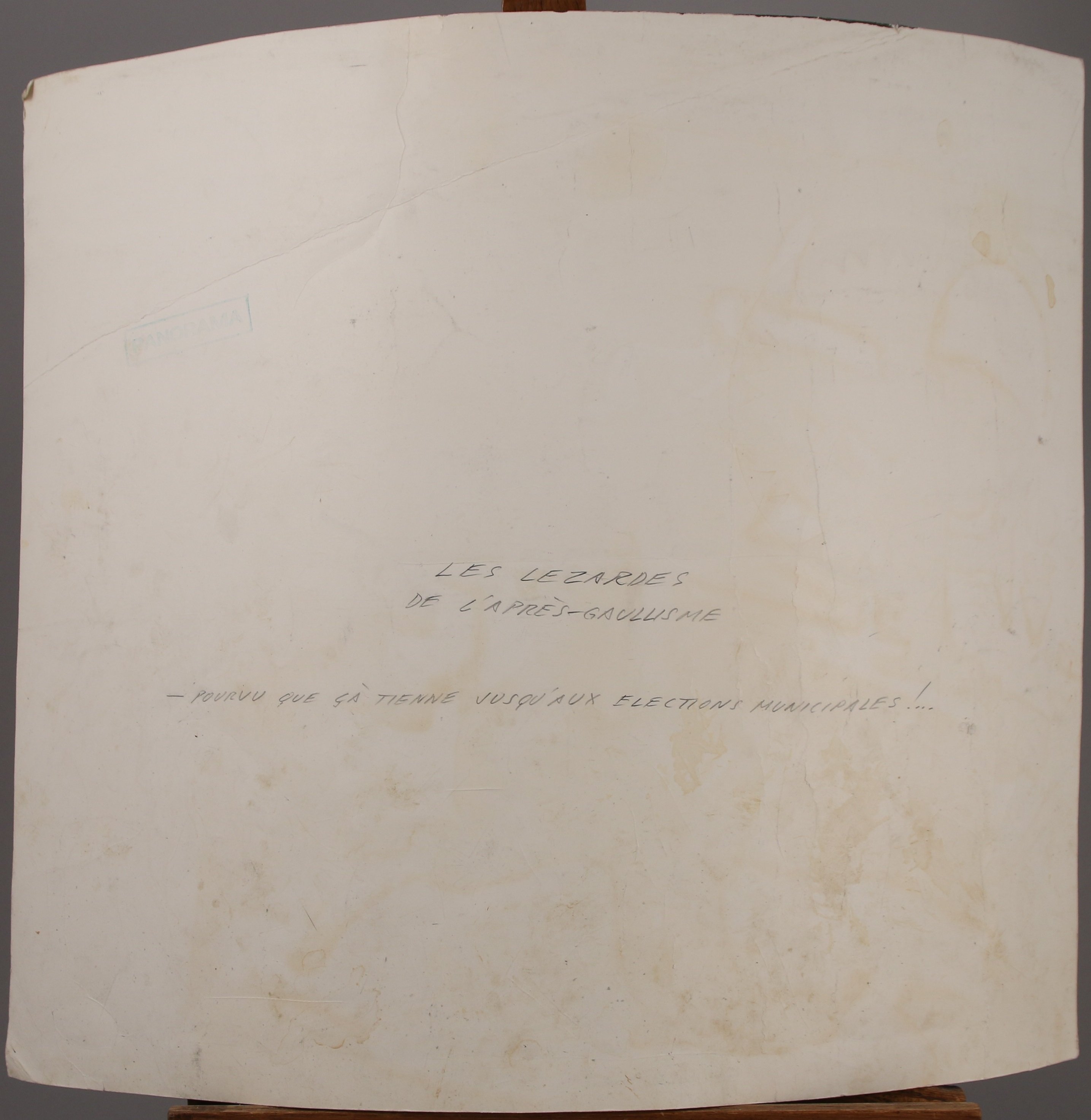 2 grands dessins à l'encre et lavis avec rehaut de blancs, d'environ 43 x 50 cm: La souillure, Les lésardes de l'après gaullisme.