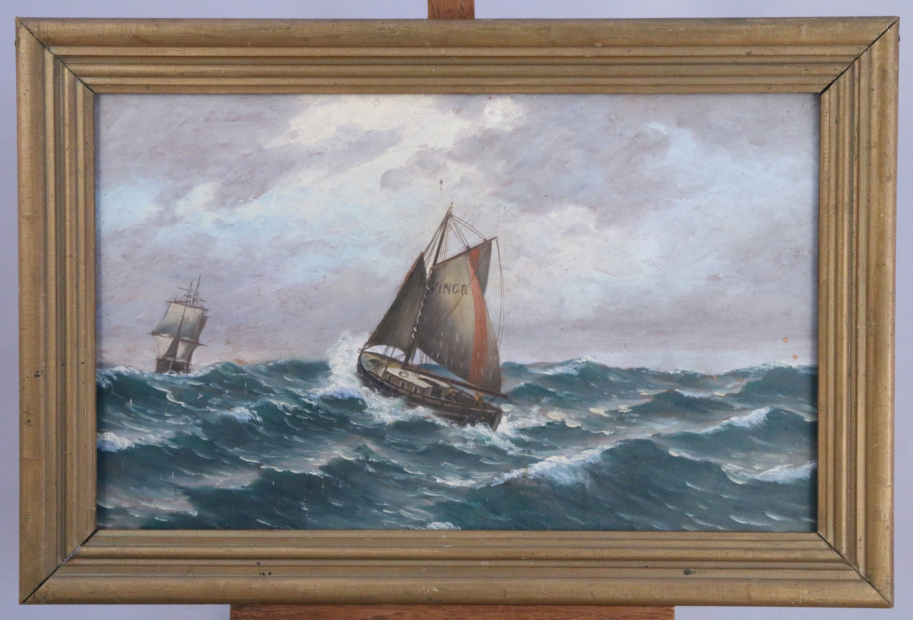 Voilier en haute mer, porte l'inscription "VINGA" sur la voile.