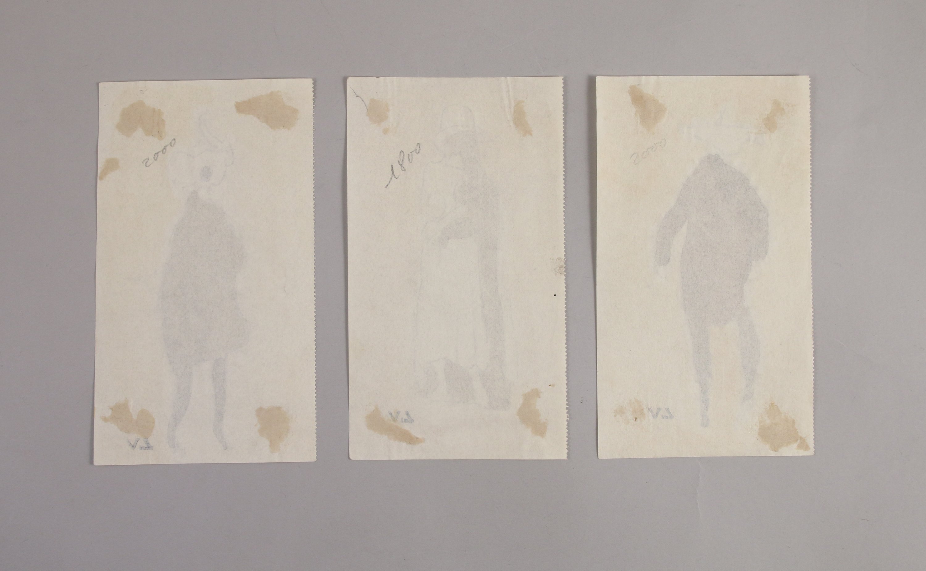 Crayon et couleurs sur papier. Monogrammés "L.V" en bas à droite.