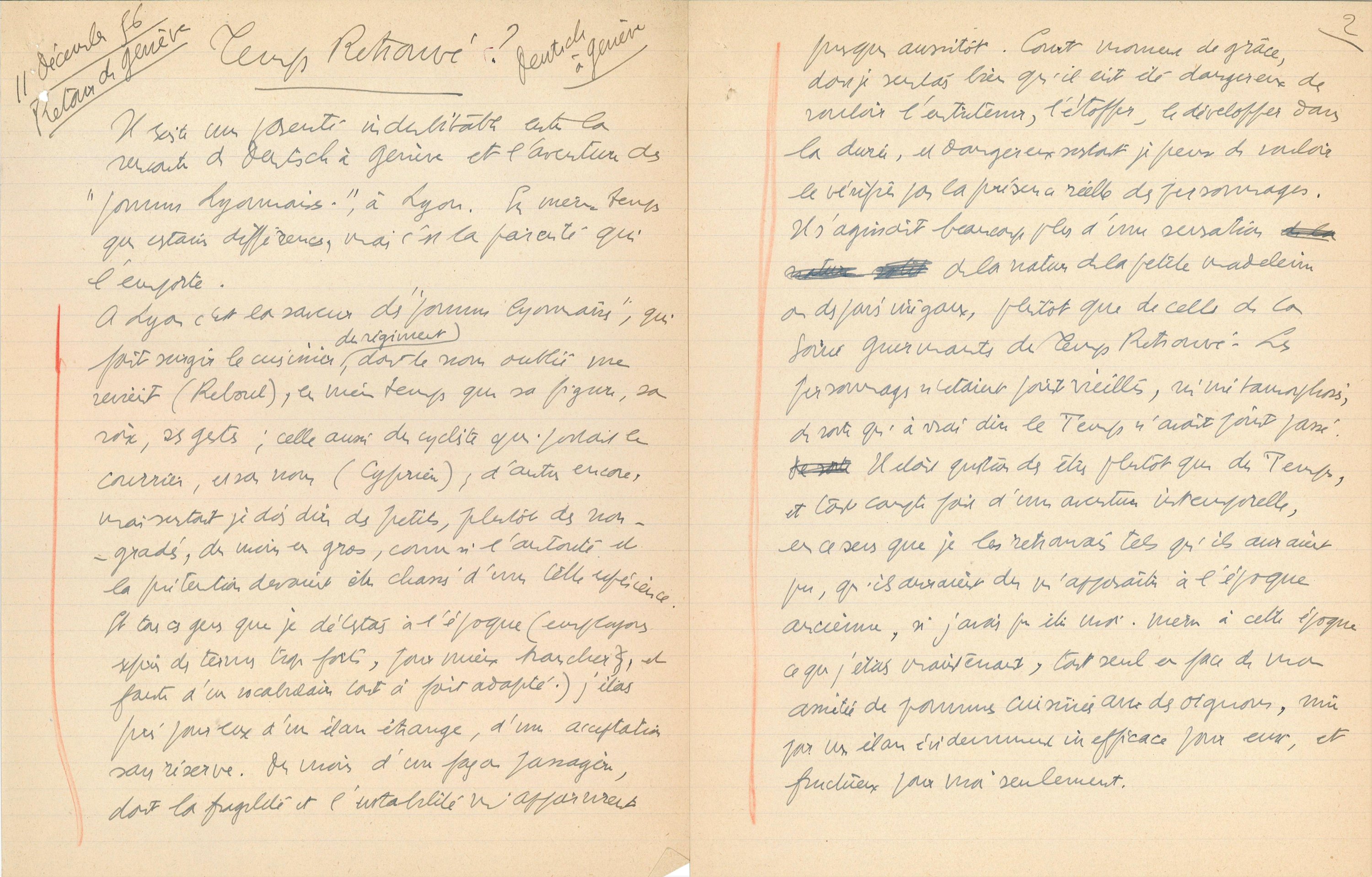 Manuscrit autographe de Charles Lapicque, 6 pages in-4, titré " Temps retrouvé? ", et daté du 11 décembre 1956 avec annotations en marge " retour de Genève - Deutsch à Genève ".