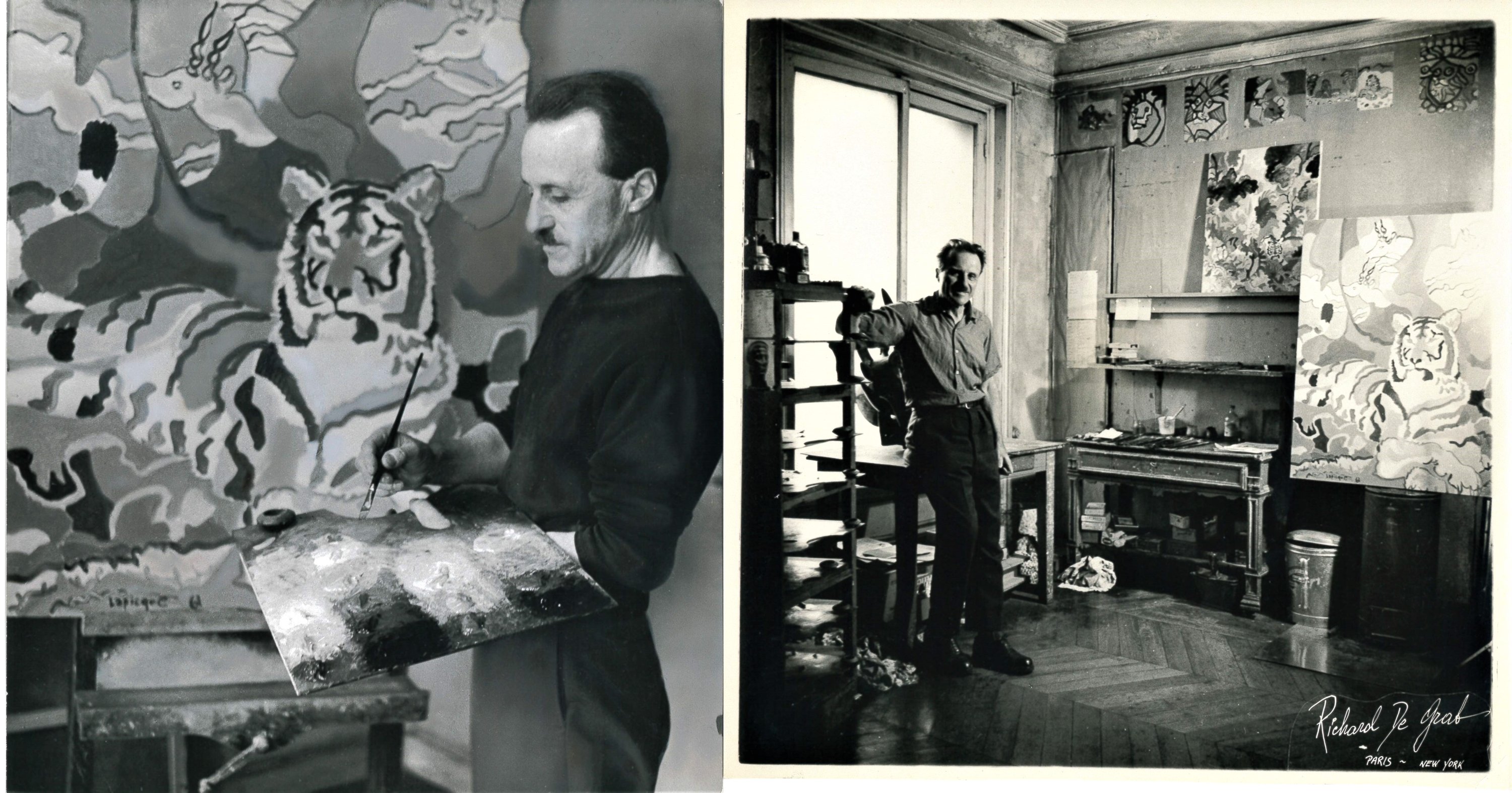 Joint: 3 tirages photographiques, env. 24 x 25 cm, réalisés par Richard de Grab, Lapicque et ses masques africains, et prise de vue dans son atelier avec des peintures de la série des tigres et des lions zapotèques - 2 tirages photographiques, 20 x 18 cm, par René Pari, Lapicque peignant le portrait d'un tigre - Catalogue de l'exposition tenue au musée de Grenoble du 29 juin au 31 août 1962 + 36 clichés négatifs kodak, vues de l'exposition- Catalogue d'exposition tenue à la Kunsthalle de Berne du 17 mars au 23 avril 1962 - n°87 de la revue " Pour l'art ", nov.-déc. 1962.