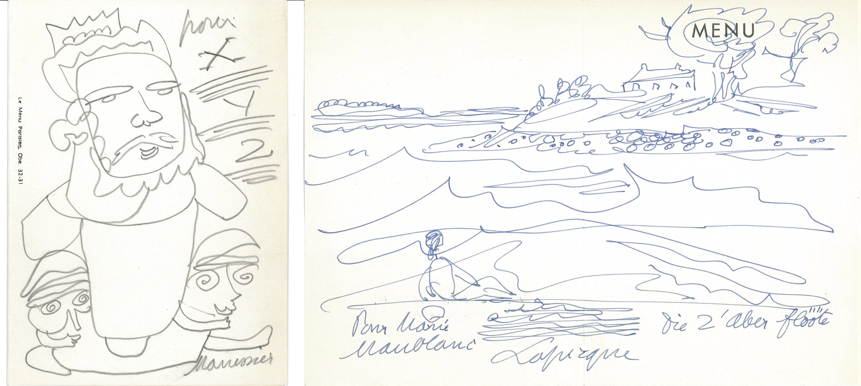 Joint: 4 impressions lithographiques numérotées et signées ; dessin à la mine de plomb avec envoi autographe de Lapicque " Pour Manessier " ; dessin à la plume titré et signé avec envoi autographe.