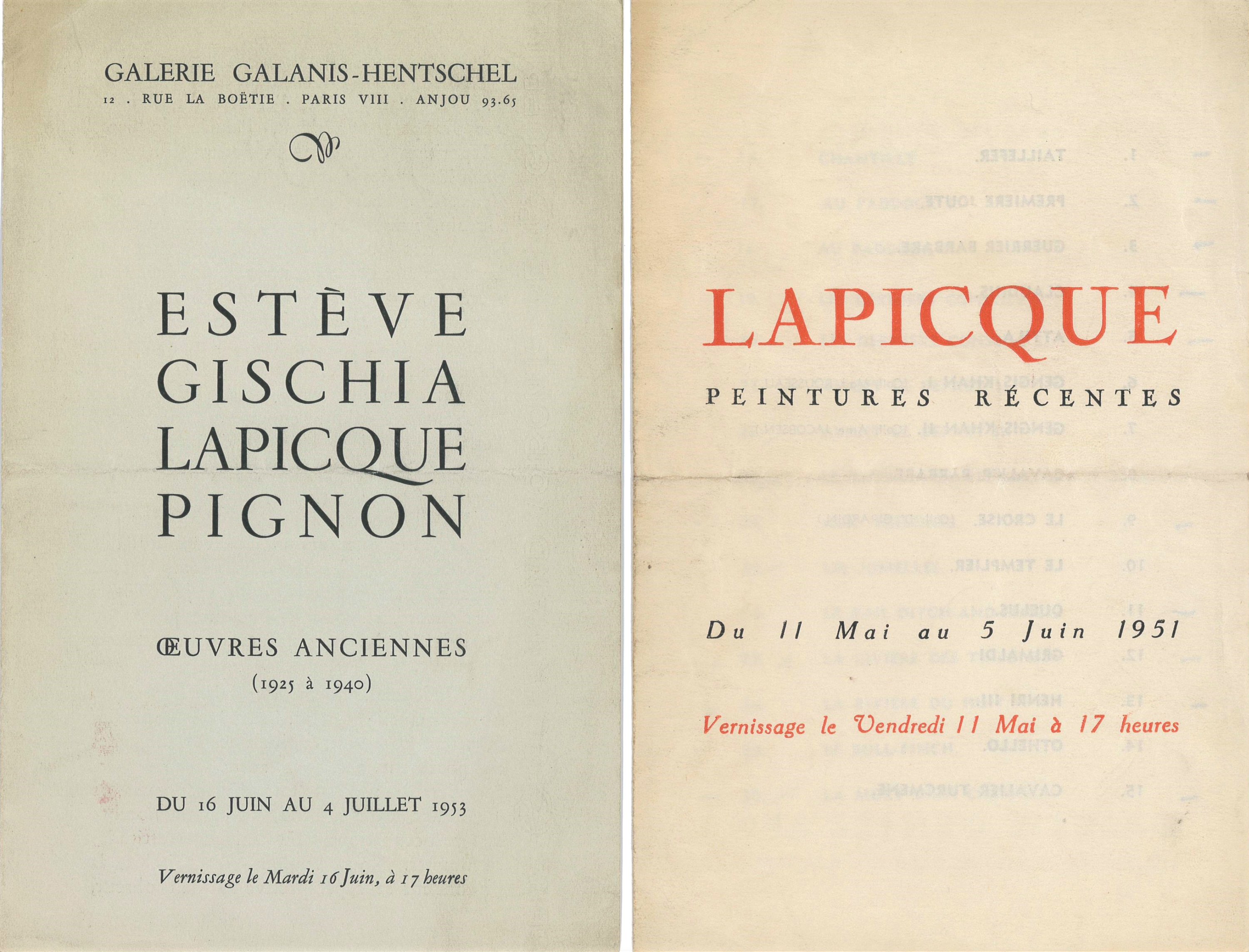 - Catalogues ou plaquettes d'expositions: Vestart à New York, avec envoi autographe de Lapicque ; Kunsthalle Bern, 1962 ; Kunstverein à Hambourg, 1964 ; Musée d'art national moderne, Paris, 1967, avec envoi autographe de Lapicque ; Musée de Brest, 1969 ; Galerie Verrière à Lyon, 1970 ; Centre Georges Pompidou, Paris, 1978 ; Galerie Messine, Paris, 1983 ; ASB Galerie, 1987.