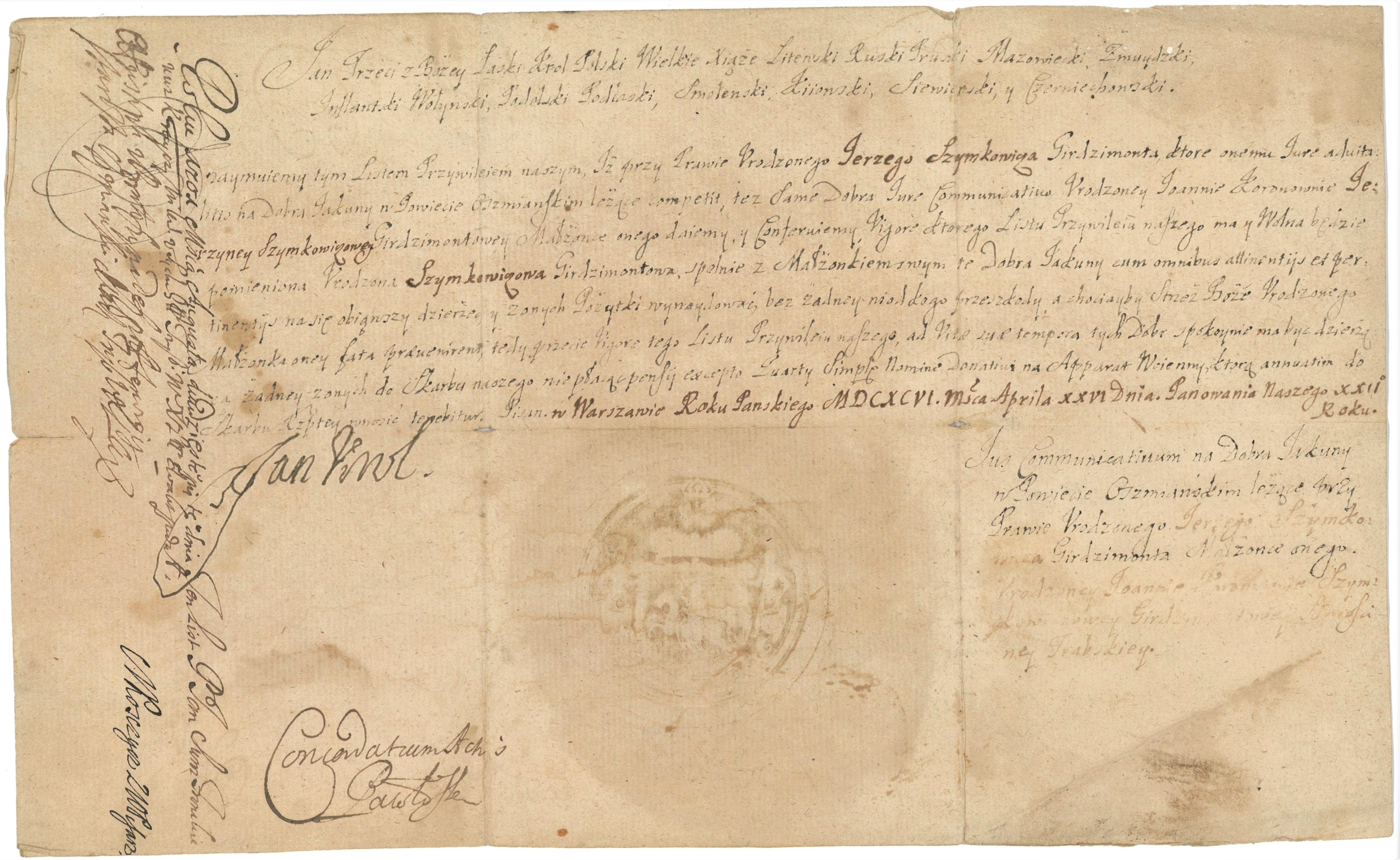 P.S., Varsovie, 26 avril 1696, 1 page oblong, avec signature autographe de Jean III Sobieski et superbe cachet estampé aux armes du grand-duché de Lituanie.