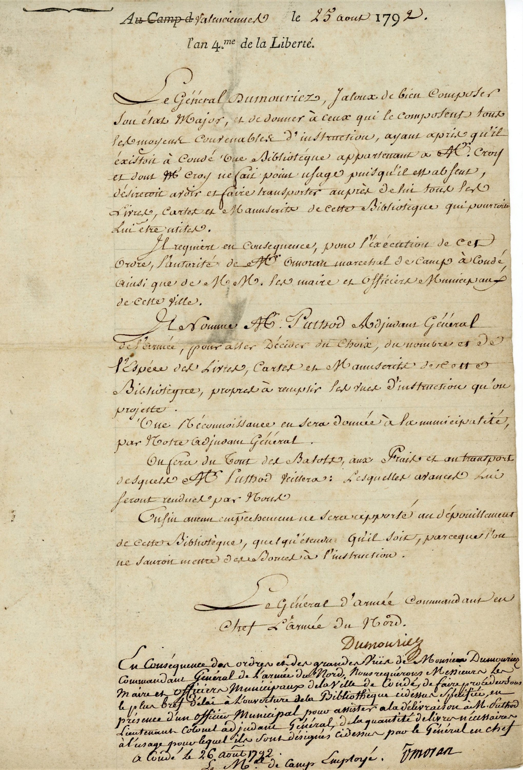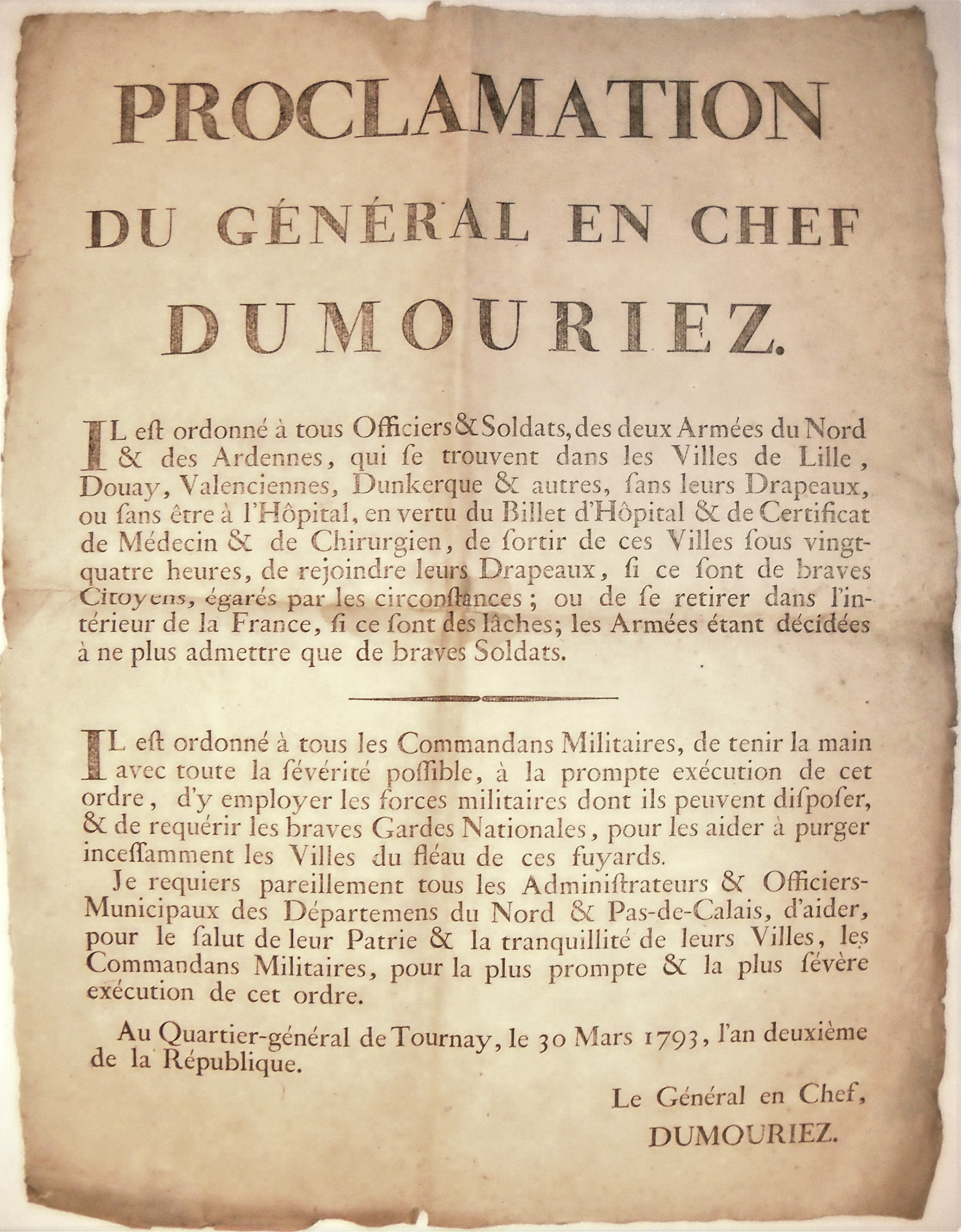 Lot de 8 pièces: " Proclamation du Général en Chef Dumouriez, au Quartier Général de Tournay, le 30 mars 1793, l'an 2 de la République ", placard imprimé, 53 x 40 cm, ordonnant " à tous les Officiers & Soldats, des deux Armées du Nord & des Ardennes, qui se trouvent dans les Villes de Douay, Valenciennes, Dunkerque & autres, sans leurs Drapeaux ou sans être à l'Hôpital, (...) de sortir de ces Villes sous 24 heures, de rejoindre leurs drapeaux, si ce sont des braves Citoyens, égarés par les circonstances; ou de se retirer dans l'intérieur de la France, si ce sont des lâches; les Armées étant décidées à ne plus admettre que de braves Soldats... " - L.S., Valenciennes, 25 août 1792, général DUMOURIEZ + apostille signée du maréchal de camp irlandais James O'MORAN, 1 page in-fol., donnant ordre de réquisitionner tout le contenu de la bibliothèque (livres, cartes, manuscrits) appartenant à Anne Emmanuel de CROY, prince de Solre et Saint Empire, émigré, et resté dans son château à Condé sur l'Escaut. - " Adresse a l'armée Belgique ", placard imprimé par Deboubers à Lille, 53 x 41 cm: " (
