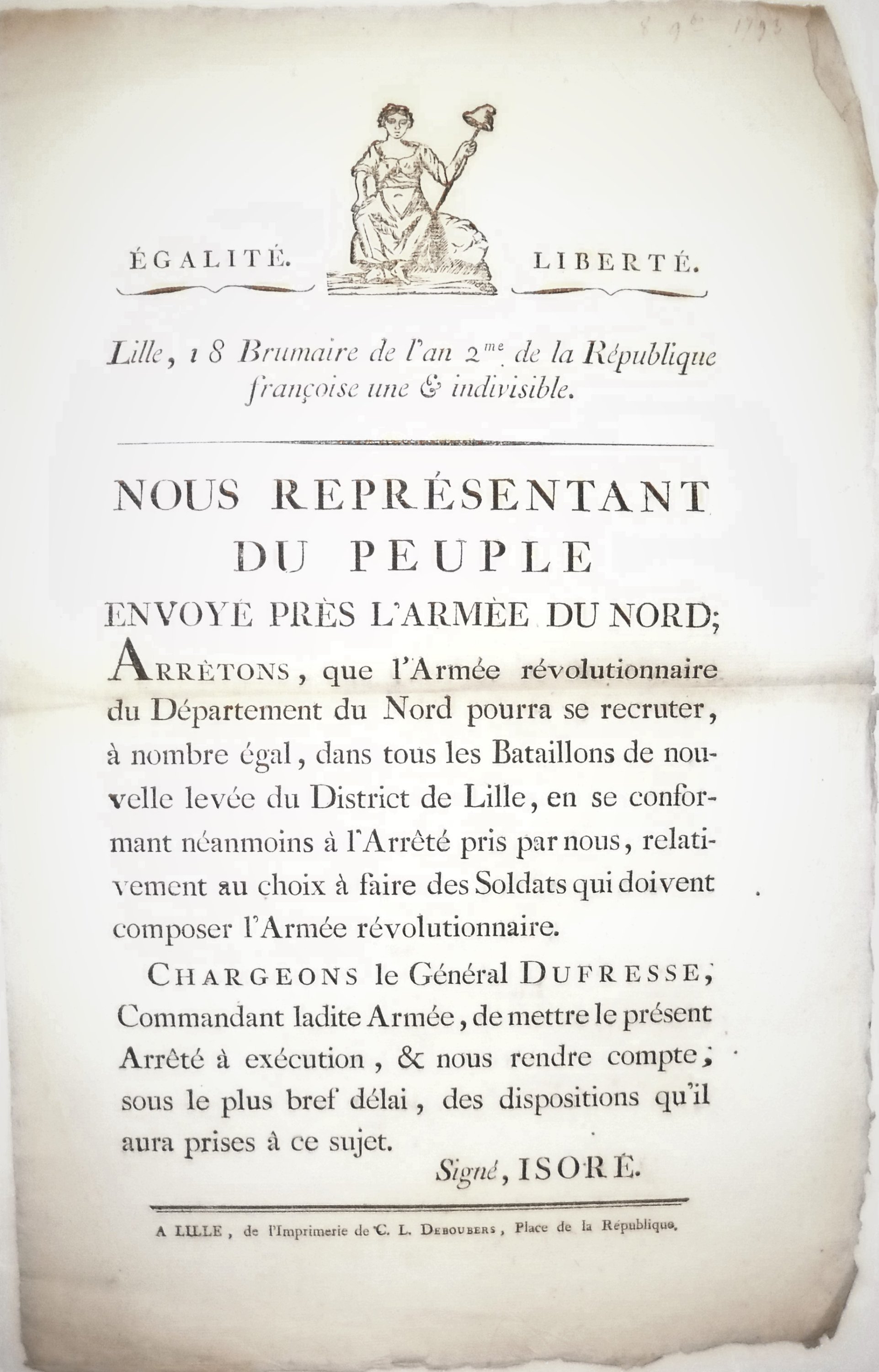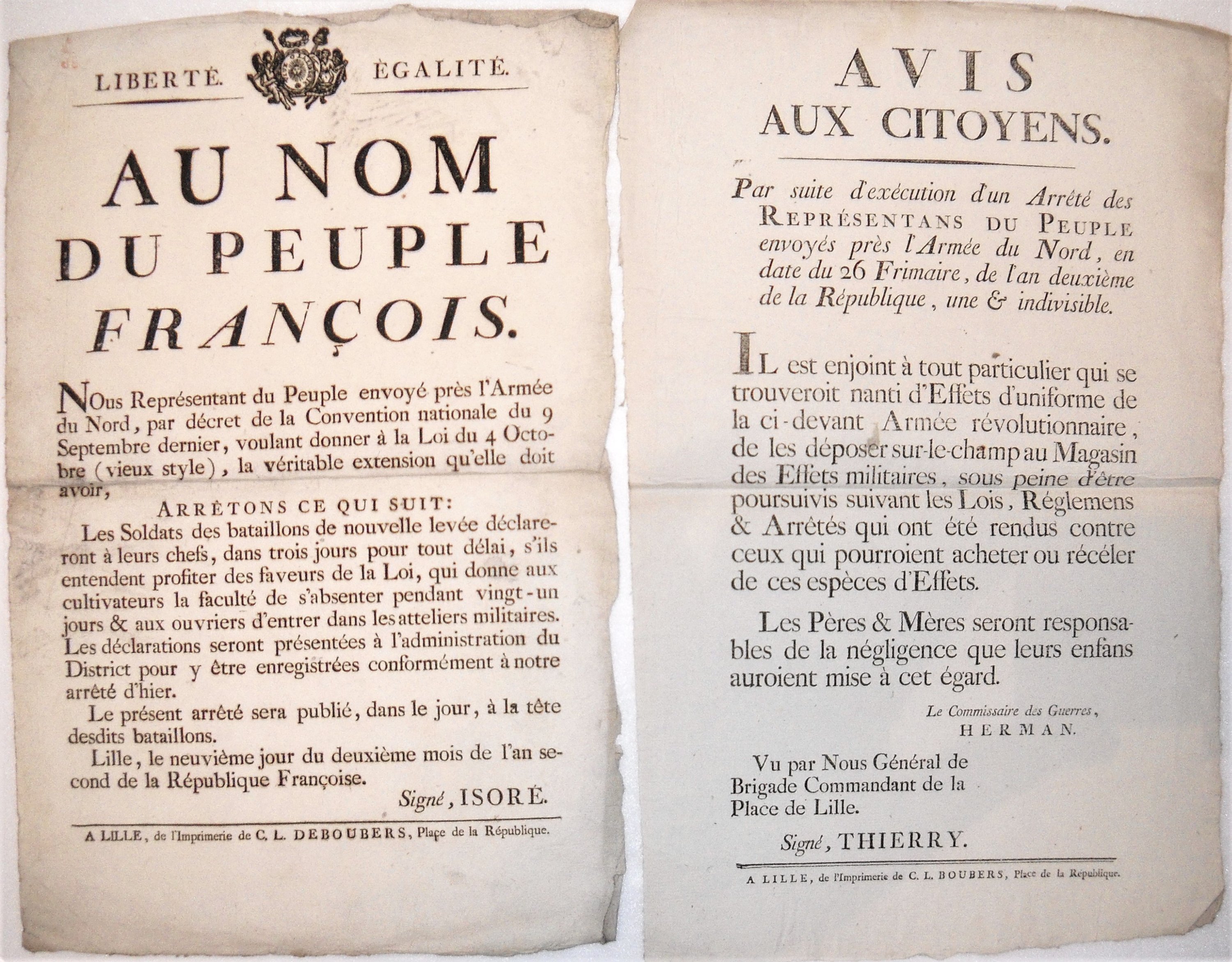 " [Le 5 avril 1793, les conventionnels dévoilent la trahison du général Dumouriez et appellent à sa punition, comme à celle de tous les traîtres.] - " Les administrateurs du département du Nord à leurs concitoyens ", Douai, 6 avril 1793, placard imprimé, 45 x 35 cm - 3 placards de l'an II imprimés par Deboubers à Lille, 41 x 26 cm - Tract " Vive La république ", an II, imprimé par Boubers à Lille, 1 page in-4.