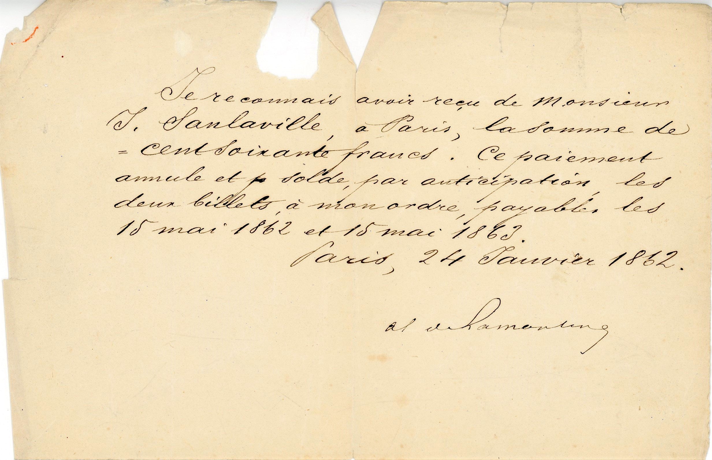 " (petite déchirure) ; et P.A.S., Paris, 24 janvier 1862, quittance (accdts et manques).