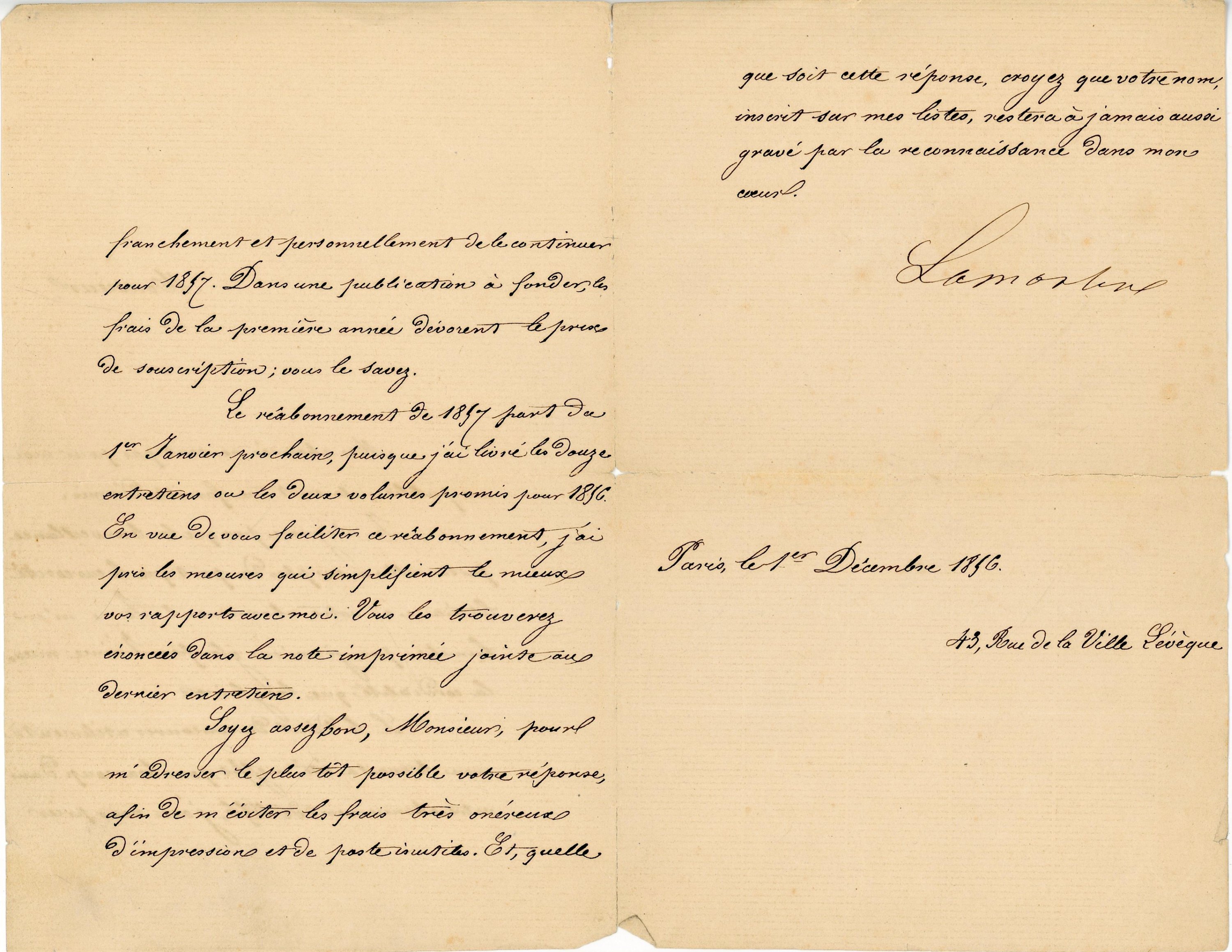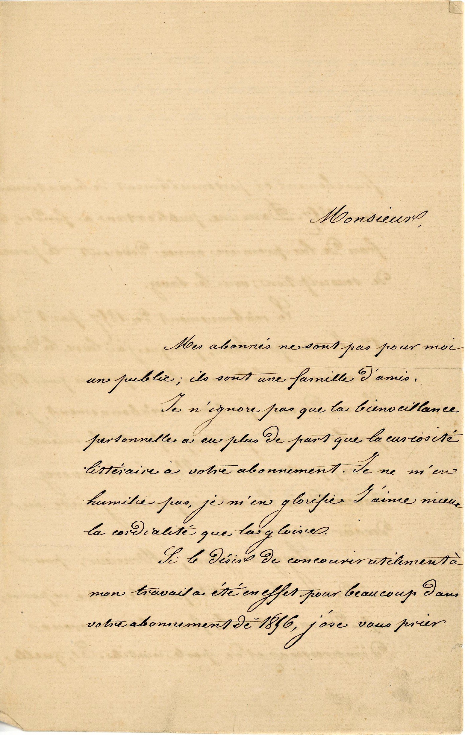 L.S., Paris, 1er décembre 1856, 2 pages ¼ in-8: " Monsieur mes abonnés ne sont pas pour moi un public ; ils sont une famille d'amis. Je n'ignore pas que la bienveillance personnelle a eu plus de part que la curiosité littéraire à votre abonnement. Je ne m'en humilie pas, je m'en glorifie. J'aime mieux la cordialité que la gloire
