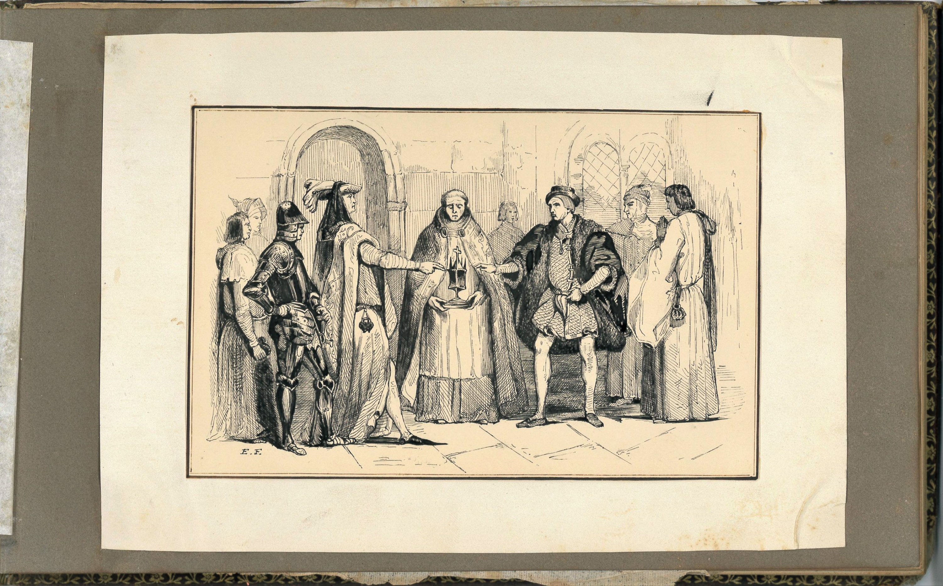 Album amicorum, format à l'italienne, reliure en maroquin (en l'état), 17 x 26 cm, dos et tranches dorés, plats ornés de filets dorés et de décors de fers à froid, monogramme " A. de M. " au centre, contenant env. 37 feuillets sur lesquels sont écrits ou collés des textes manuscrits: poèmes, textes en proses, récits, partitions musicales, ainsi que des dessins au crayon et à la plume, c. 1841-1846.