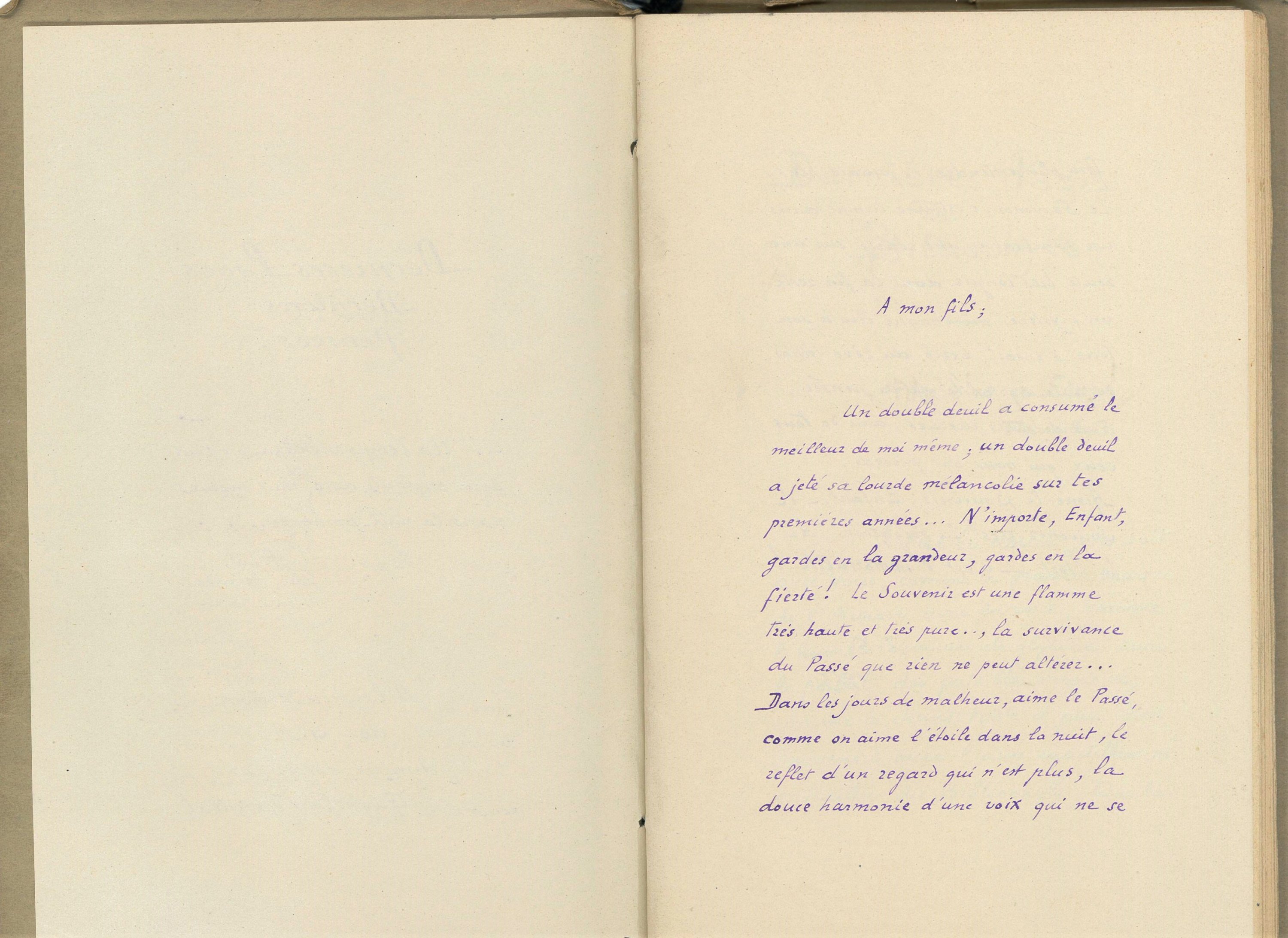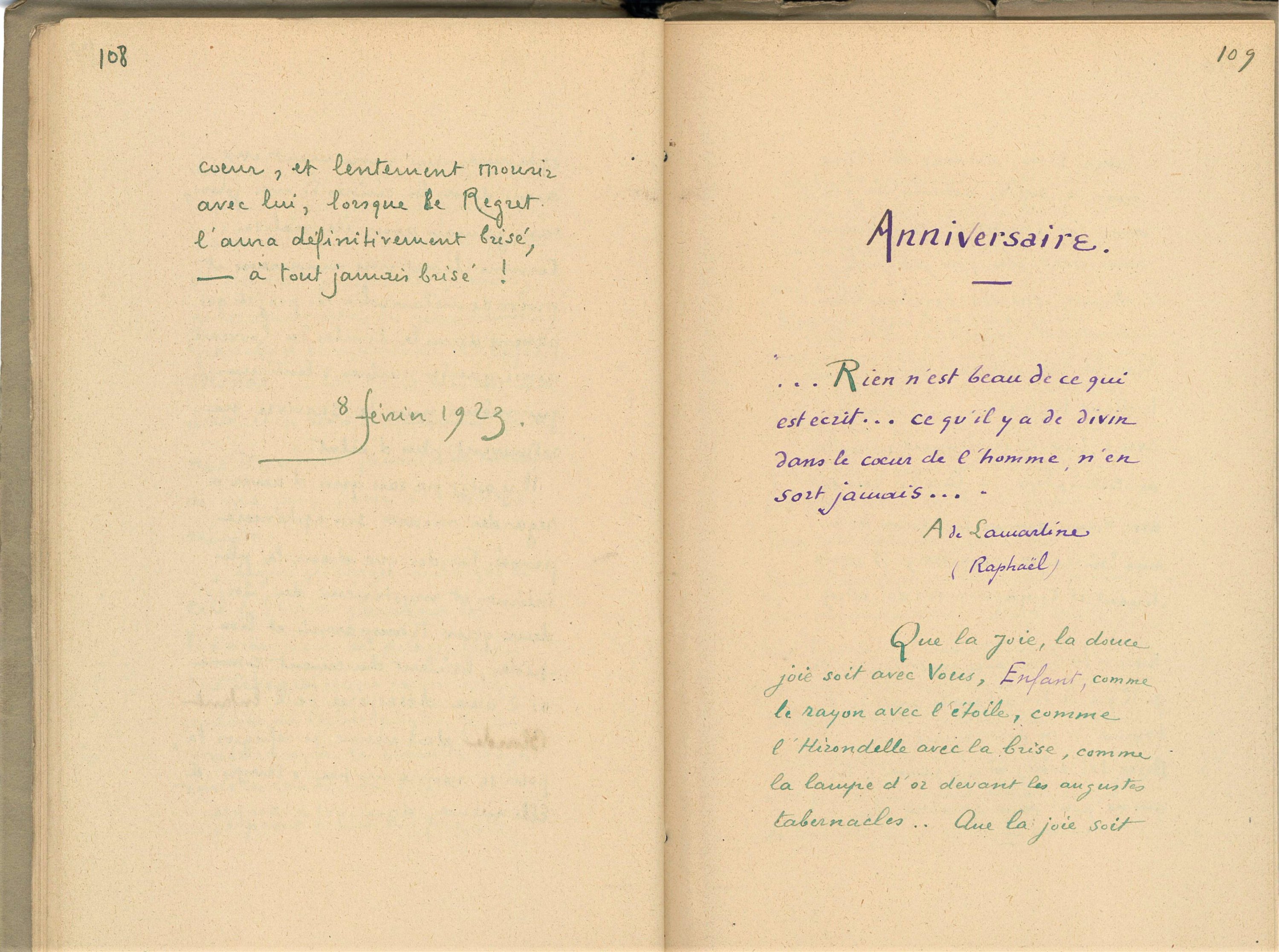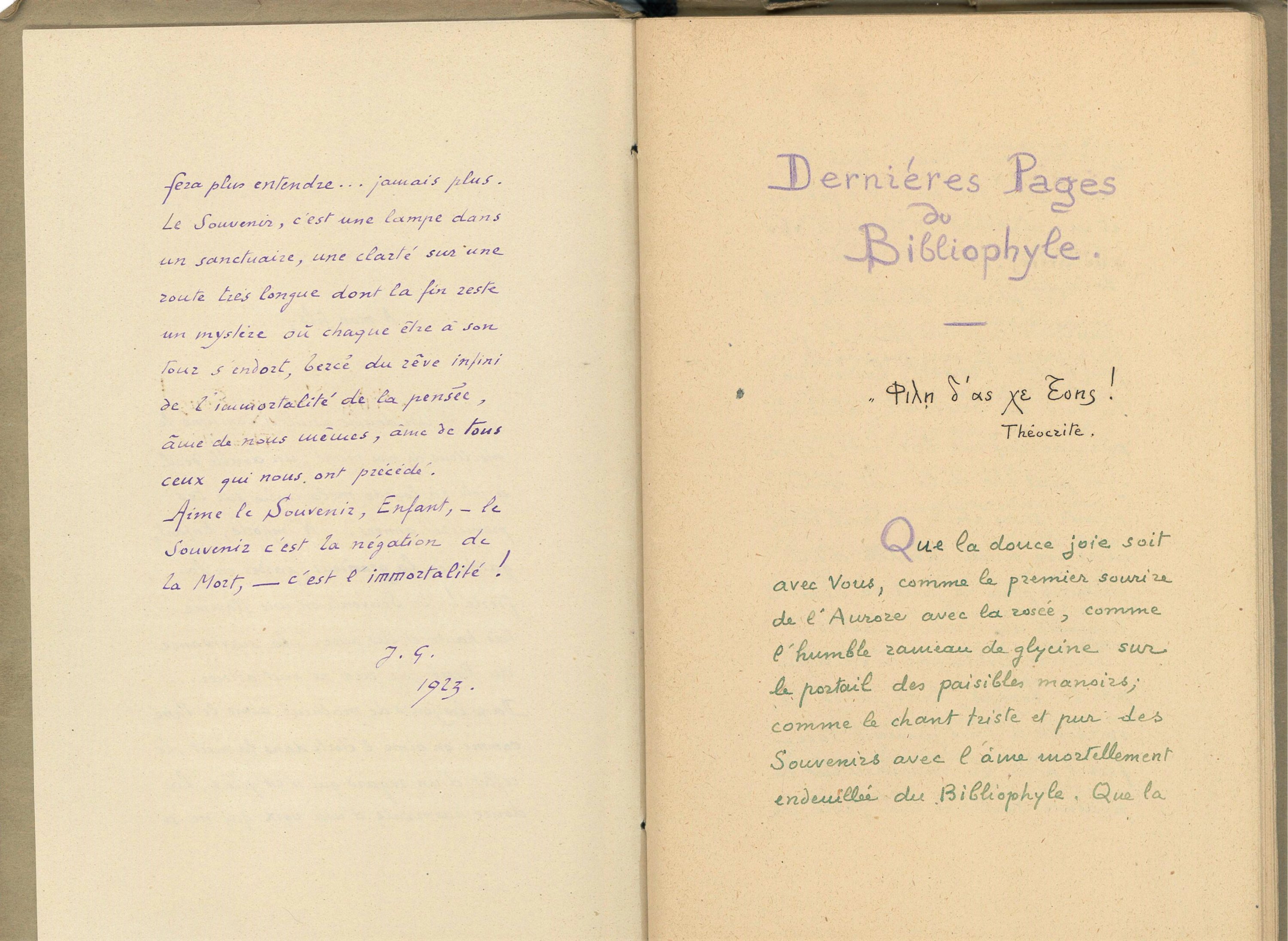 " DERNIERES PAGES DERNIERES PENSEES " Manuscrit autographe inédit, daté du 7 mars 1923, signé " J. G. ", écrit à l'encre violette, verte brune, petit cahier in-8, 113 pages. Joli texte en prose, ponctué de citations littéraires, composé par un " vieux " bibliophile parisien narrant la rencontre du collectionneur solitaire et d'une petite fille blonde devenue femme, éprise de littérature et qui éblouira son existence, auquel il dédie cette uvre " A la chère mémoire de: G. M. dernière descendante de Guglielmo Marcillat ".