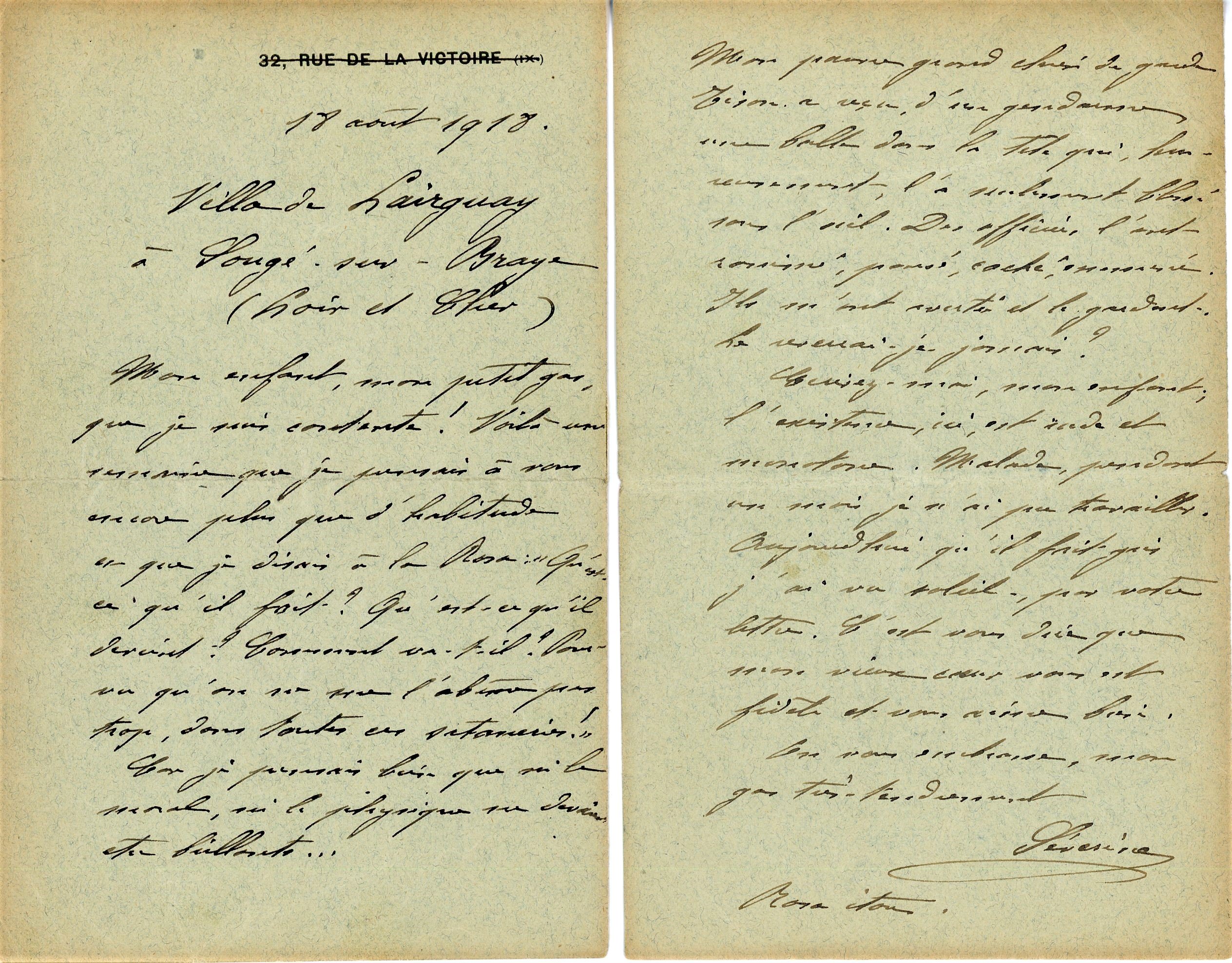 Belle et rare L.A.S. écrite de son exil, datée du 18 août 1918, Villa de Hairguay [L'Air-Gai] à Sougé-sur-Braye (Loir-et-Cher), adressée à son protégé " Gabi " [Gabriel Nigond], lui prodiguant ses conseils pour la publication de son prochain ouvrage, 6 pages in-8