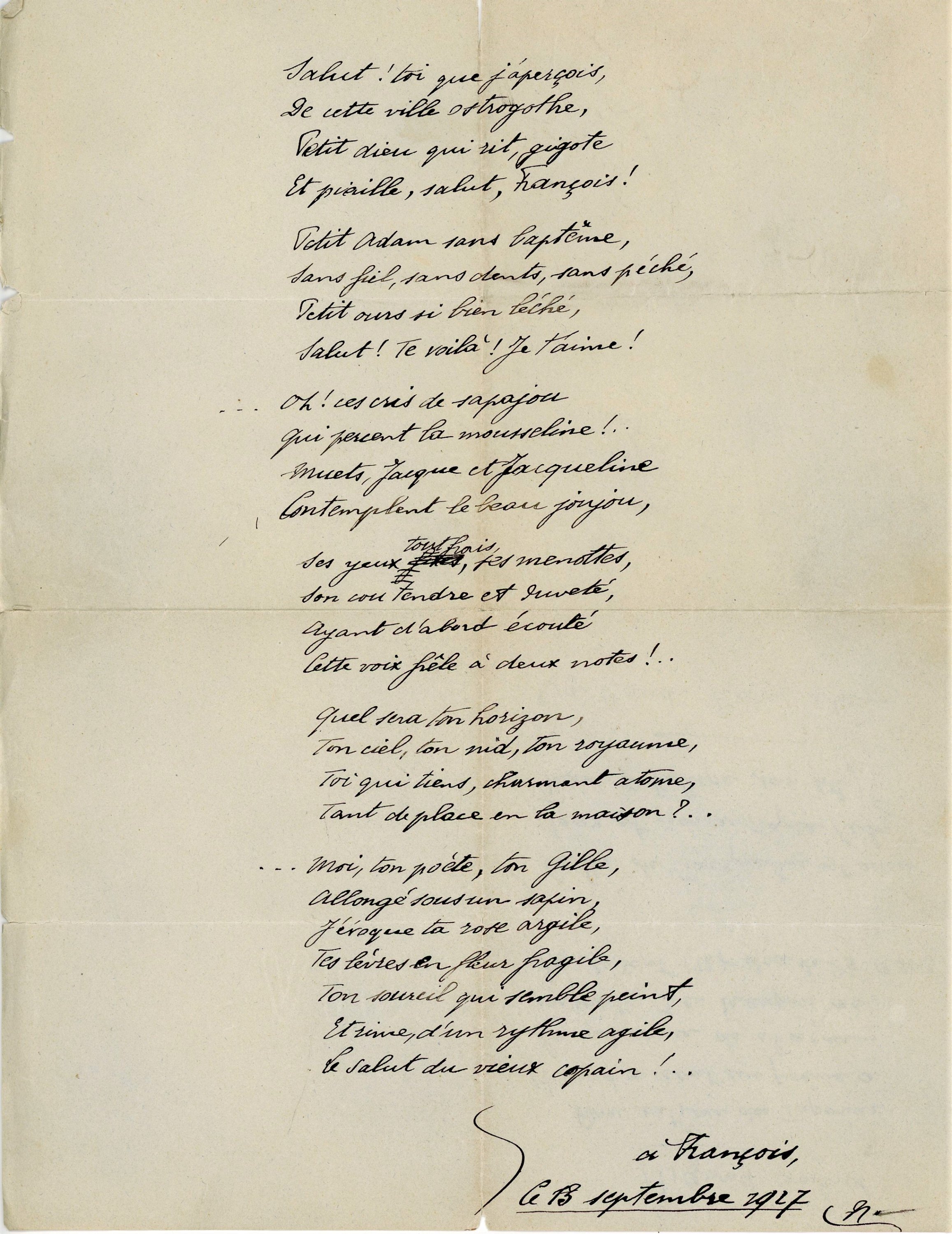 Joint: poème autographe manuscrit de Gabriel Nigond, ami intime des Taponier, daté du 13 septembre 1927, 1 page in-4, dédié " à François ", fils de Pierre Taponier né le 10 septembre 1927.