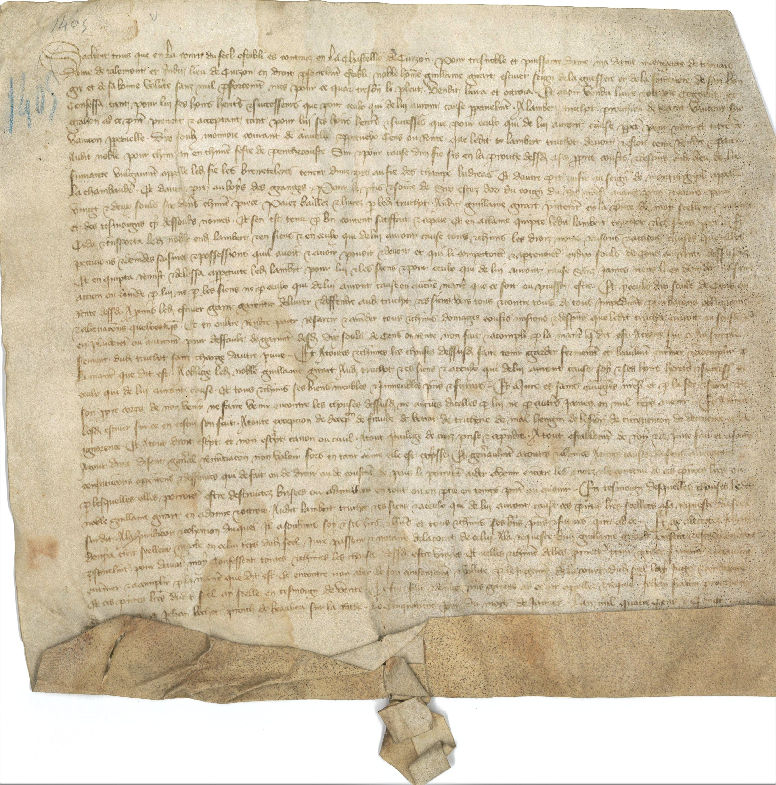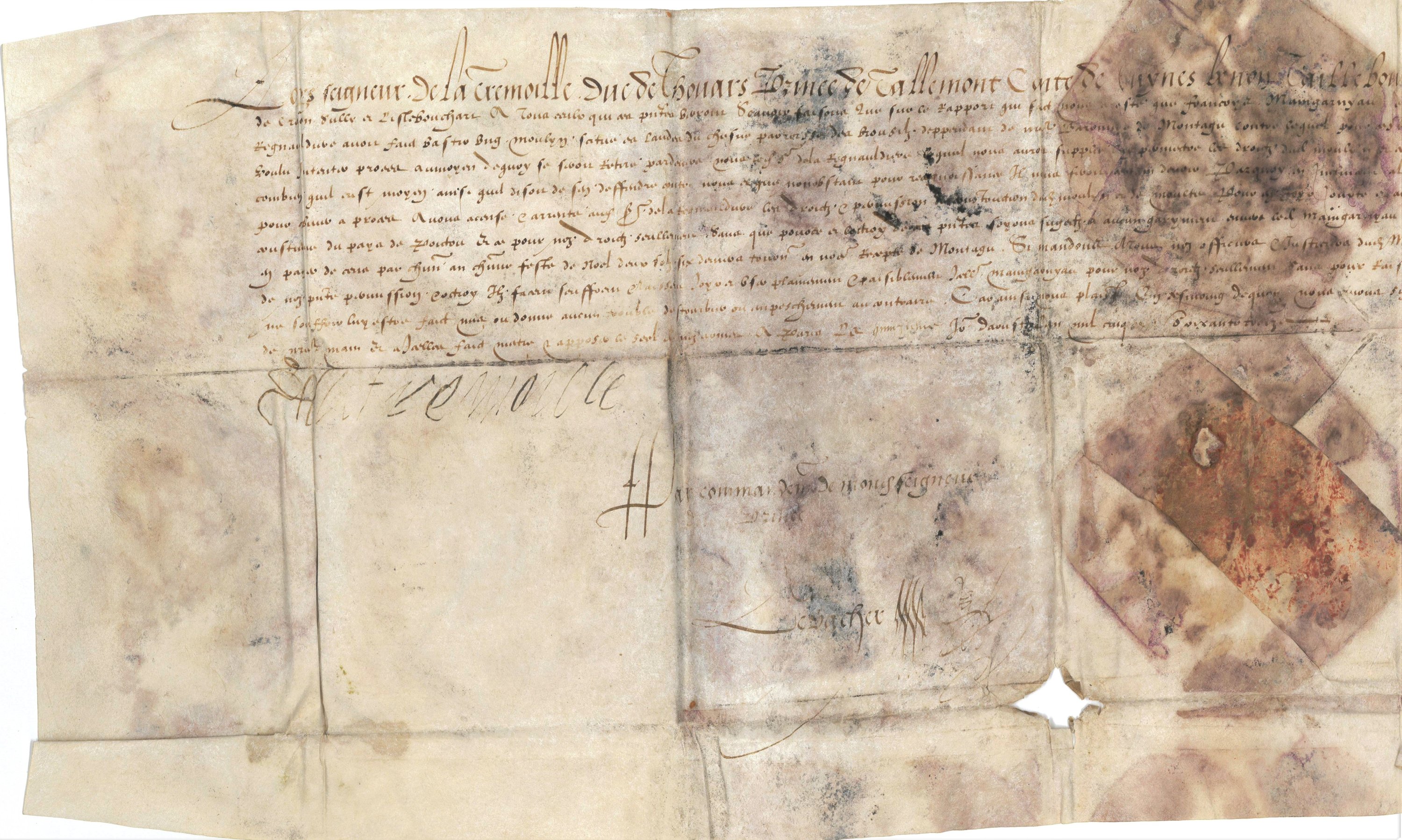 9 pièces, 1600-1660, relatives à Mathurin de MONTSORBIER, chevalier, seigneur du Grand-Plessis à Aizenay ; 2 pièces, 1597-1598, relatives à François POITEVIN, écuyer et seigneur du Plessis-Landry ; 1 pièce, janvier 1405, relative à Marguerite d'AMBOISE, vicomtesse de Thouars, dame des Ollones et des Sables, épouse de Louis 1er de la Trémoille, prince de Talmont ; 1 pièce, avril 1573, signée par Louis III de la TREMOILLE, duc de Thouars, prince de Talmont et de Tarente, au sujet du moulin bâti en la paroisse des Brouzils par François Maingarnyau sieur de la Regnardière ; 1 pièce datée du 8 mars 1452 ; 1 pièce, 1610, accompagnée de plusieurs notes manuscrites sur papier du XIXe siècle relatives à la généalogie de la famille Robineau en Vendée.