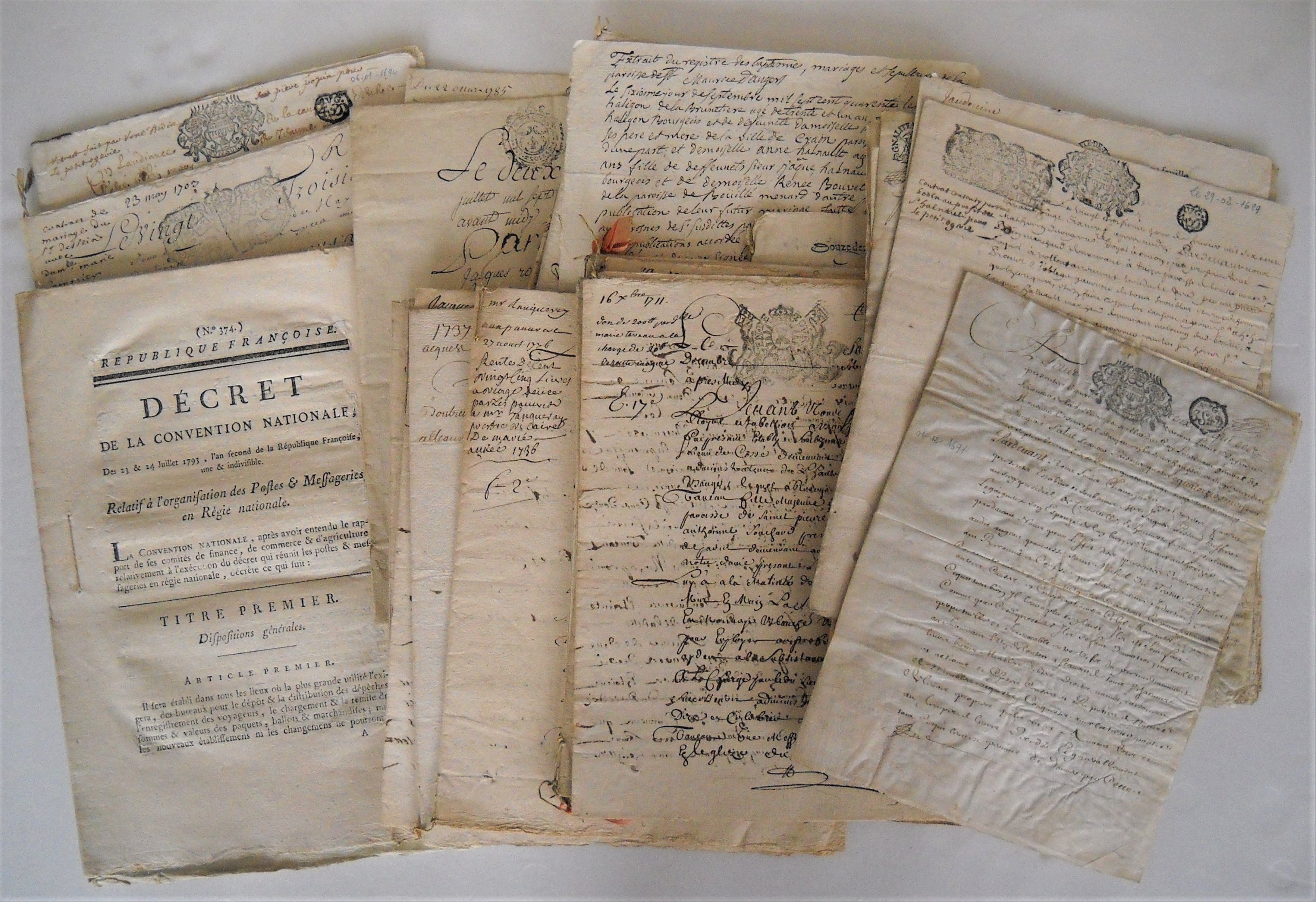 Lot d'env. 40 pièces, fin du XVIIe et XVIIIe siècles ; grosses et expéditions d'actes civils de notaires et divers, chaque pièce surchargée du cachet de la " Généralité de Tours ".