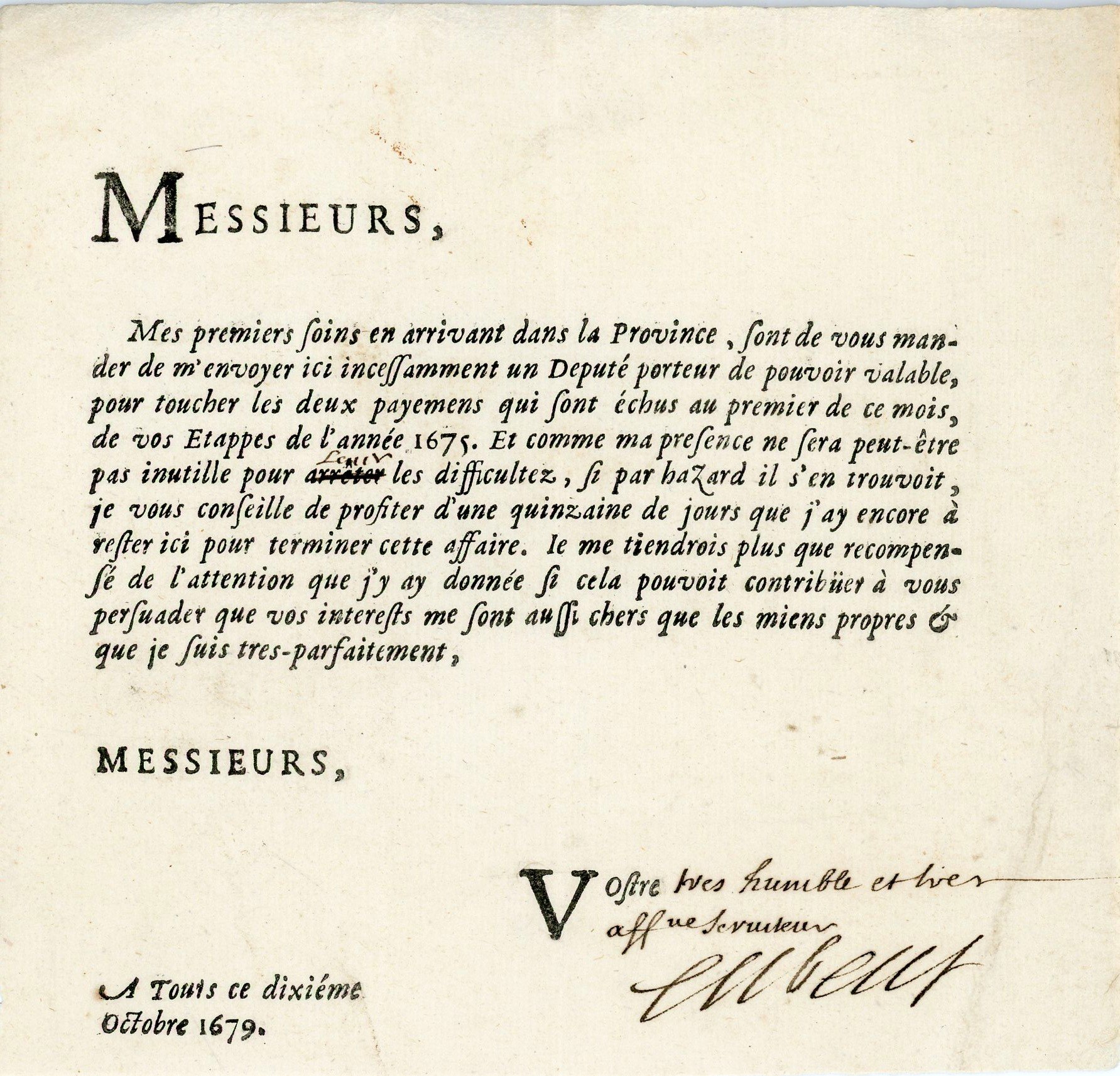 Joint: P.S., 1679, Charles TUBEUF, intendant de la généralité de Tours.