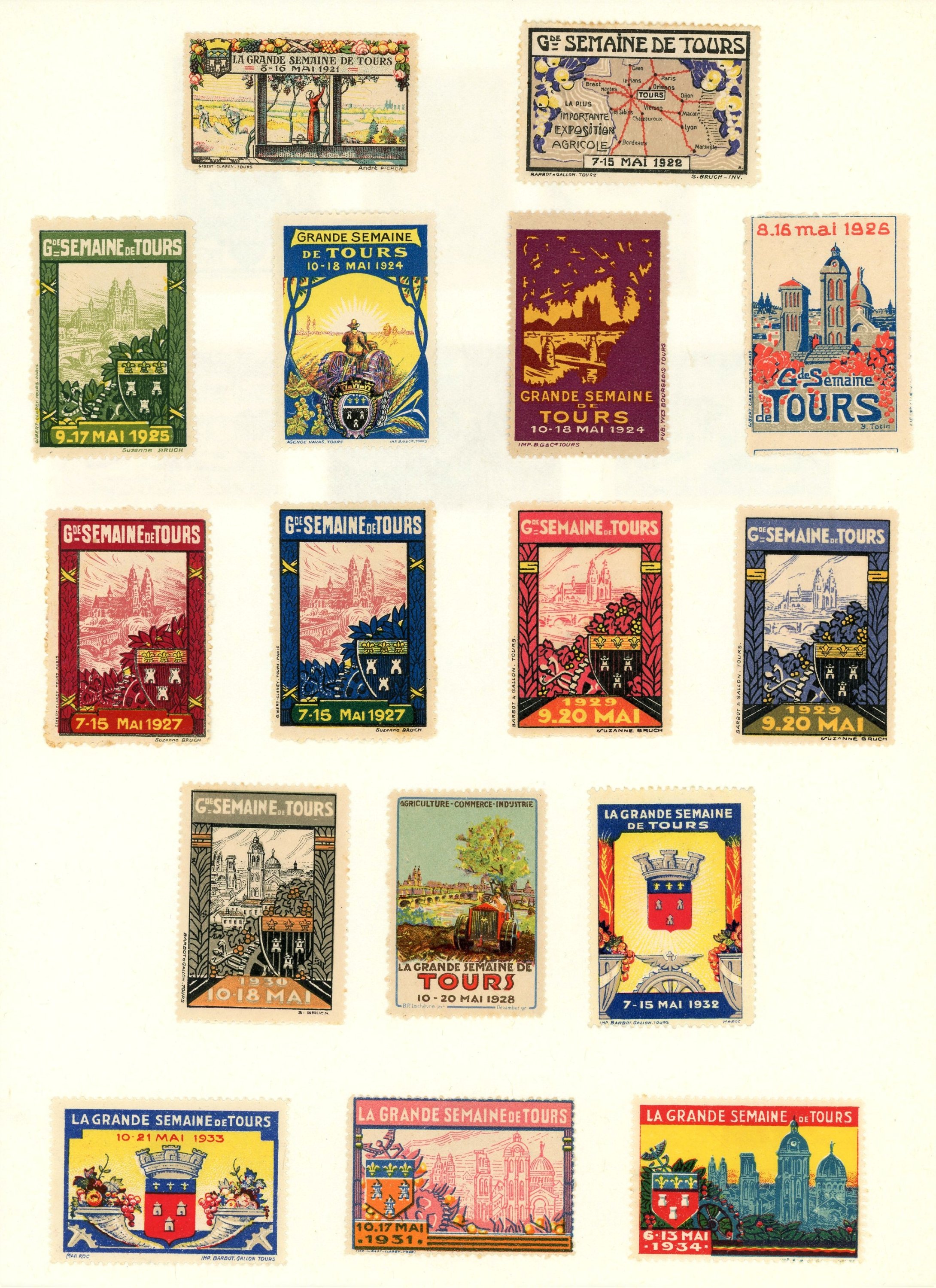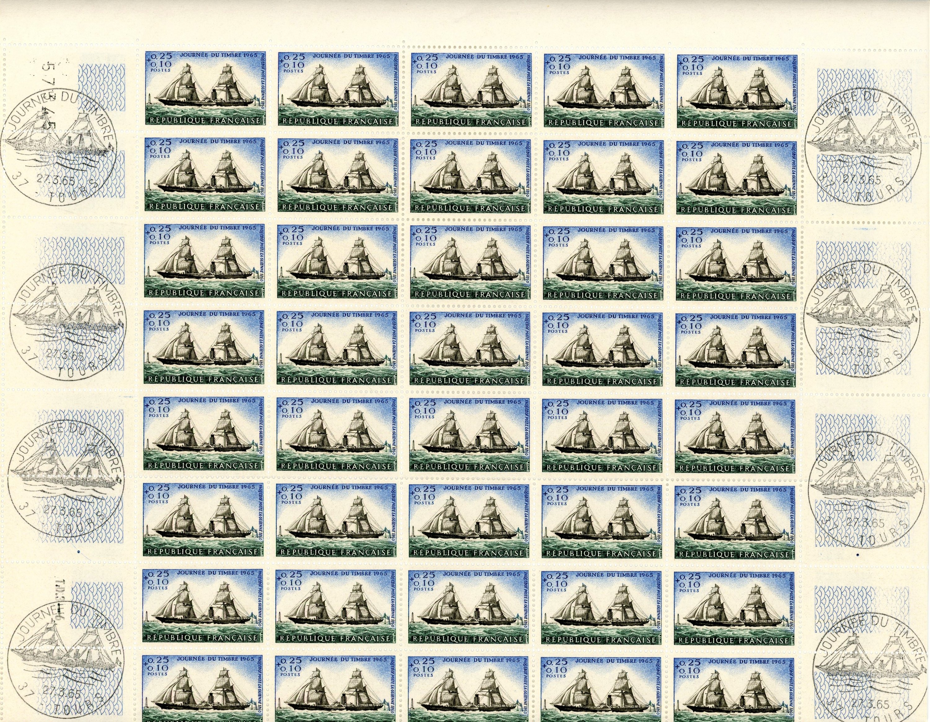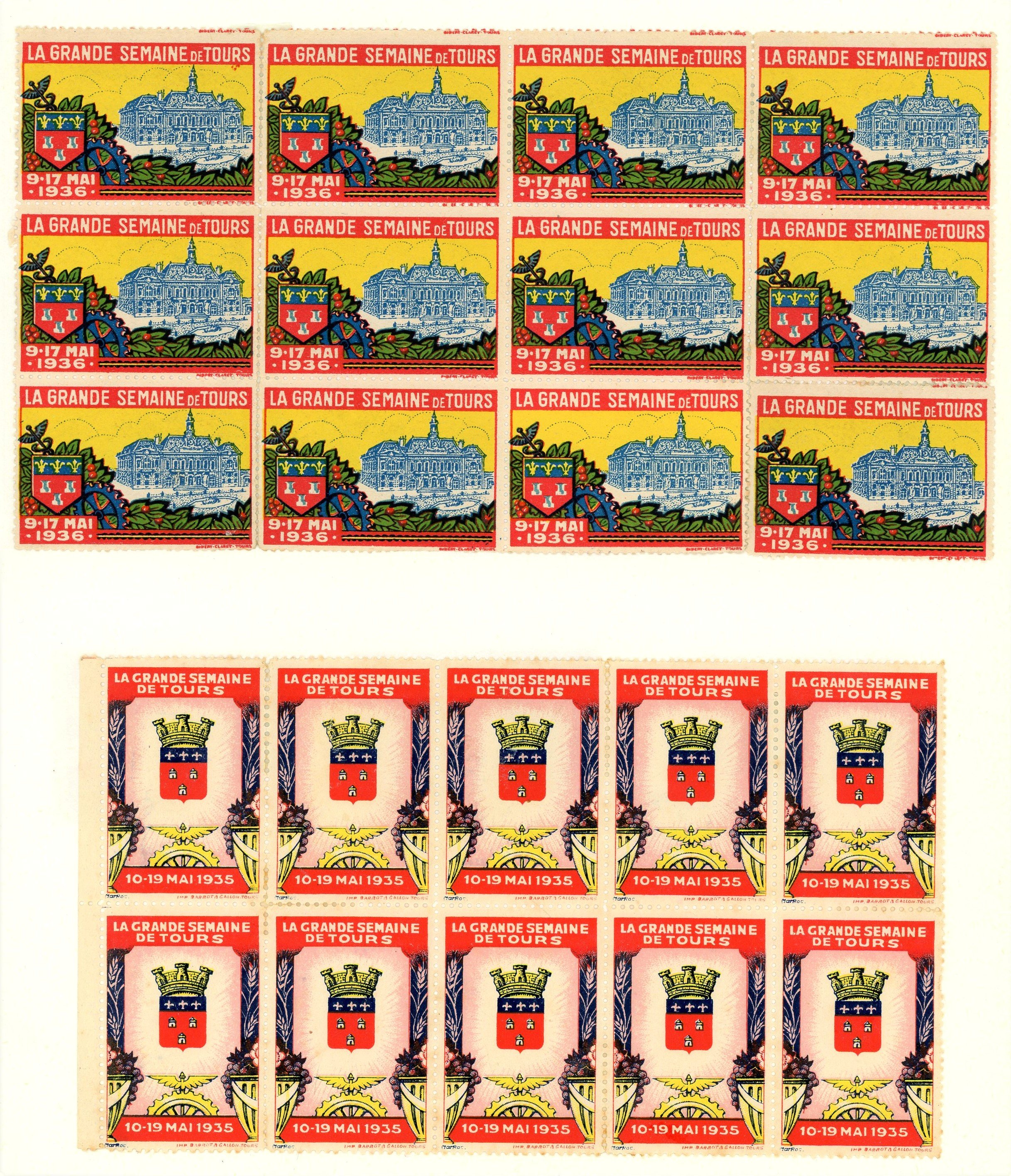 Lot de timbres et planches de timbres non affranchis illustrés des monuments et événements de la ville de Tours, XXe siècle.