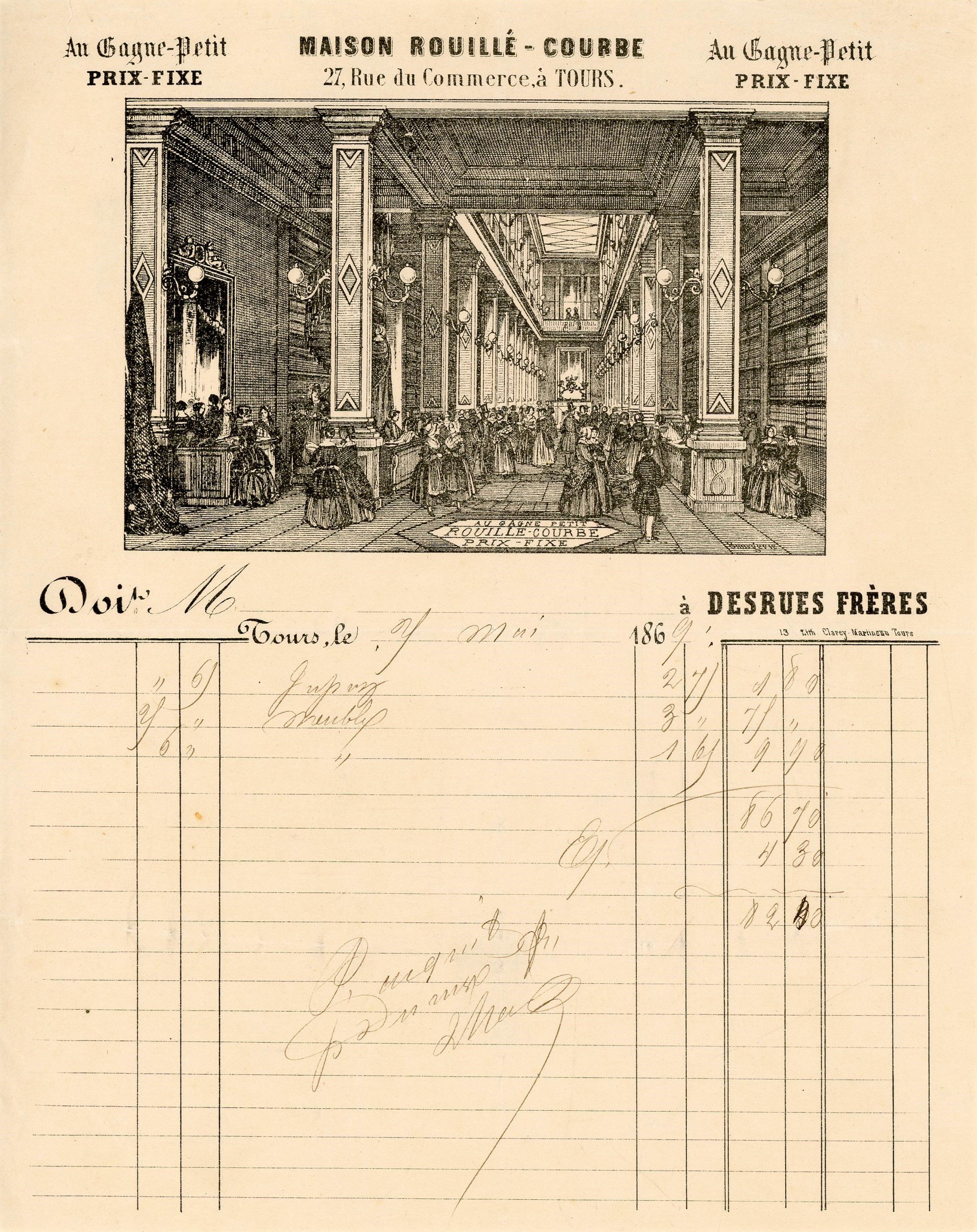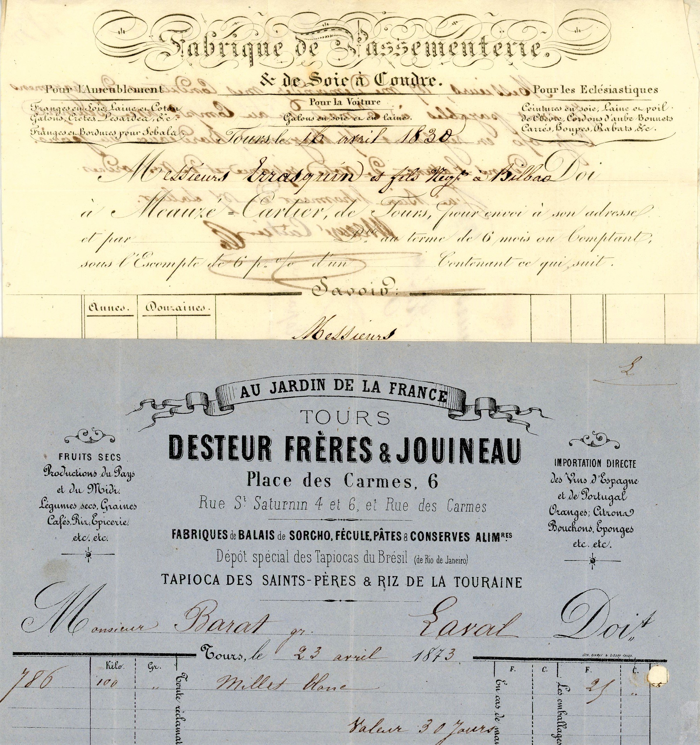 Lot de + de 40 pièces, en majorité écrites de la ville de Tours, fin du XVIIIe et XIXe siècles. Dont lettres à entêtes et vignettes - Correspondance de commissionnaires en vins de Vouvray dont L.A.S. de Prudent-Jean BRUSLEY (1759-1847), ancien maire de Tours et député: " 30 mai 1841, à l'exposition brillante qui vient d'avoir lieu à Tours de nos produits industriels et de ceux des départements limitrophes, il a été présenté par M. Benoît mécanicien un petit modèle d'un pressoir à engrainage de son invention. Suivant le prospectus qu'il a répandu, il paraît que ce pressoir a été adopté avec succès dans un certain nombre de départements et notamment par vous dans l'Ardèche. M. Benoît, instruit, je ne sais par qui, que je possède un grand vignoble et que je suis ami des arts, a pris la peine de venir à ma campagne pour me donner connaissance de son modèle. Le système de nos pressoirs en bois est si grossier, si inintelligent et d'un entretien dispendieux que je me déciderais de suite en faveur du nouveau système si j'avais la certitude que lui-même ne comporte pas des inconvénients plus graves