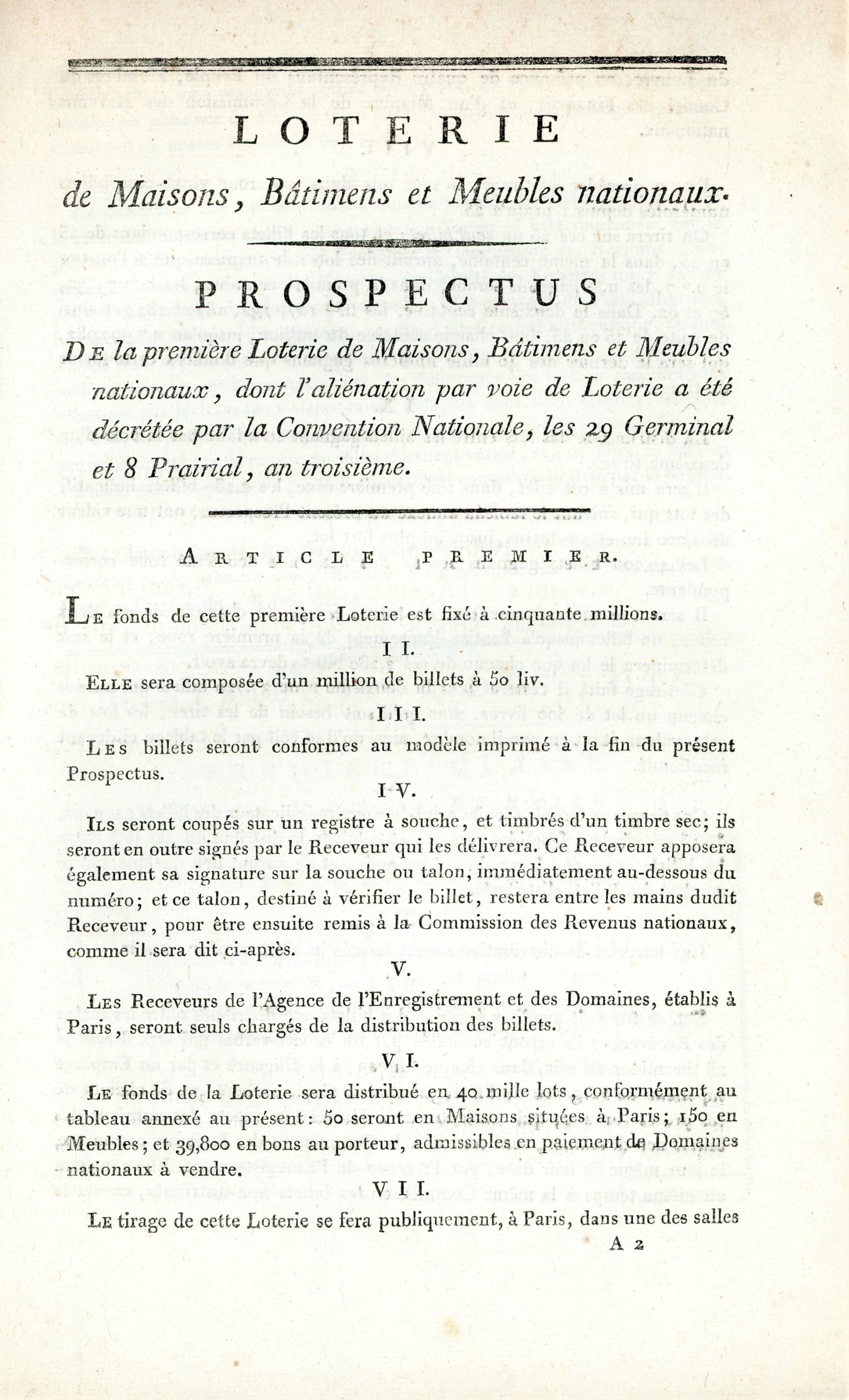 " Prospectus de la loterie nationale de maisons, meubles et objets précieux… ", an III, 24 pages in-4 ; règlement détaillé du déroulé et liste des lots des biens aliénés à distribuer aux gagnants (50 maisons à Paris, 150 en meubles et 39 800 bons au porteur). Joint suite de 13 billets de 50 francs payés par le porteur pour participer au tirage de la loterie du mois de fructidor an III. Rare ensemble.