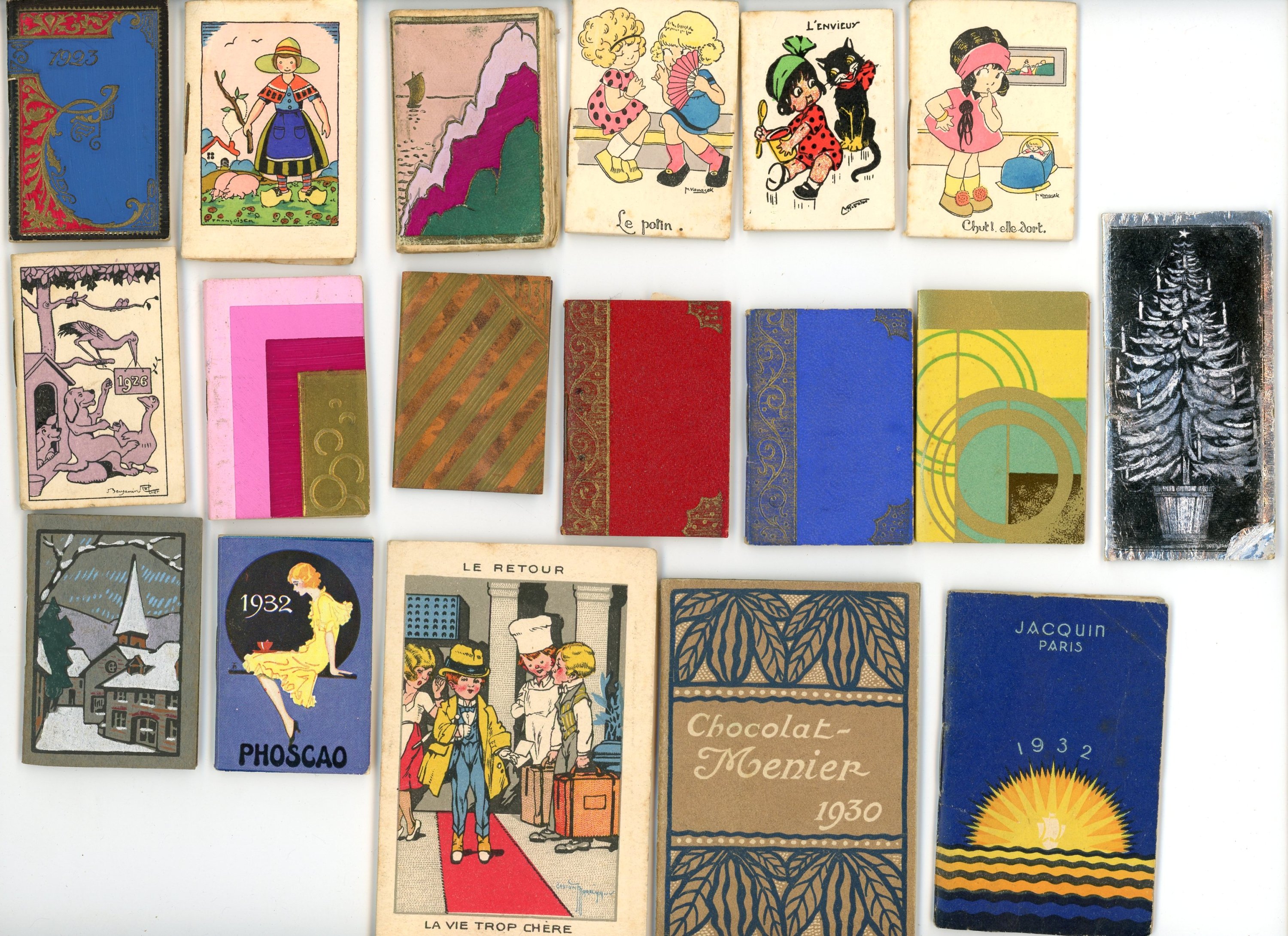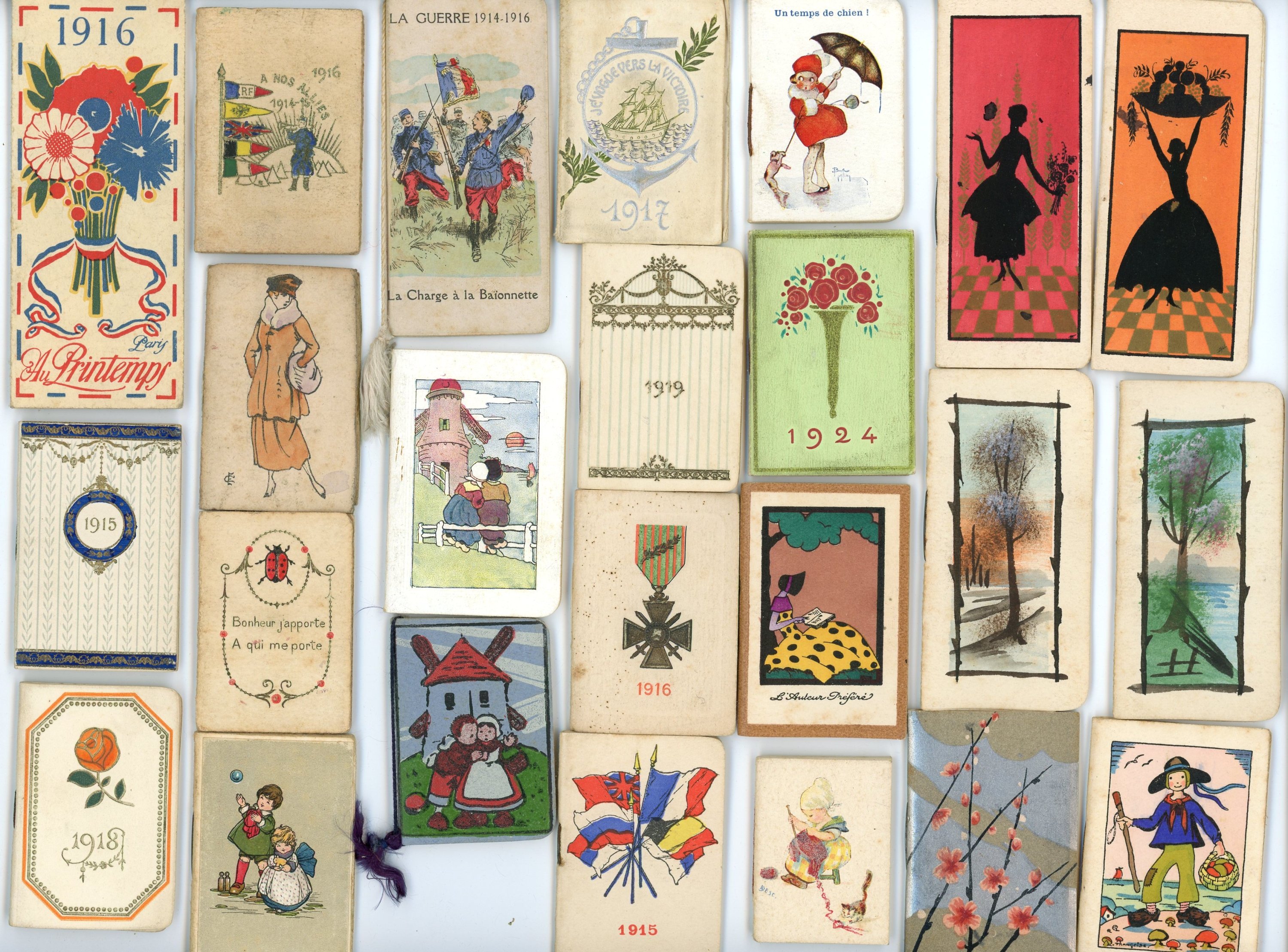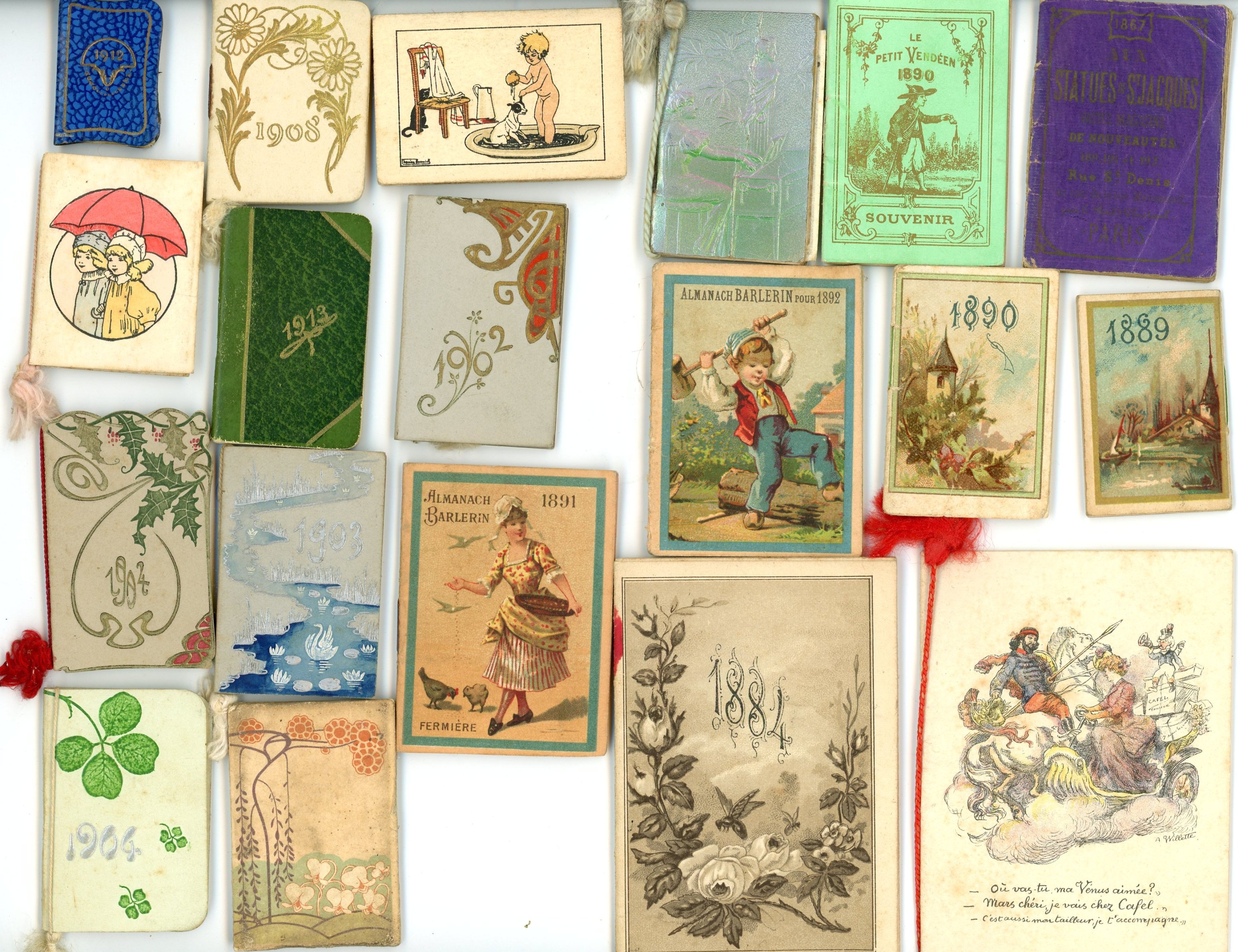 + de 200 mini calendriers et mini almanachs publicitaires dont années 1860-1890 (17), 1900-1914 (48), 1914-1919 (22), années 1920 (43), années 1930 (52), etc ;