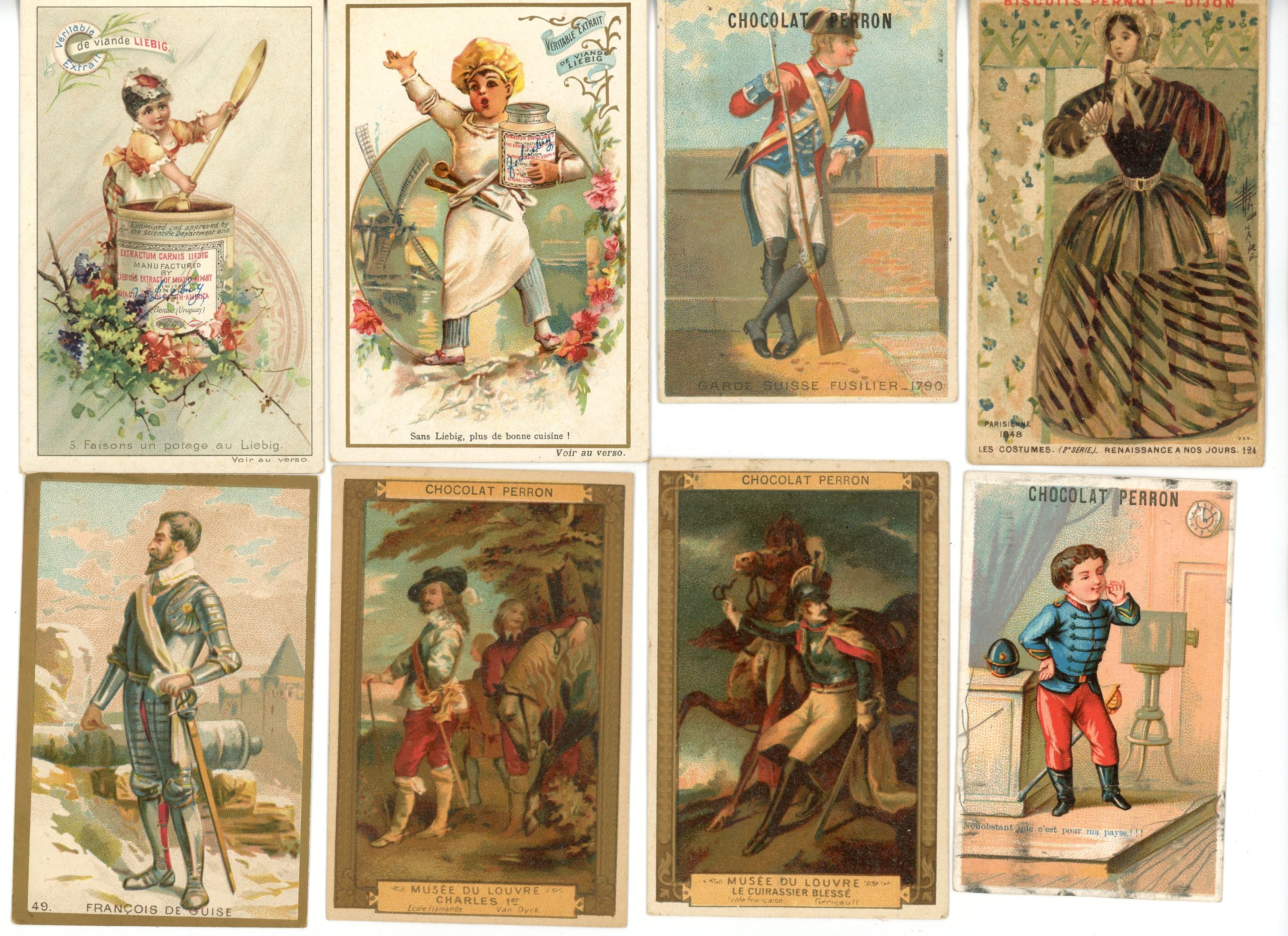 Env. 75 chromos publicitaires, en majorité d'Angers (Crémieux, Godin, Courjaret, Doineau, Mauboussin), Biscuits Huntler & Palmers (4), Biscuits Pernot à Dijon (1), Chocolat Poulain (3) Chicorée Arlatte à Cambrai (2), Chocolat Perron (17), etc ;
