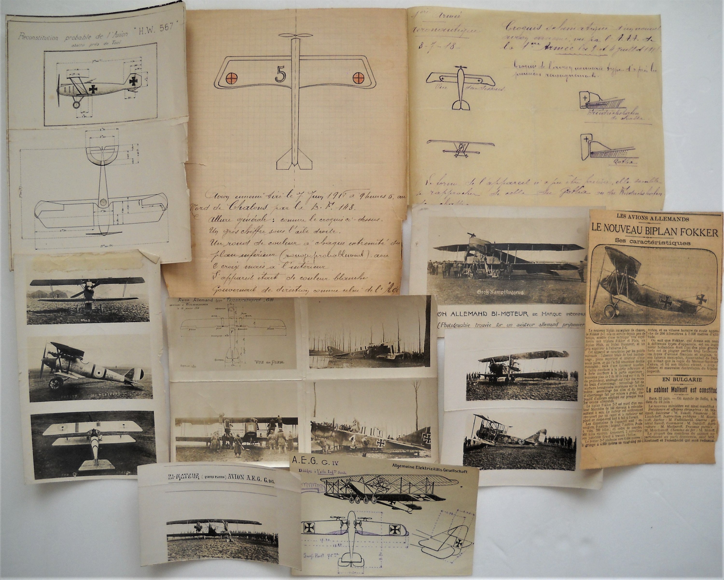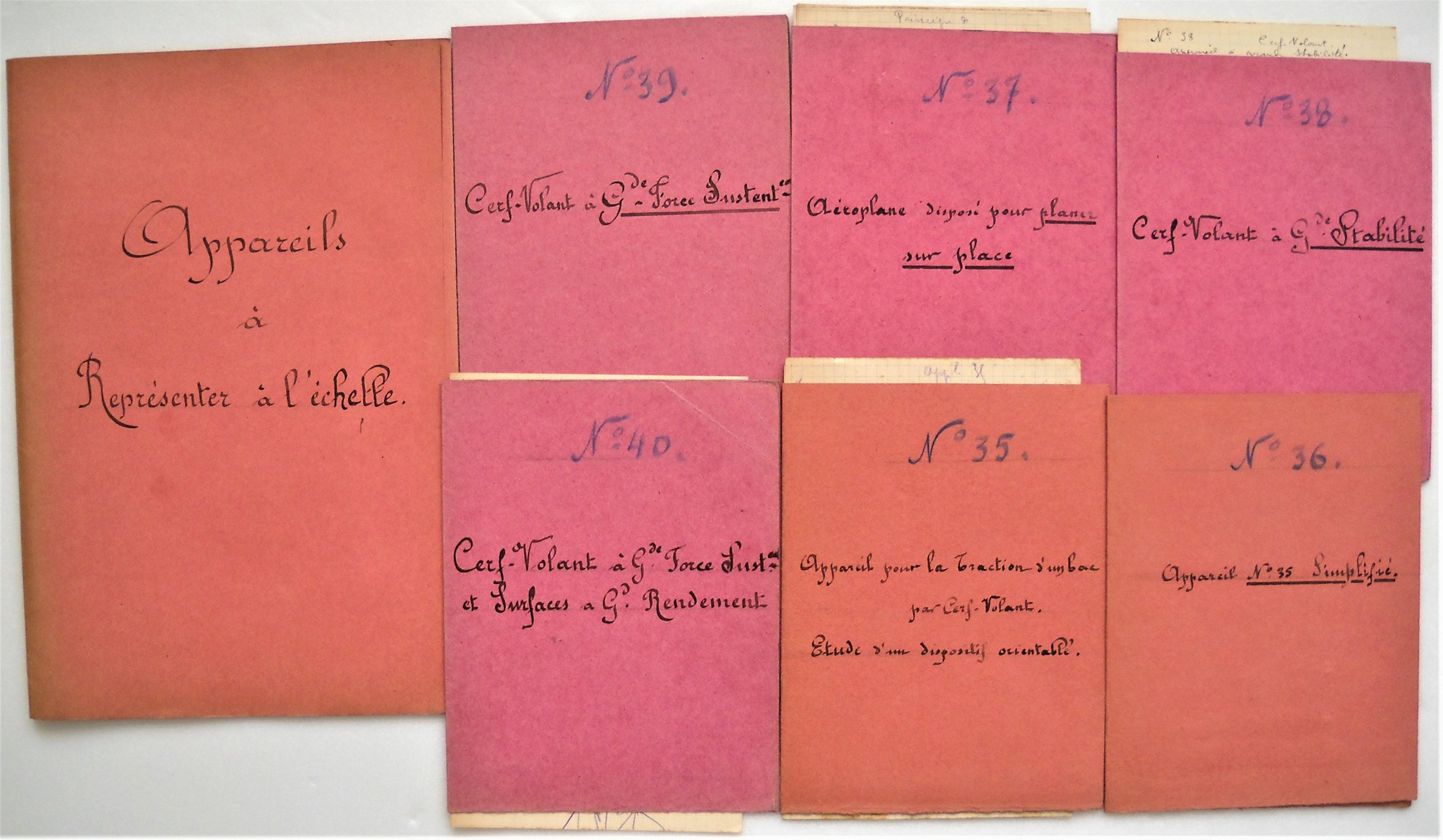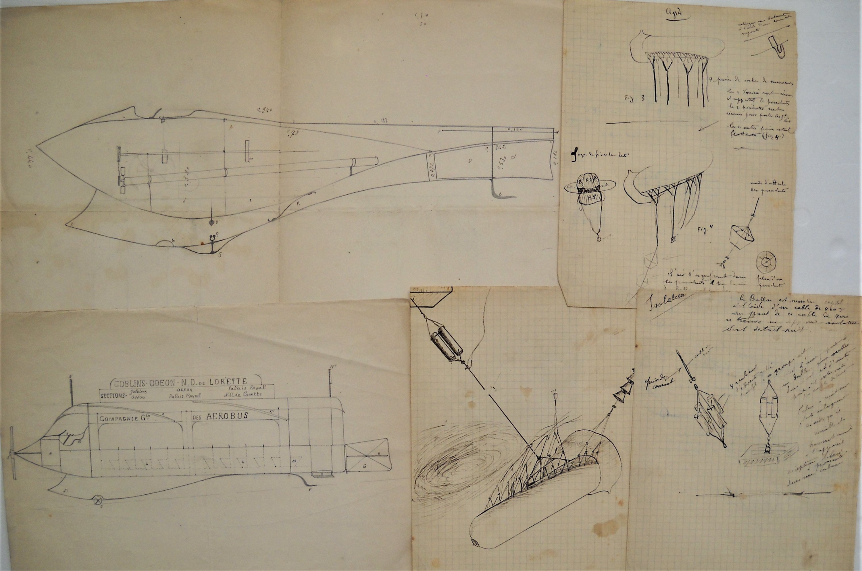 Réunion de plans, croquis, notes, photos et publicités, 1900-1920, dont plans sur calque et bleus d'un volateur dénommé le " Darnocuollith " dont certains signés " G.C. " ; croquis d'inventions d'aéroplanes et d'aérobus ; photos de modèles de monoplans allemands ; etc.