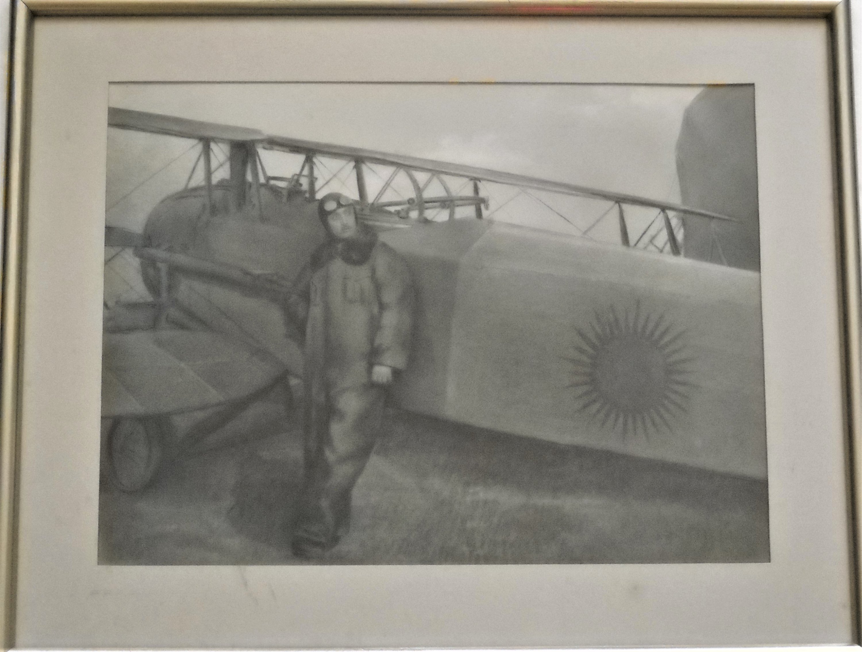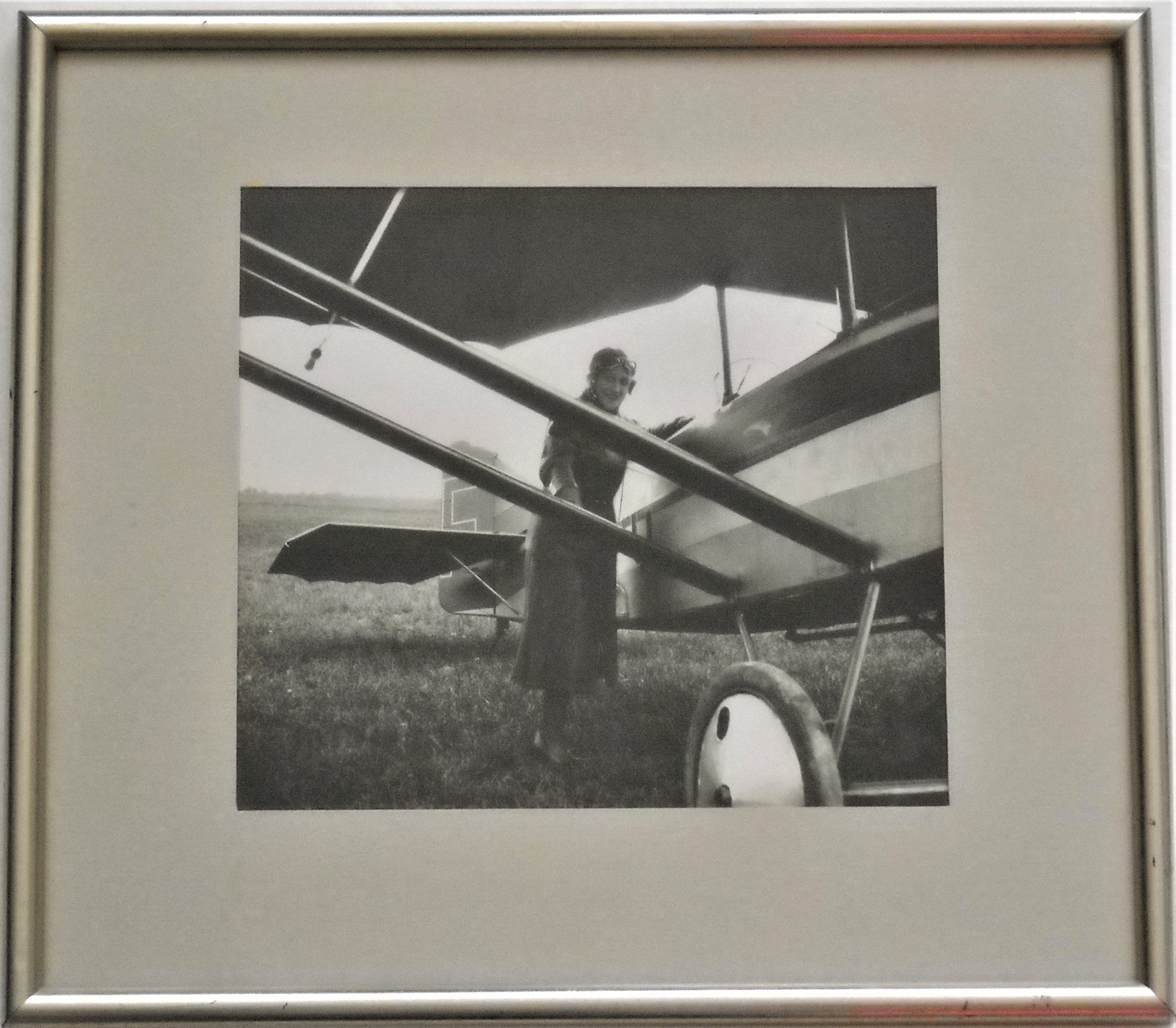 Joint: Tirage photographique d'une aviatrice posant au côté d'un Caudron C270 Luciole? à l'aéro-club de l'Avionnette Paris, vers 1930, sous cadre, 27 x 30 cm ; Gravure ou dessin représentant un pilote adossé à un avion à décor d'un emblème au soleil rayonnant sur le fuselage, sous cadre, 41 x 51 cm.