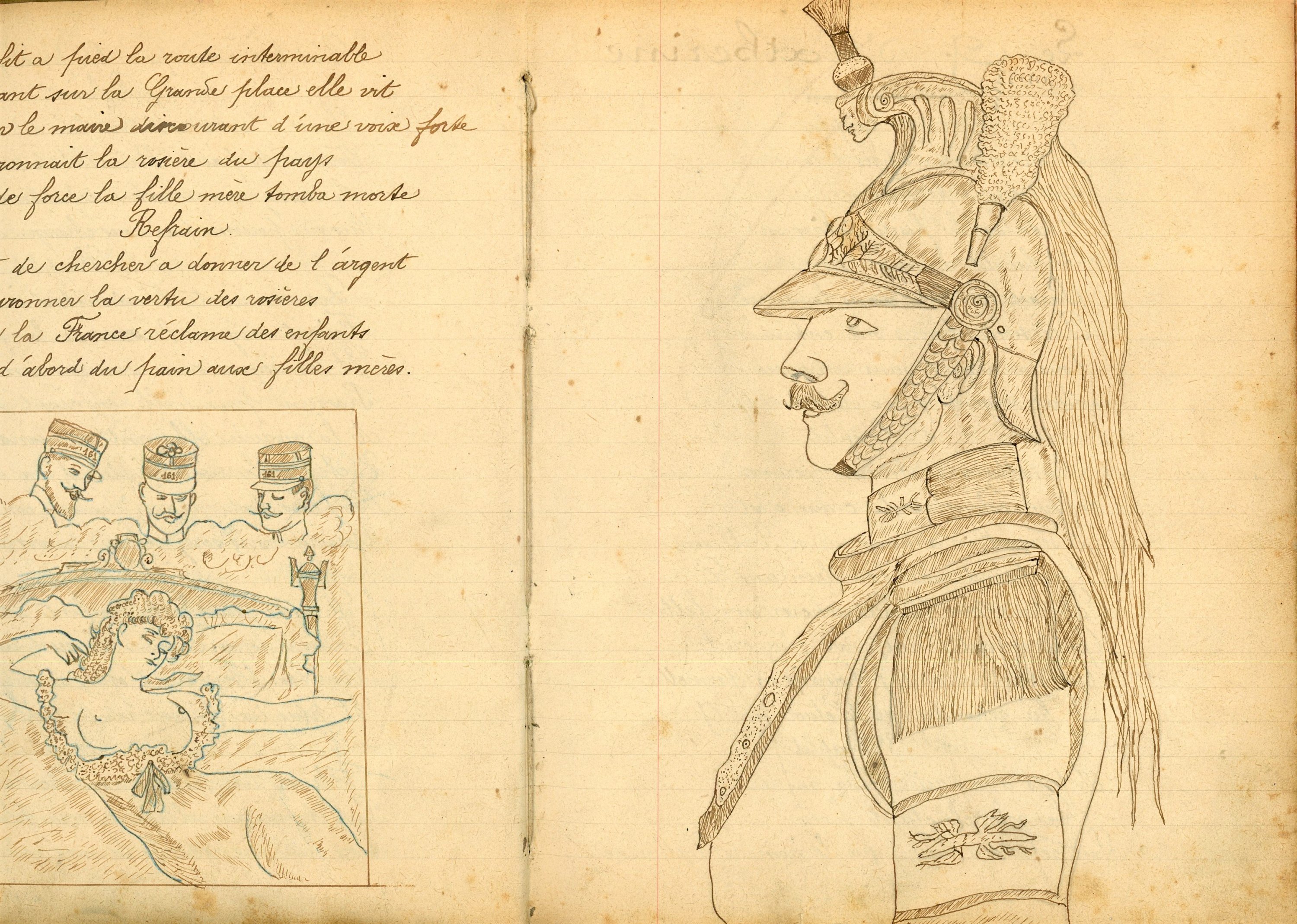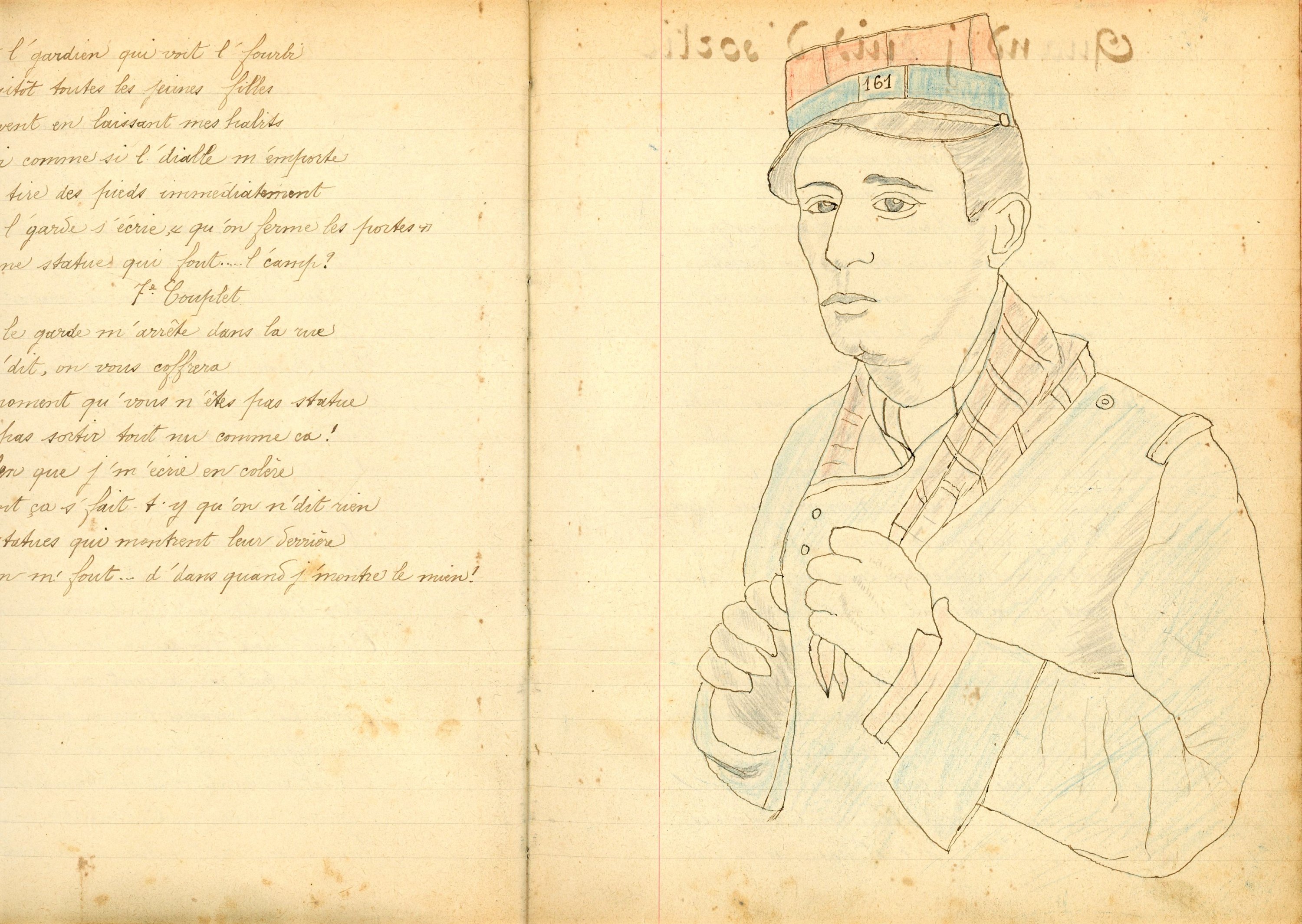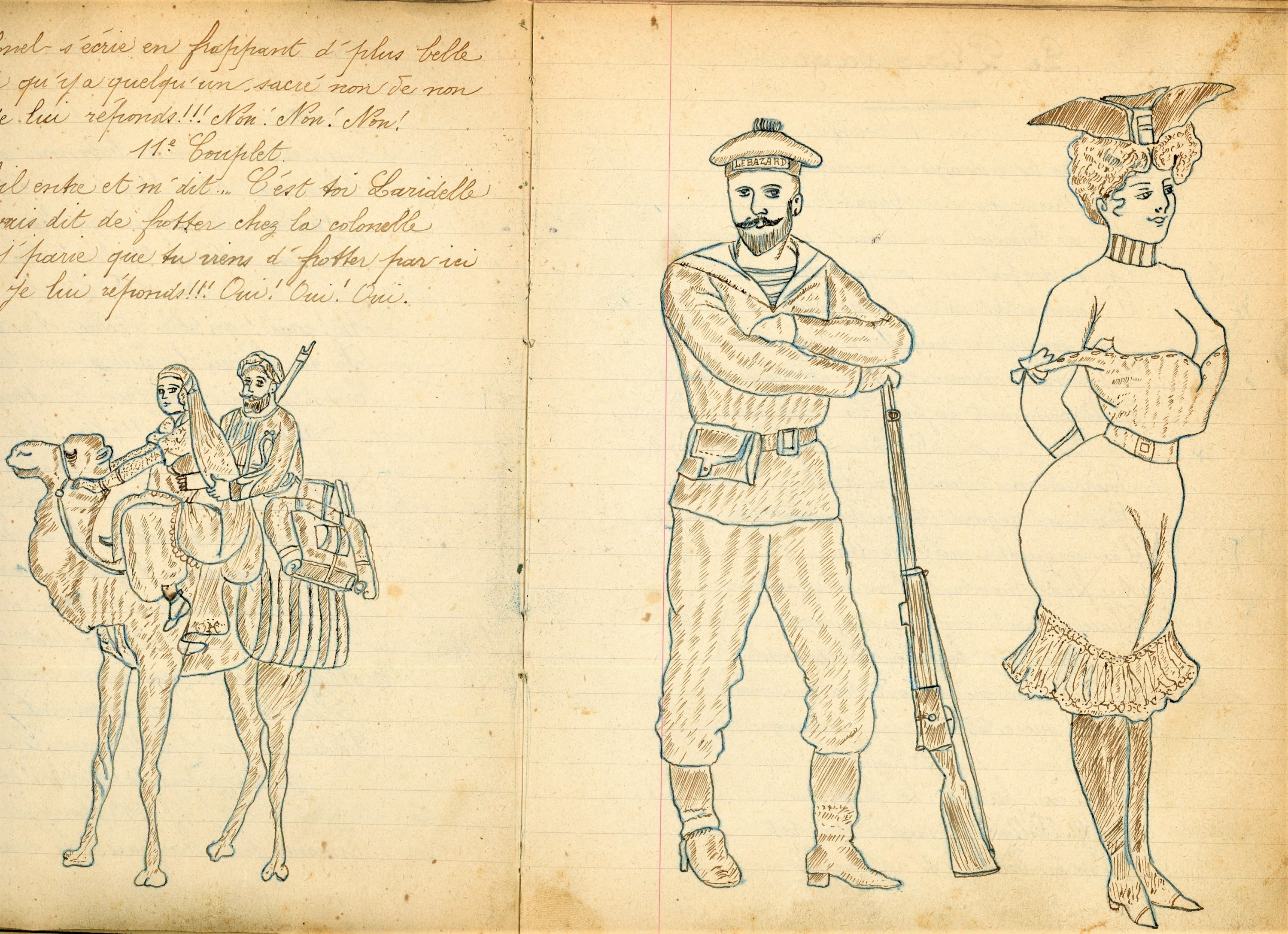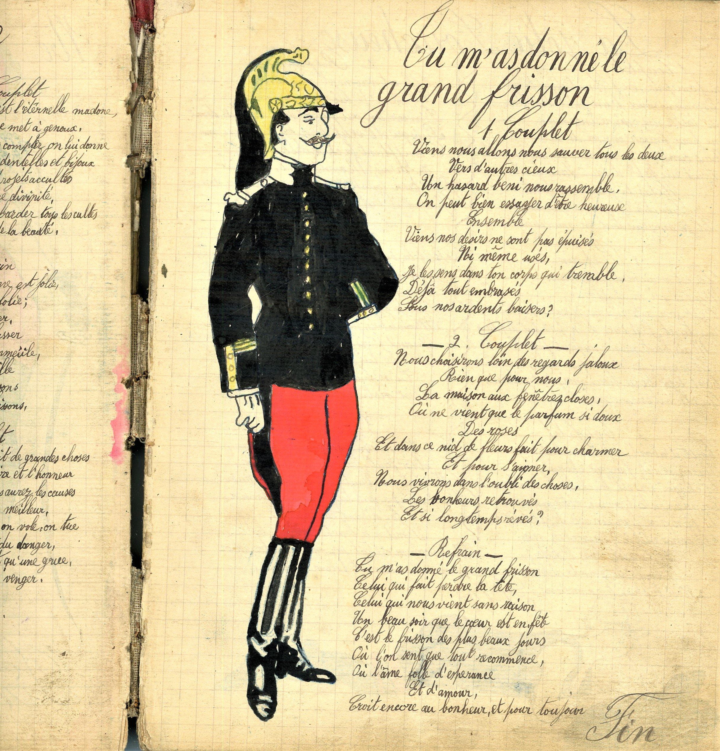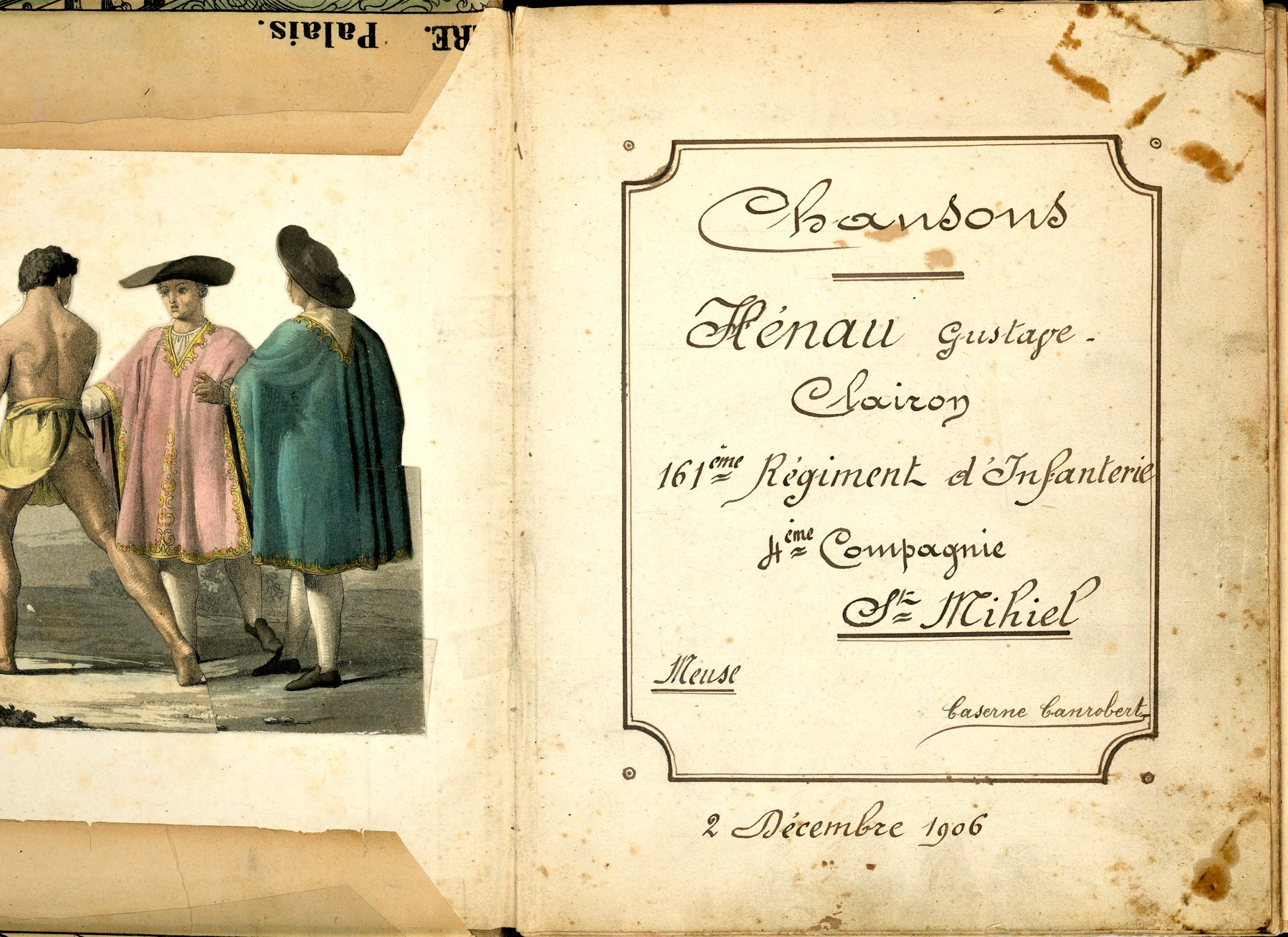 - Recueil manuscrit de chansons populaires recopiées par Gustave Hénau, soldat 2e classe clairon, originaire de la ville de Saint Denis (né le 3 janvier 1883), effectuant son service militaire dans le 161e régiment d'infanterie, en la caserne Canrobert à Saint-Mihiel (Meuse), daté du 2 décembre 1906, cahier rel. in-8, 80 feuillets, couverture à décor de découpis superposés et contrecollés. Illustrations à la plume et au crayon: scènes galantes et coquines, portrait présumé de l'auteur, etc.