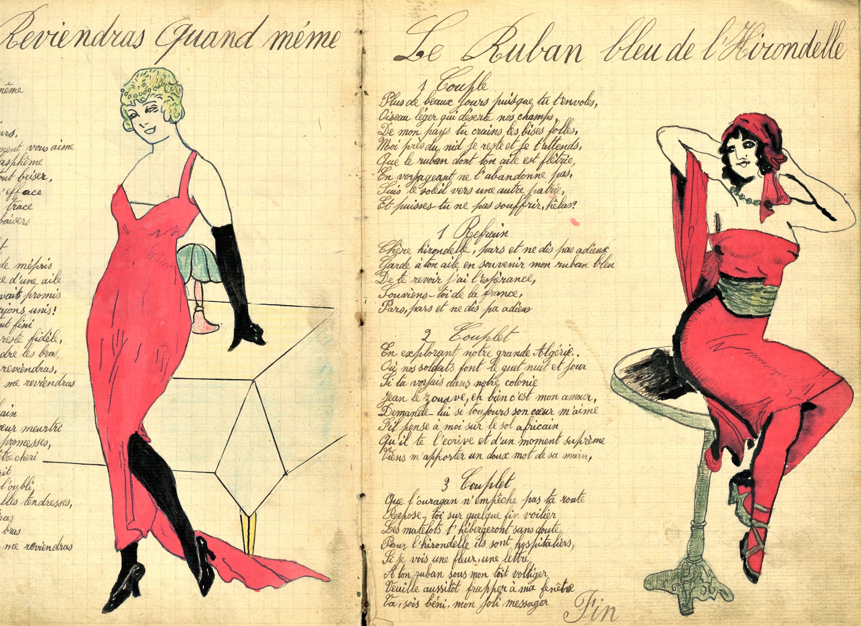 - Recueil manuscrit de chansons populaires des années 1910-1914 recopiées par un membre de la famille Pergue, originaire de Pont de Roide (Doubs), cahier rel. in-8, 89 feuillets, couv. en l'état, quelques pages détachées. Illustrations de dessins au crayon et aquarelle à décor de scènes galantes.