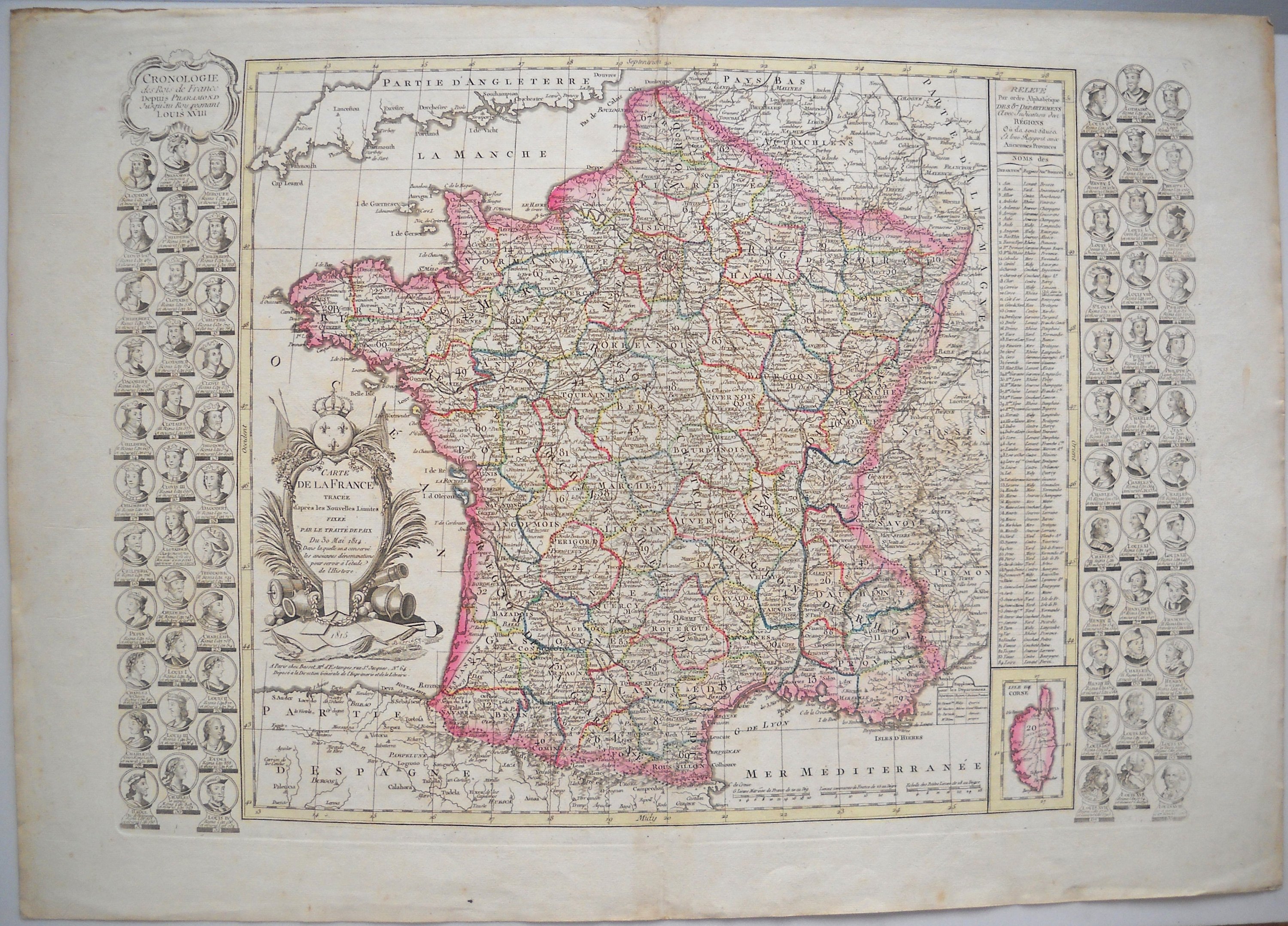 ) dressée par Hérisson, revue, corrigée et augmentée en 1818, à Paris, chez Basset rue Saint Jacques n°64 " - " Carte du royaume de France divisée en 86 départements d'après le traité de paix de Paris, gravée par J.B. Tardieu, 1819, à Paris, chez Jean, rue Saint Jean de Beauvais, n°10 " - " Carte de la France tracée d'après les nouvelles limites fixée par le traité de paix du 30 mai 1814 dans laquelle on a conservé les anciennes dénominations pour servir à l'étude de l'Histoire, 1815, à Paris, chez Basset Md d'estampes, rue St Jacques n°64 ". Env. 57 x 80 cm, bon état (plis, légères mouillures).