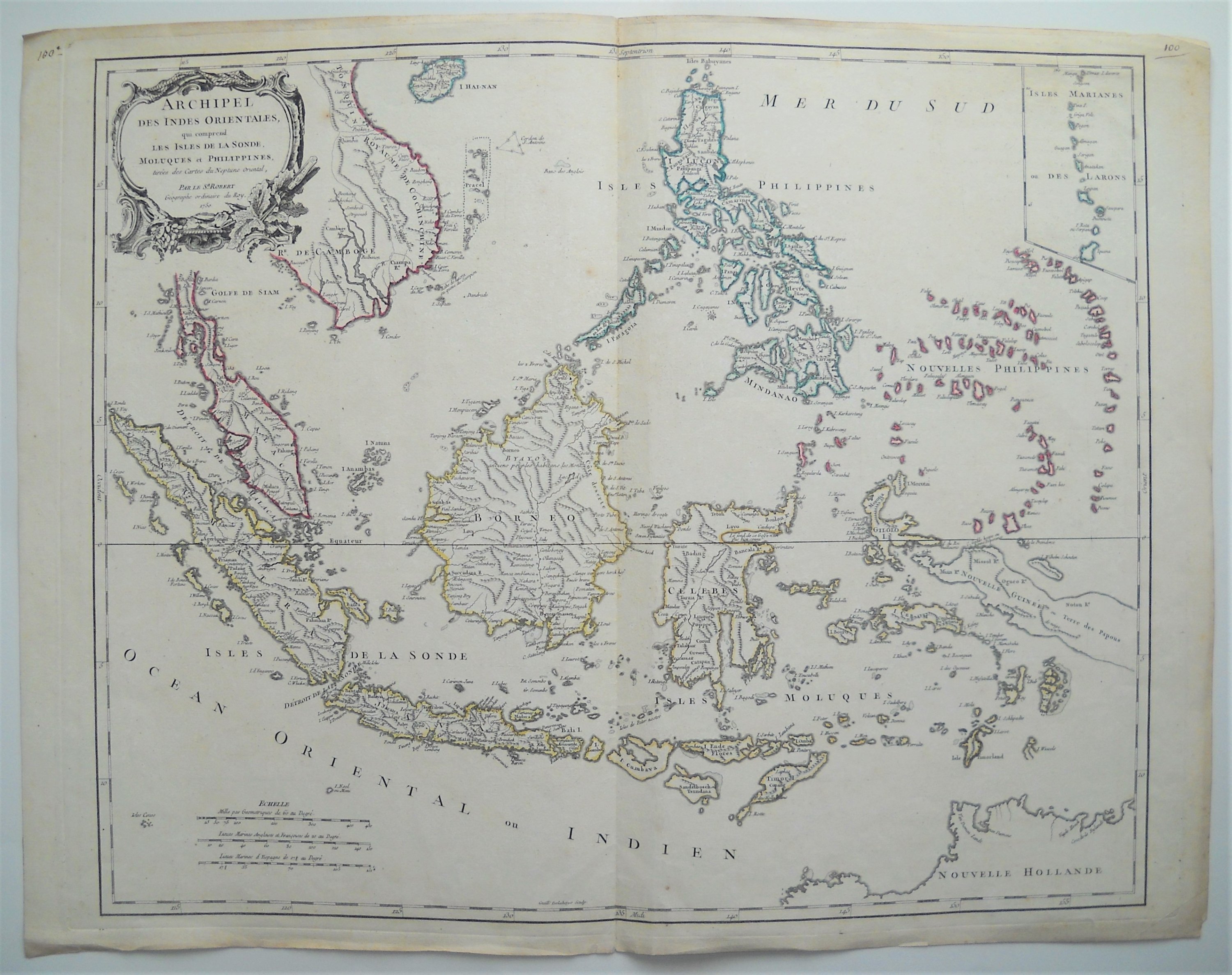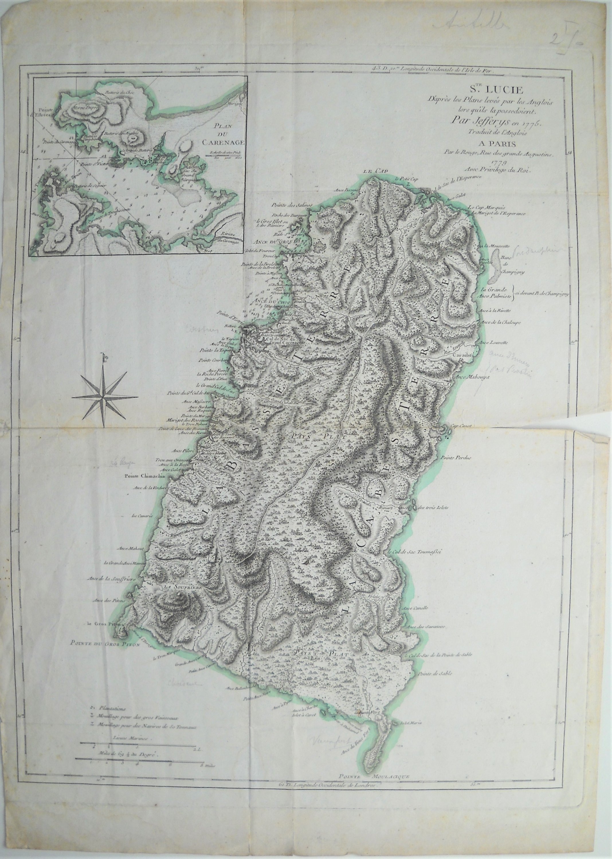 " Archipel des Indes Orientales qui comprend les isles de la Sonde, Moluques et Philippines: tirées des cartes du Neptune oriental / par le Sr. Robert, Ge?ographe ordinaire du Roy ; 1750 / Guill. Delahaye sculp. ", extrait de l'Atlas universel de Robert de Vaugondy, 51,5 x 67 cm ; " Ste Lucie: d'après les plans leve?s par les Anglois lors qu'ils la possedoient. Par Jefferys en 1775 ; traduit de l'Anglois. A Paris, par Le Rouge, rue des Grands Augustins, 1779 ", 70 x 50 cm (plis, légères tâches, déchirure centrale) ; " Carte de l'isle St Domingue dressée pour l'ouvrage de M. L.E. Moreau de St Mery. dessinée par L. Sonis, 1790 " 39 x 66 cm (pli, tâches, petits accdts).