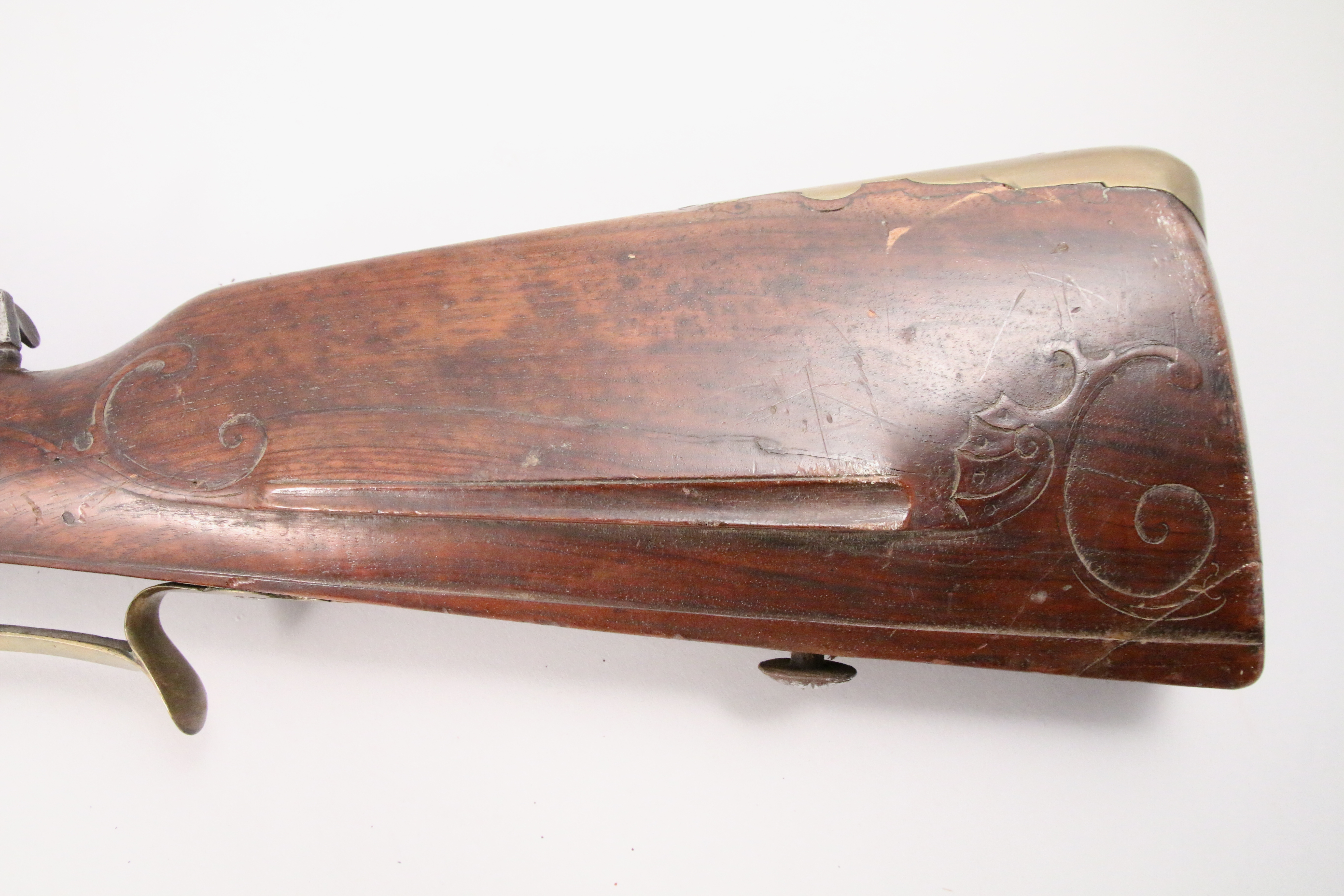 FUSIL DE CHASSE à silex. En noyer, garnitures en fer et laiton. Le canon octogonal. Crosse sculptée d'entrelacs.